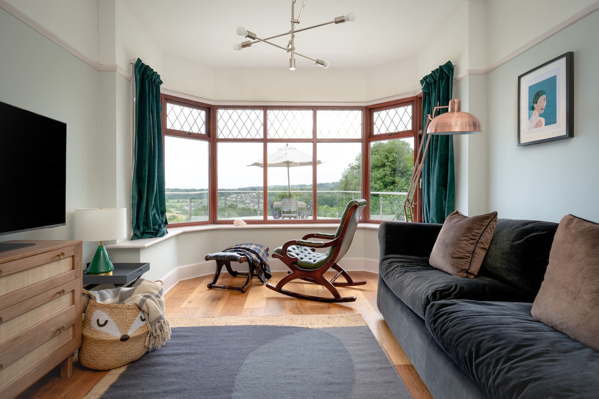 Inspiring and spacious, The Spinney is a year-round gem. With breathtaking views over the sea and the rolling Devon hills, find spaces inside and out to spend quiet time to unwind or gather for food and drinks. Five bedrooms, four bathrooms, and an enviably large private terrace where the vista just gets better and better and with the beach just a short walk away. In cooler months, gather on plush sofas around the fireplace. "We’re sorry, but we’re unable to accept pets or same-sex group bookings at this property." Please note that there is a "Ring" doorbell system at the front of the property, which does record when approaching and accessing the property.The Space