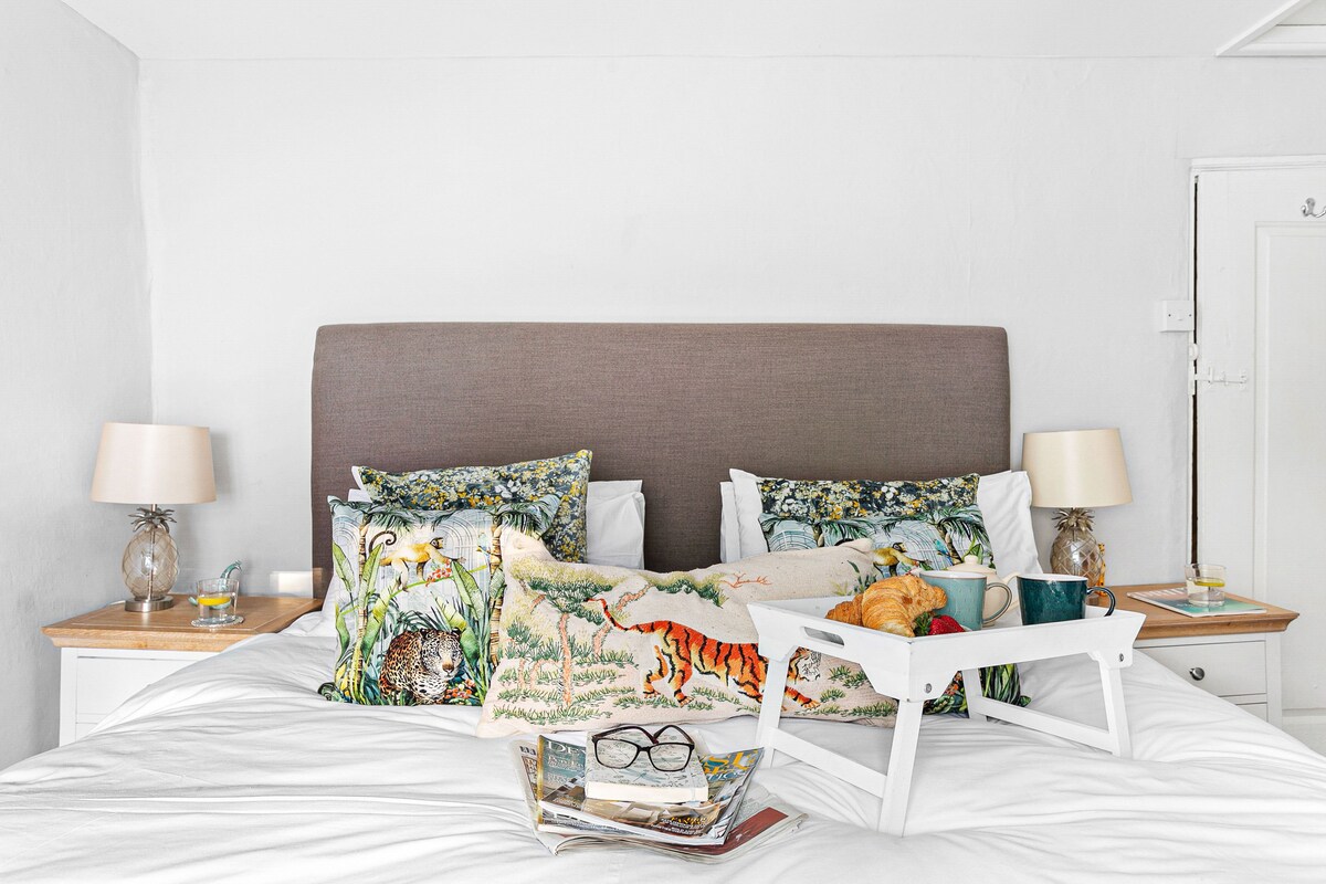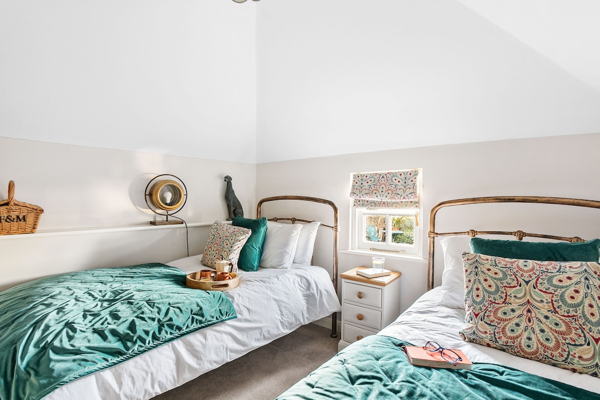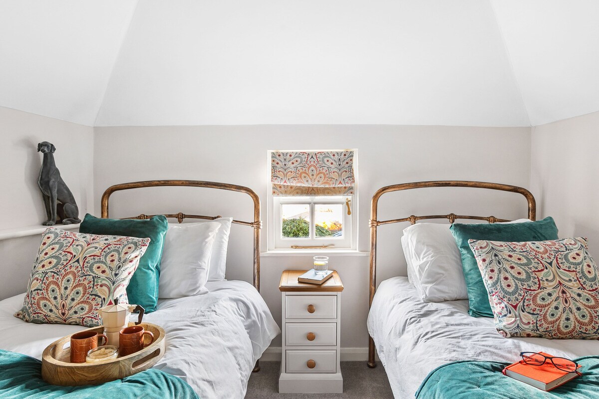 Climb the stairs at the end of the day where you will find a choice of two bedrooms and a family bathroom. The master bedroom has a 6ft super king bed and a large wall-mounted TV. The twin bedroom has two single beds with wrought-iron bed frames, which can be configured as a superking bed, and a TV. The family bathroom includes a bath with an overhead shower.