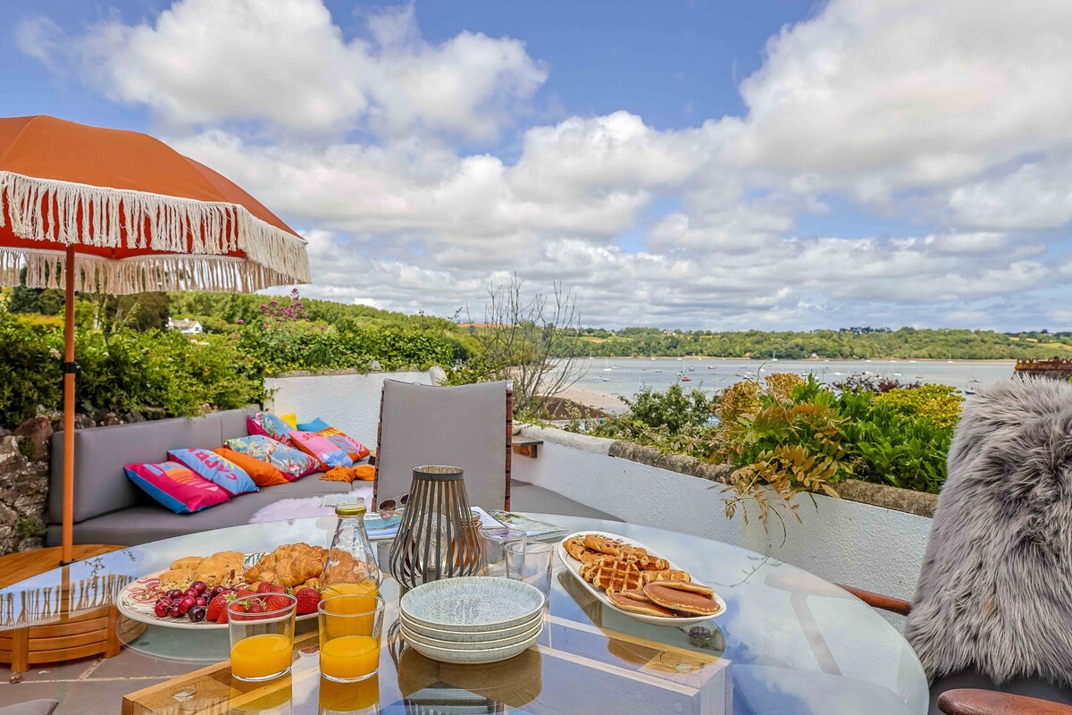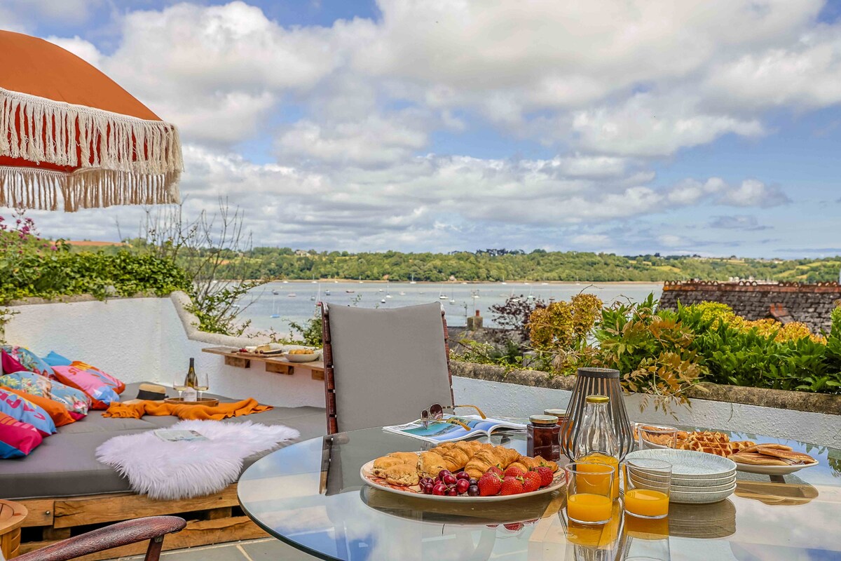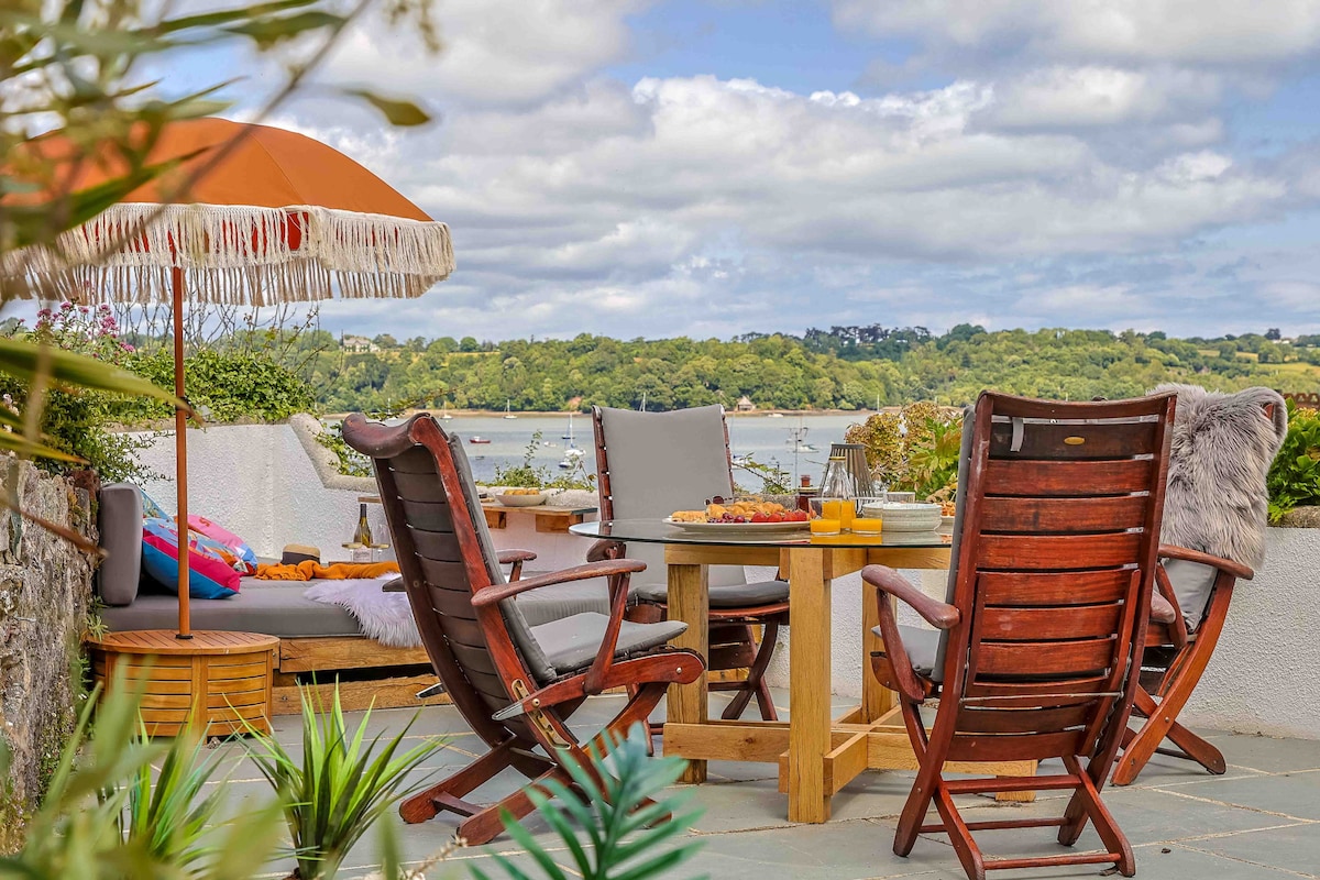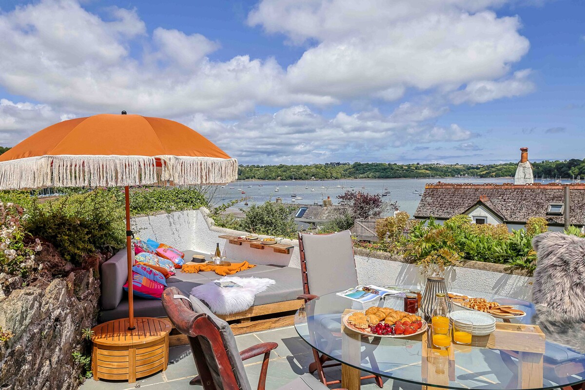 At the back of the cottage is the paved, suntrap, courtyard garden, with an outdoor dining area that looks out over the river. It's the perfect spot for your morning coffee or evening fizz.