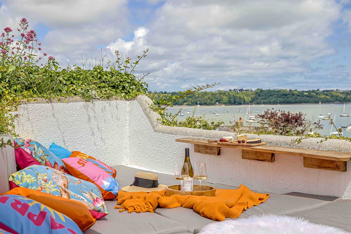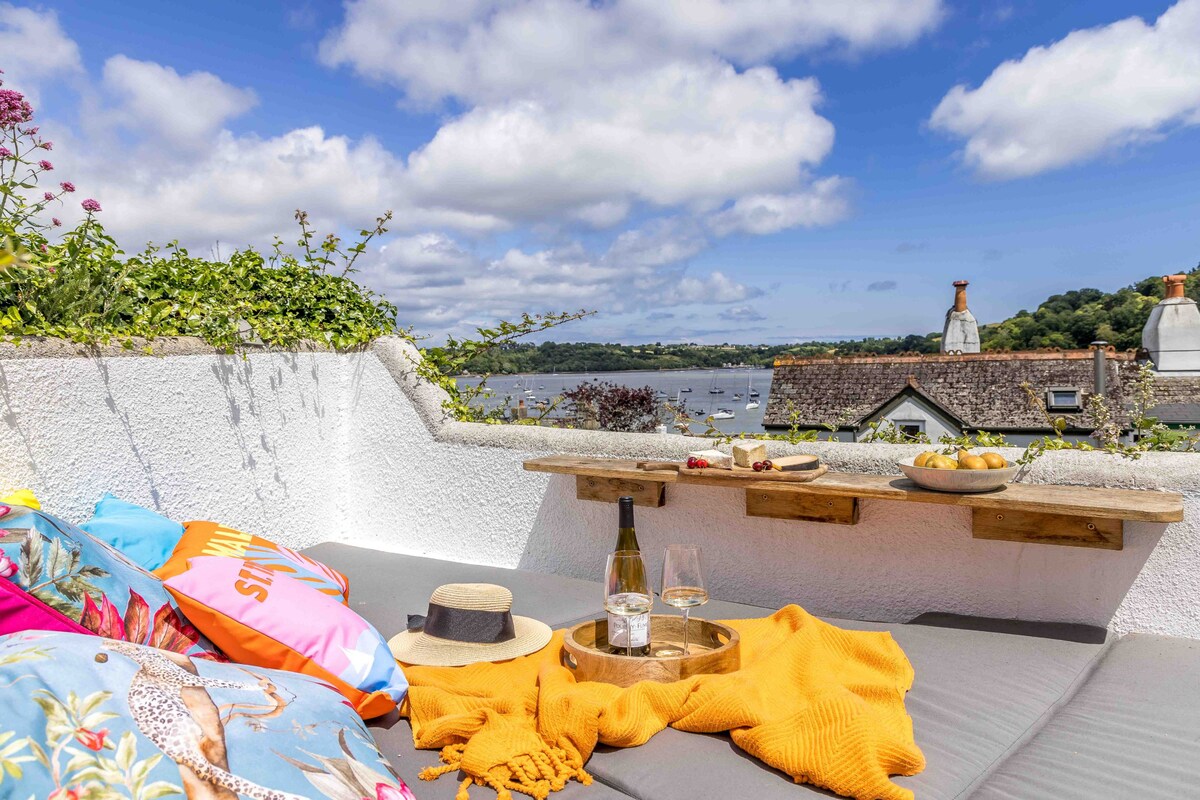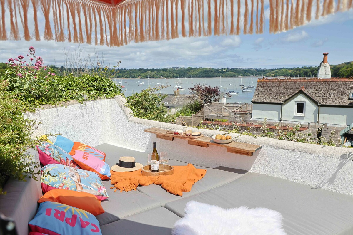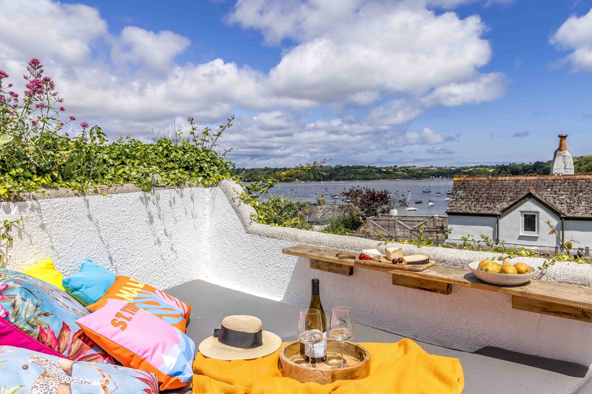 At the back of the cottage is the paved, suntrap, courtyard garden, with an outdoor dining area that looks out over the river. It's the perfect spot for your morning coffee or evening fizz.