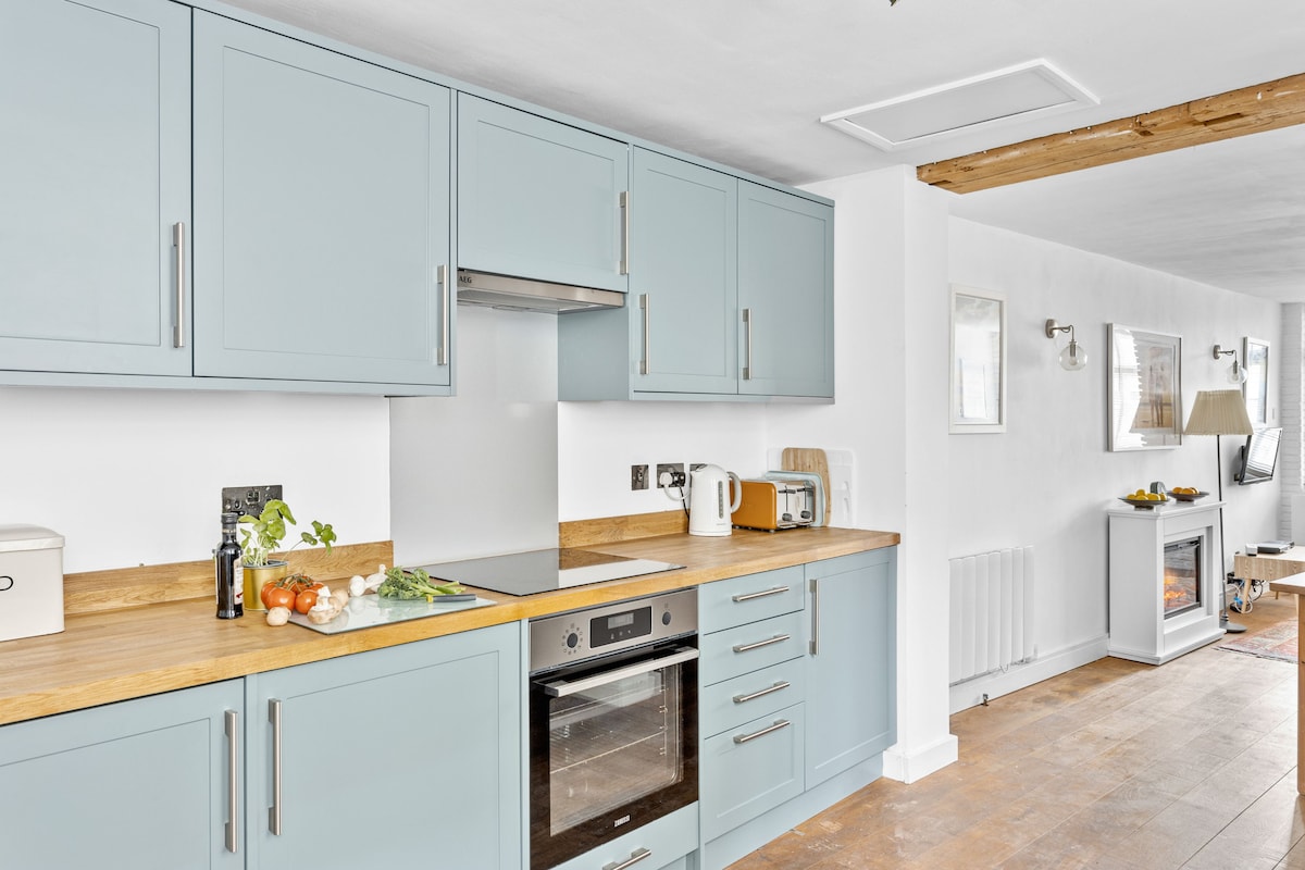 The stable front door open directly into the apartments well equipped kitchen, where meal preparation is a delight to create a memorable meal together. This opens into the living area where you will find a cosy sofa to sit an unwind after your day of exploring the local area catching a film on the Smart TV, or snuggle up with a good book on the large comfy window seat.