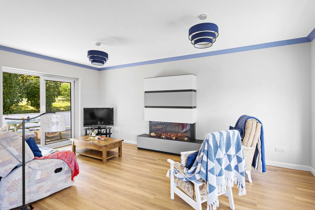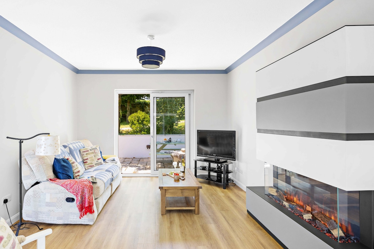 The living space and kitchen area open up to maximise the socialising space. Oak-effect solid flooring and a comfy sofa face the centrepiece wood-effect fire (ideal for cosy nights in the cooler months).