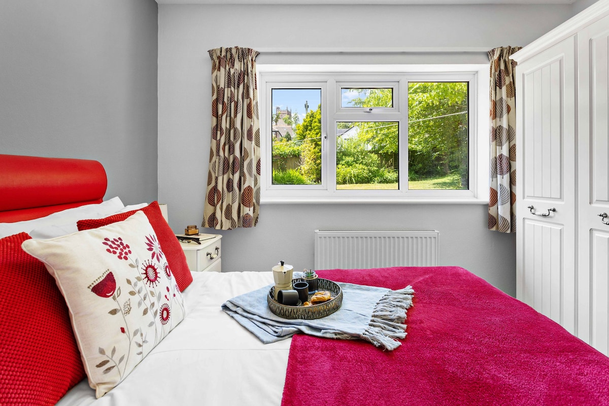 Bedroom one has a king-size bed and bedside tables, with views of the well-tended private garden.