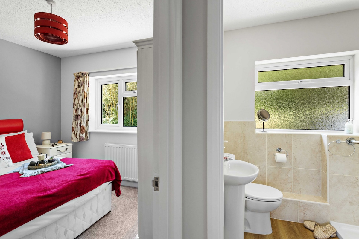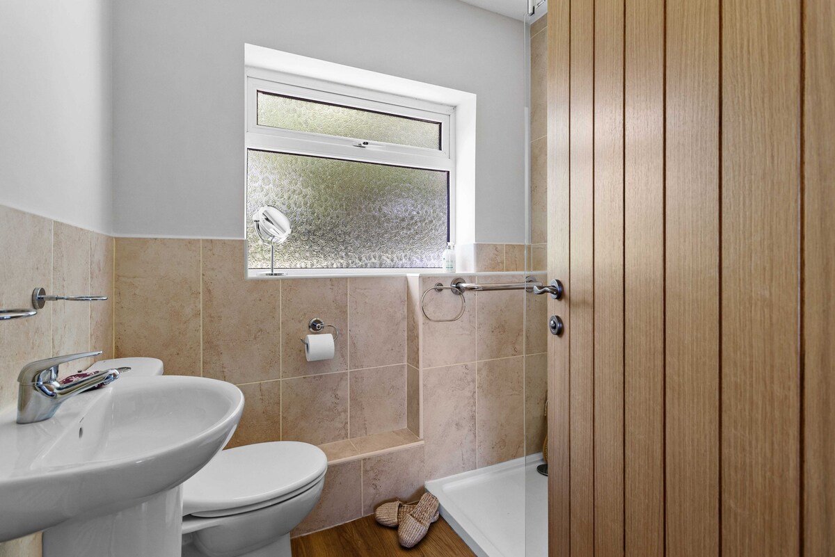 The family bathroom has a large shower, basin, and WC. There’s also a separate WC room with a wash basin.