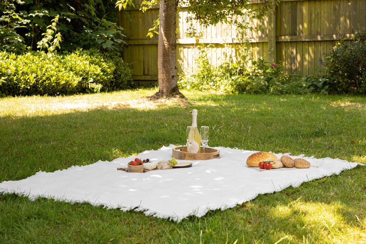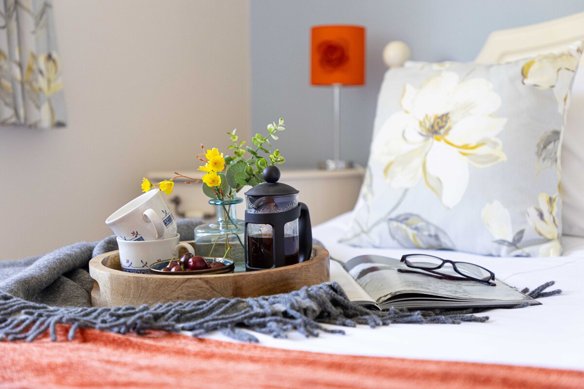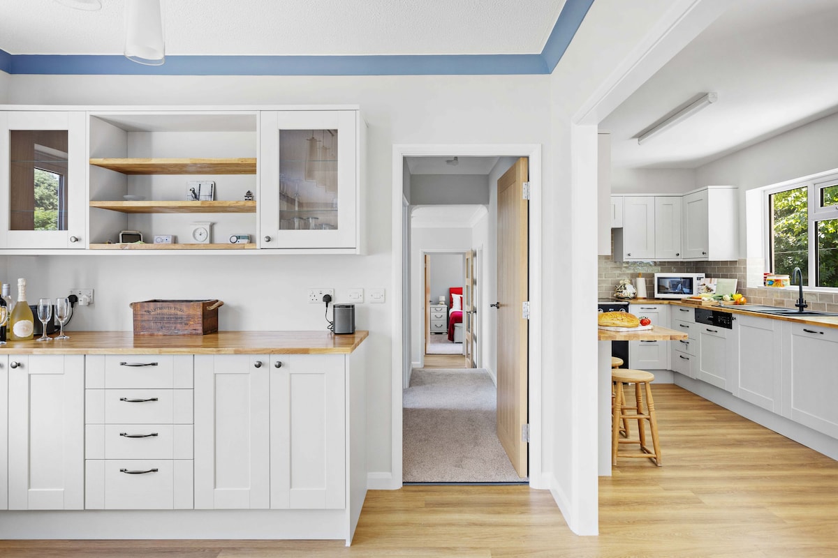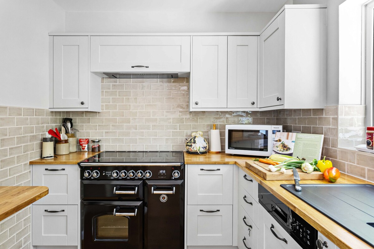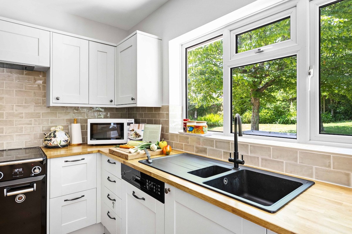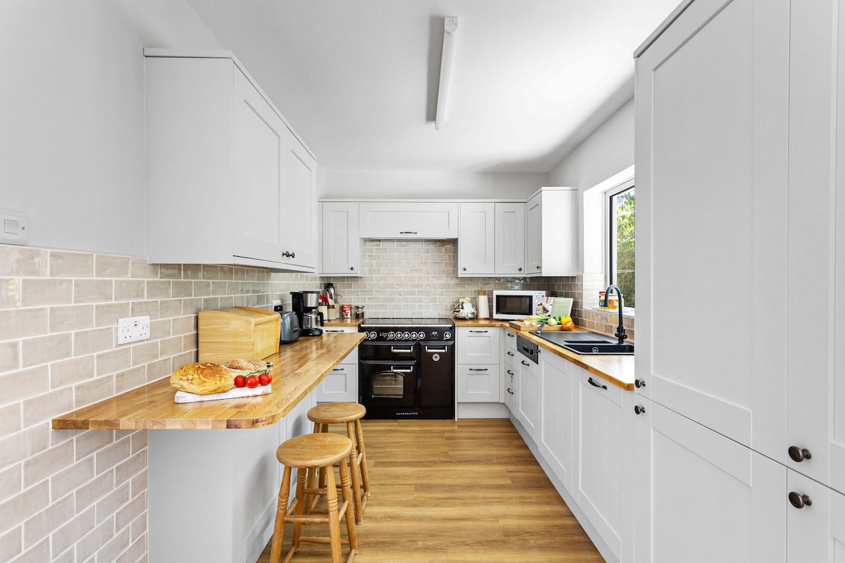 The Seashell-white Shaker-style kitchen includes a brand-new Rangemaster oven and hob, a black quartz sink, and a solid oak worktop; it's also well-equipped with a microwave, toaster, and filter coffee maker. A grinder is supplied for you to freshly-prepare your favourite coffee. There’s a second area adjacent to the living space for preparing drinks and light meals.