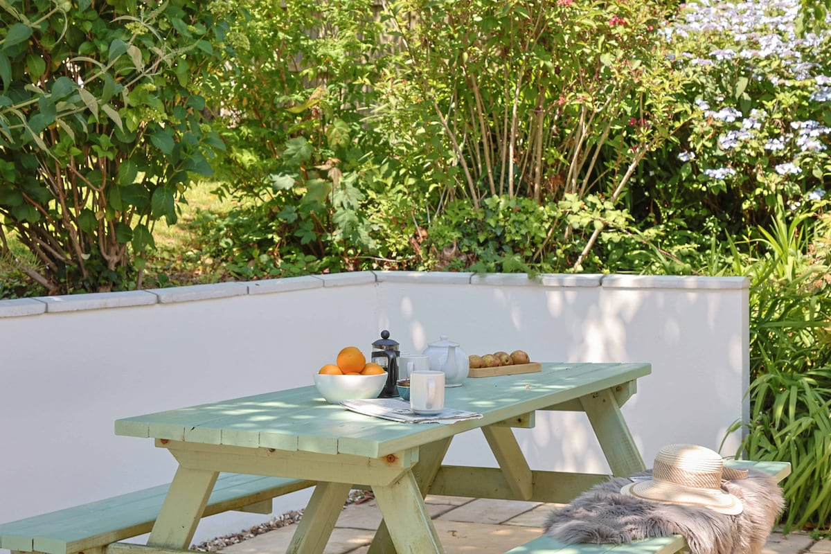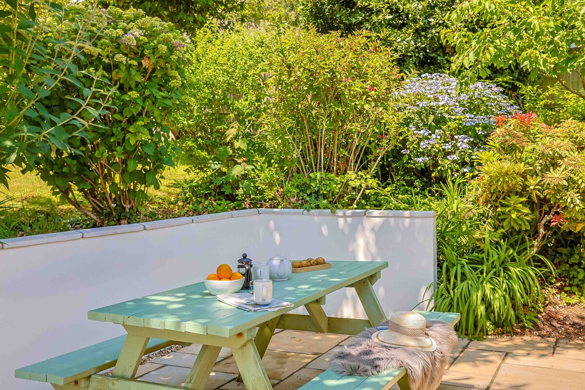From the patio doors of the living space is the paved and walled terrace, with seating for up to six.