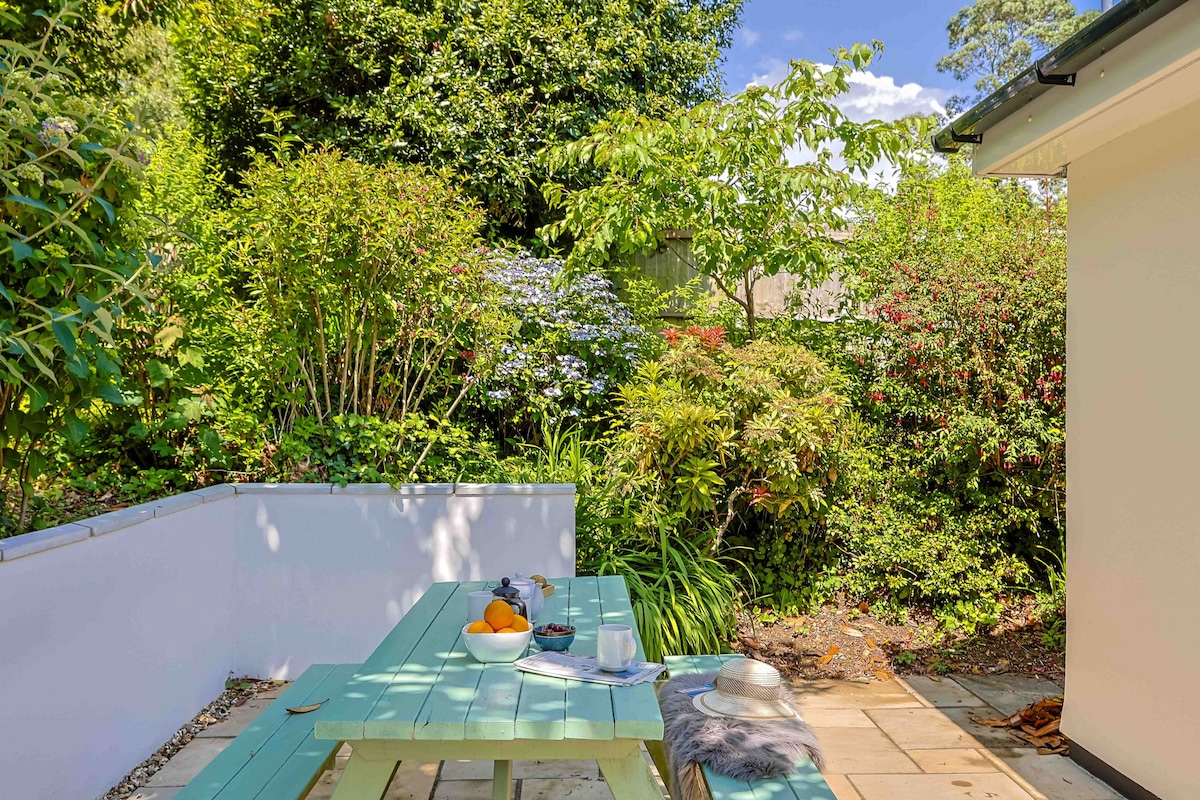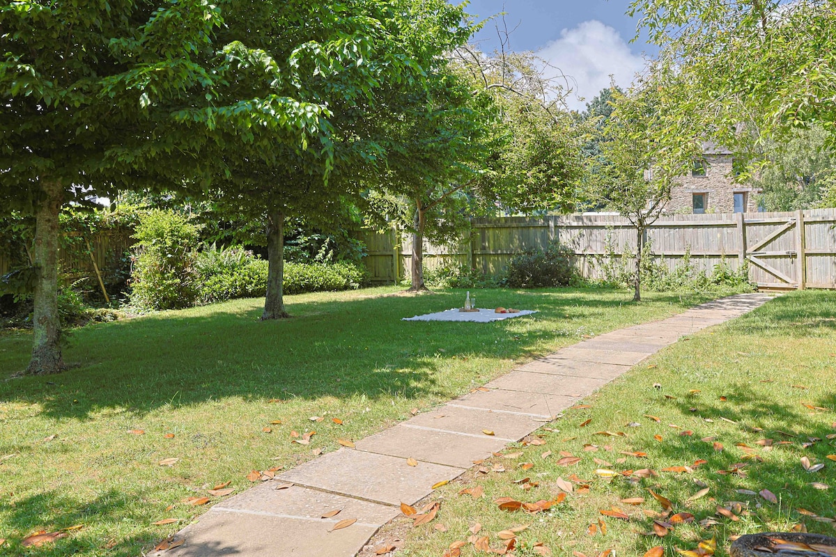 Beyond, the private fenced garden is laid to lawn, with mature trees at the border and apple trees within.