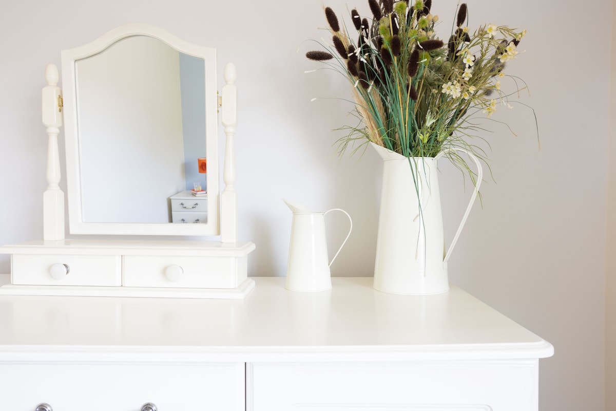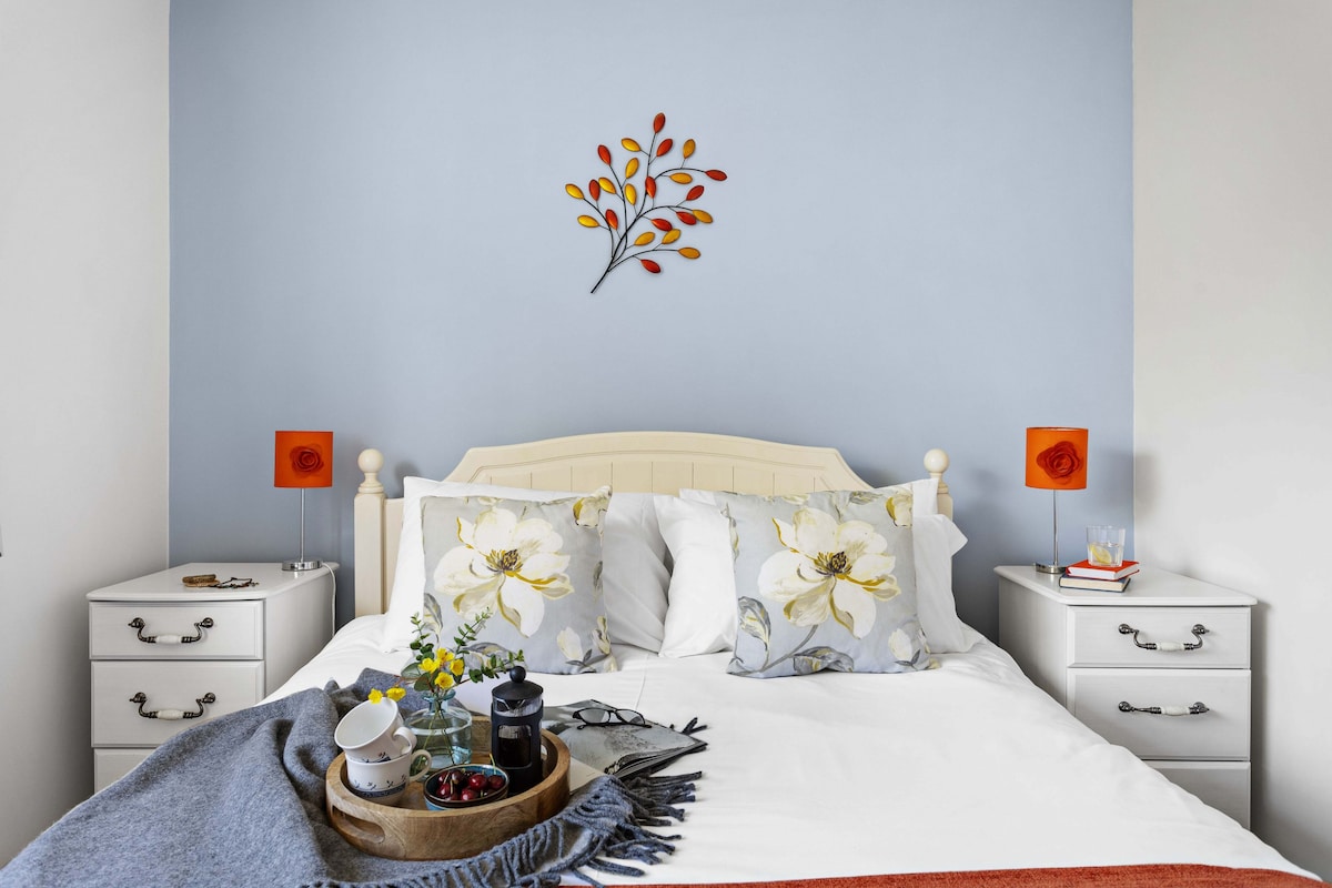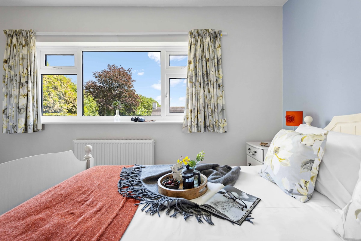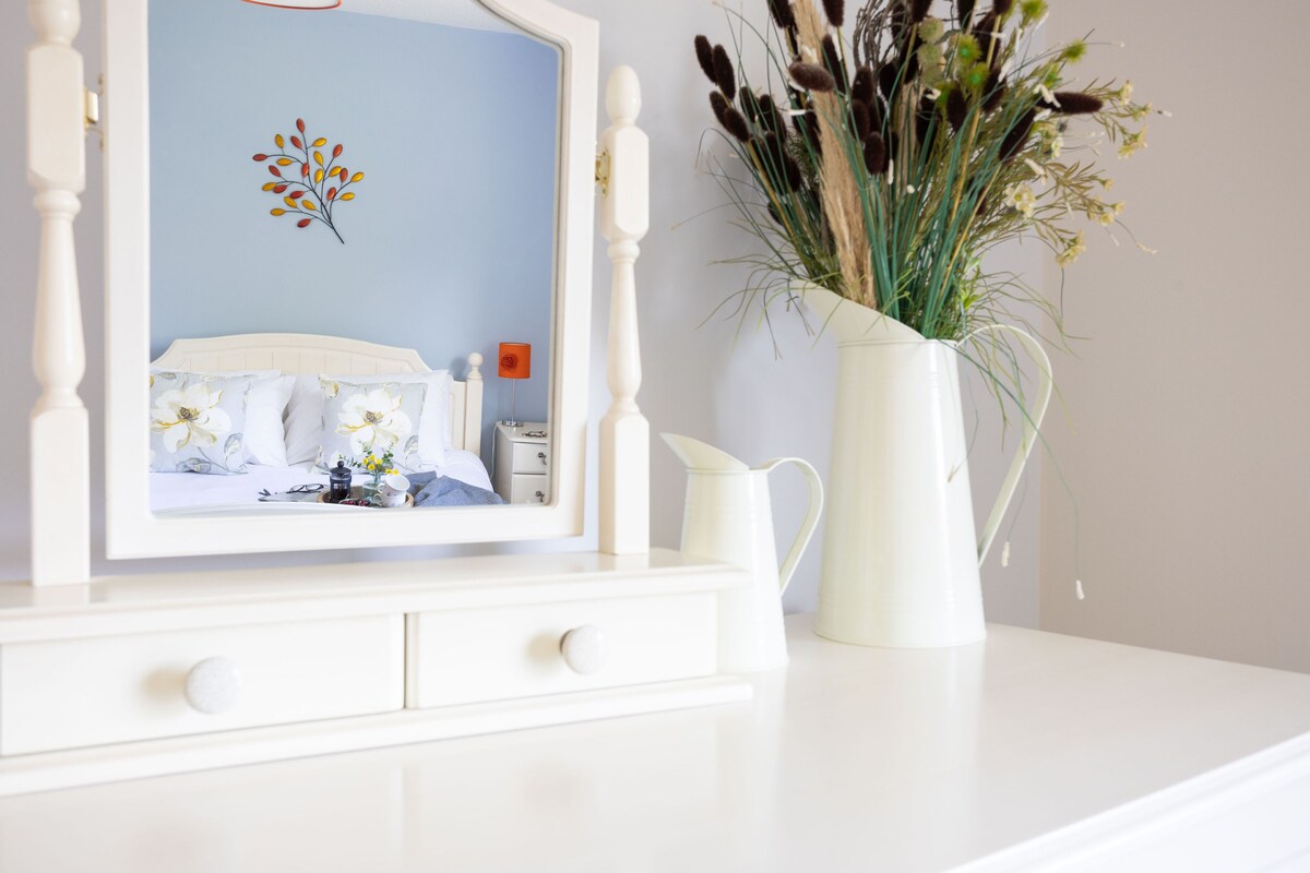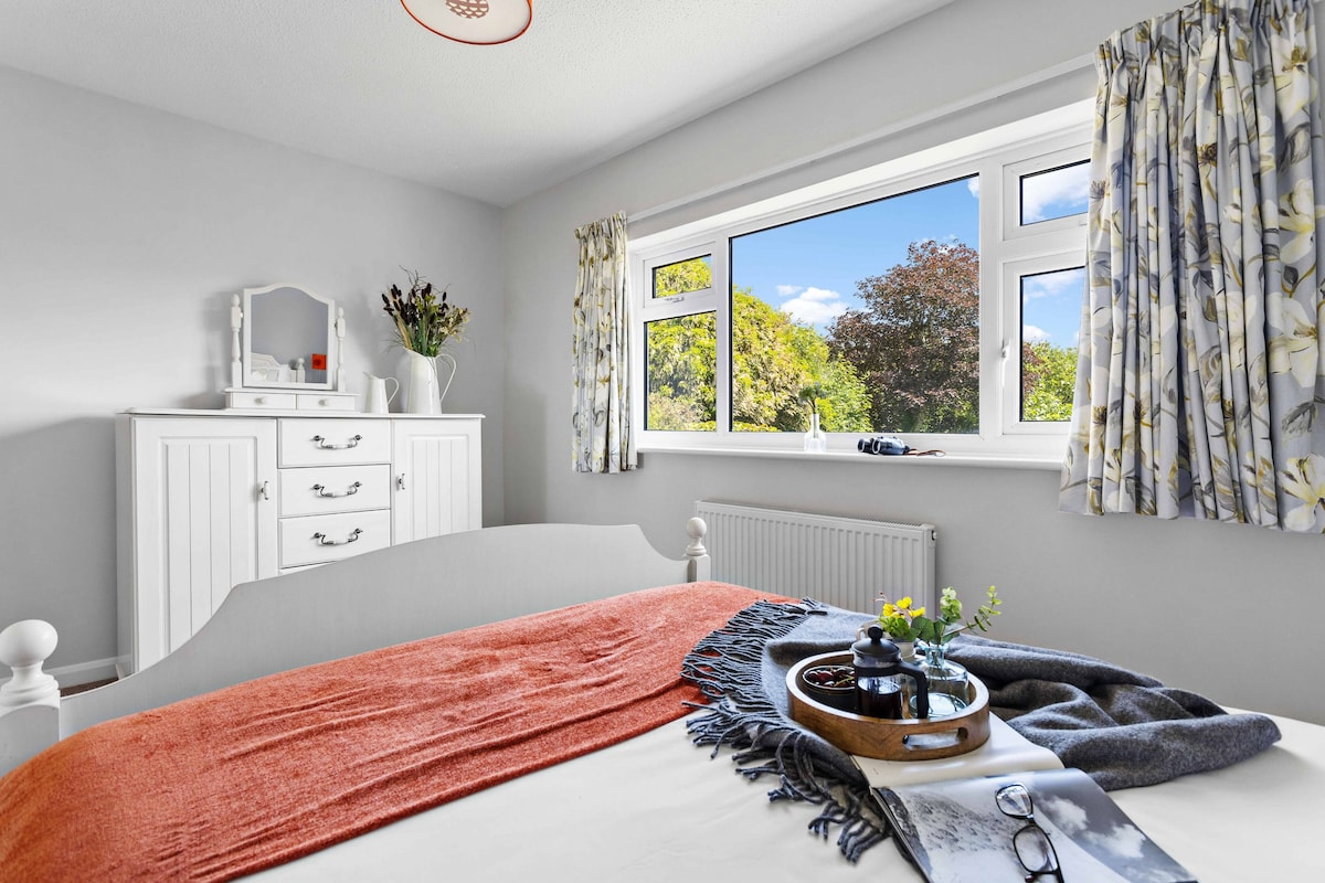 Bedroom two has a double bed with a dressing table, wardrobe, and mirrors and a broad window to take in the view of the boats on the river and the rolling hills across the valley.