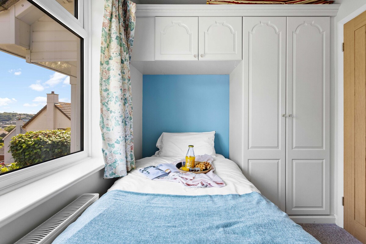 Bedroom three has a single bed with a built-in small wardrobe with overhead storage.
