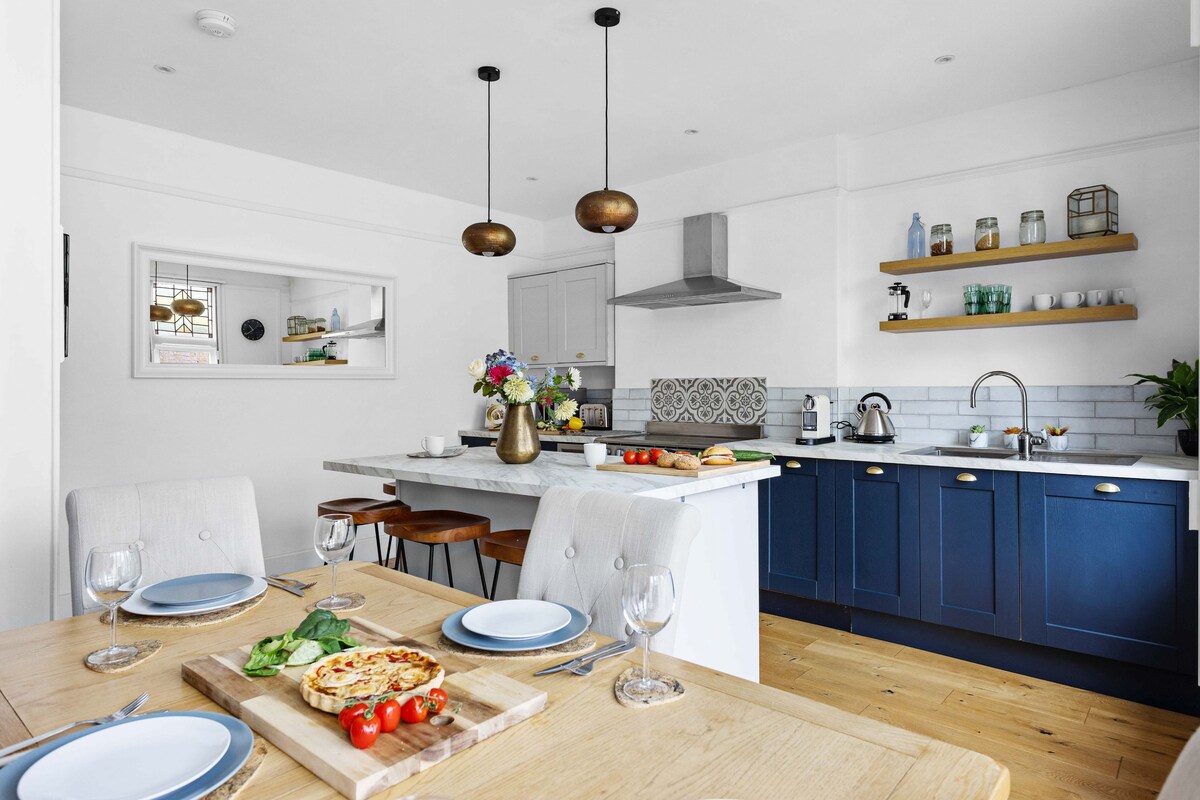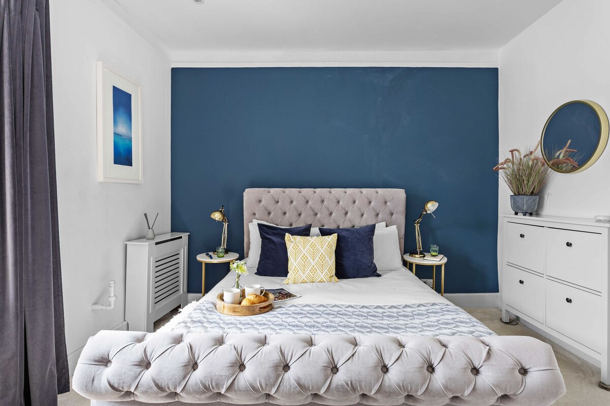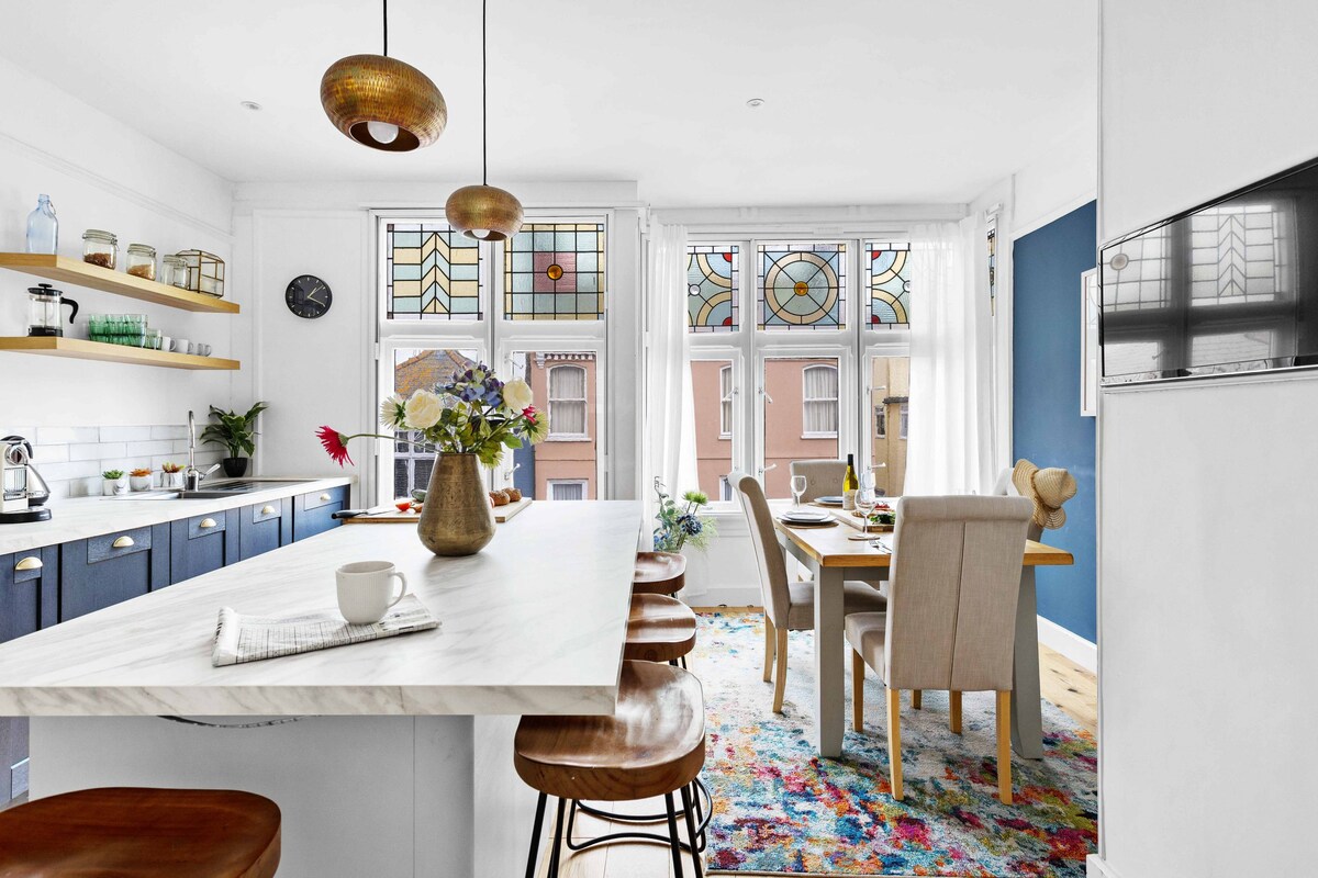 Located on the second floor, the front door opens to the lovely hallway with the combined kitchen/dining room and lounge at the front of the apartment and the bedrooms and bathroom at the rear. The kitchen diner combines the original stain glass windows with modern décor including coloured downlights from the marble effect kitchen island and heated oak floors. The Kitchen is well-equipped with electric range, induction hob, microwave, Nespresso machine (capsules not provided), wall mounted TV and all other kitchen utensils and accessories that one may require to host a dinner party or equally a quiet night in.The light bright lounge consists of a large 48 inch Smart TV, large corner sofa and wing back chair that provides ample seating to cosy into for a movie night. A NOW TV Movies and Entertainment package is included with the flat.