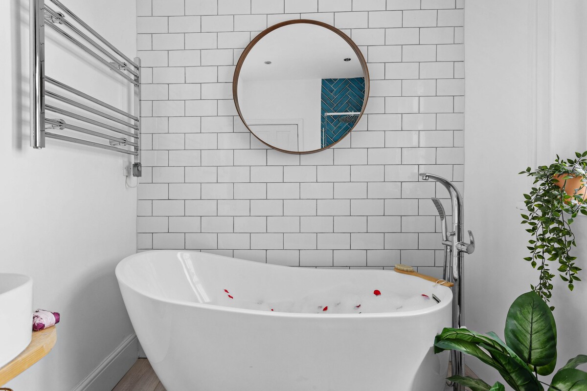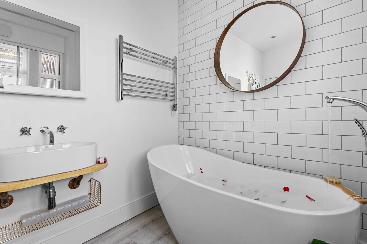 The bathroom is finished to a very high standard with freestanding bath, heated towel rail and separate shower with oversized rain forest shower head. There is a separate toilet located further down the main hall.