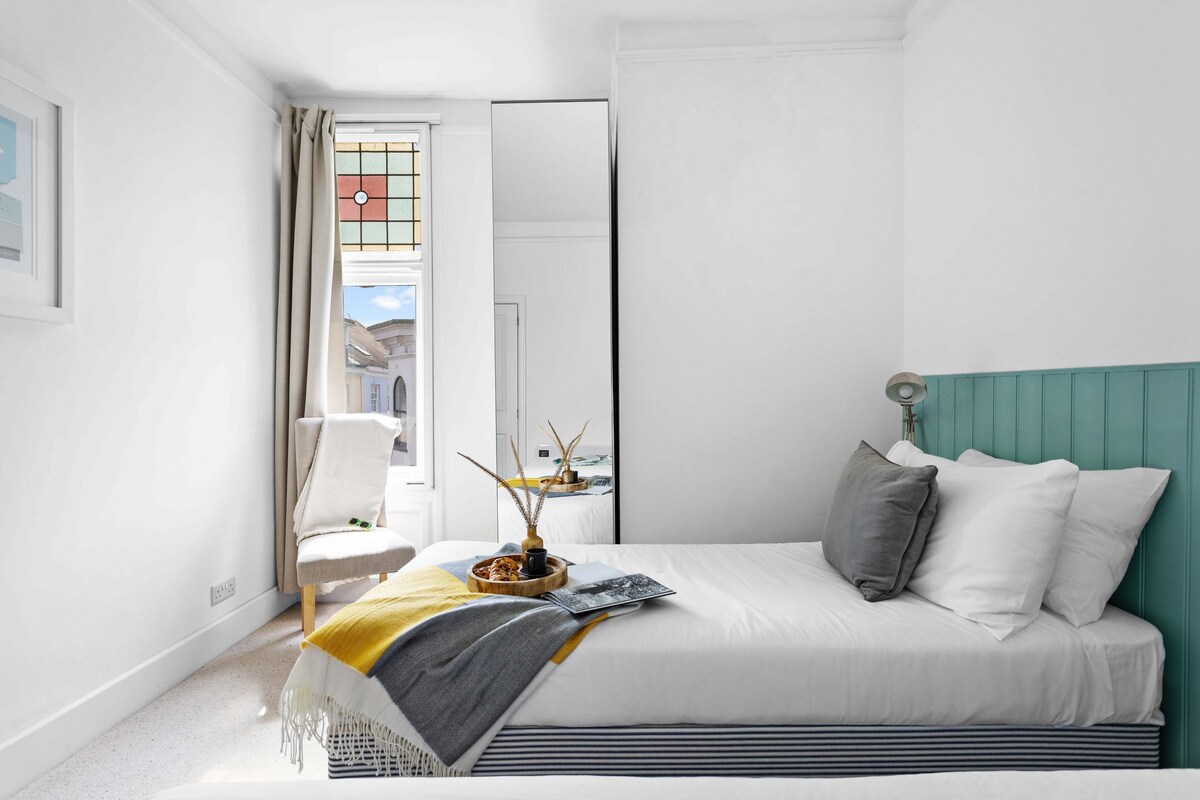 Spectacular flat in the heart of Dartmouth. It couldn’t be better situated for exploring! Across the street is a Coop, and down the street a Boots for any essentials. You enter the flat via a lockbox, which is convenient. The second floor flat is on a corner and affords lots of fresh air from all of its windows. There is noise from people but little from traffic or anything obtrusive. With windows shut, it’s very quiet. The room darkening shades are great! Notes mention the bells but we were disappointed to barely hear them, so anyone concerned by this might not need to worry very much about them. (We enjoyed a lively and engaging Easter service around the corner at St Saviour’s and highly recommend their services!) The flat has a fabulous deep tub and rain shower making bathing blissful after a day in the sun. The beds are comfortable and the pillows and indeed the whole flat is brand new and nicely decorated. The kitchen is very well stocked with dishes, pots and pans, utensils and appliances. It was easy to cook meals on the induction hob, and with ample counter space. We would definitely book again if we are fortunate enough to return to Dartmouth!