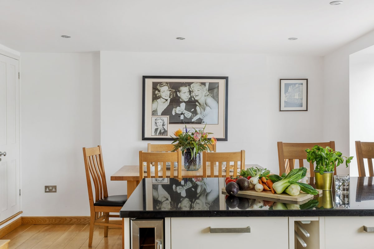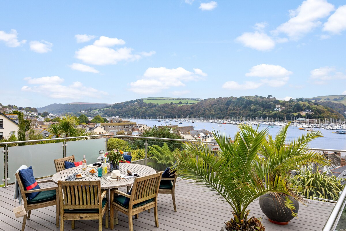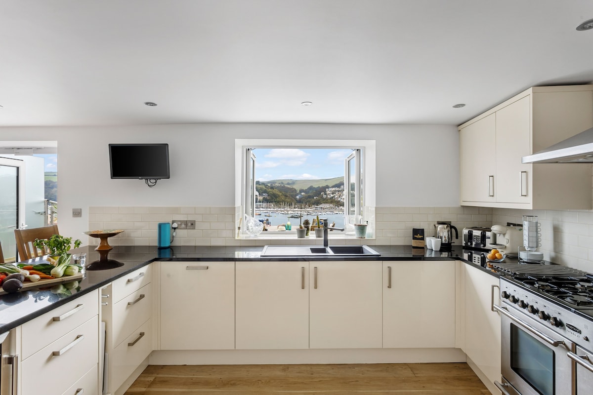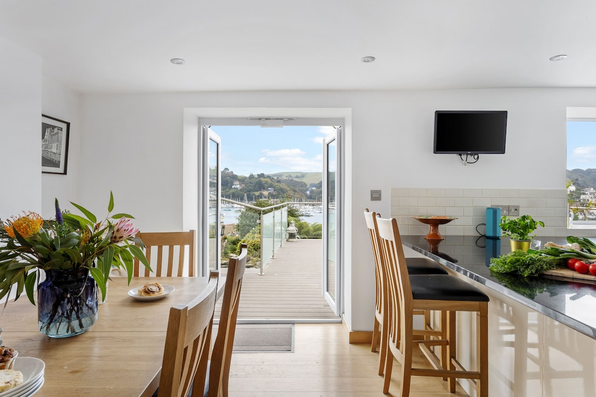 Downstairs again to the ground floor where you will find the beautifully modern open plan kitchen diner, with oak floors, granite worktops and high gloss units. The kitchen is well equipped with double electric oven with gas hob, microwave, dishwasher, fridge and radio/ipod dock. The dining table comfortably seats 6 guests. Patio doors that access the decked terrace provide loads of natural light and again views over the river towards Kingswear.