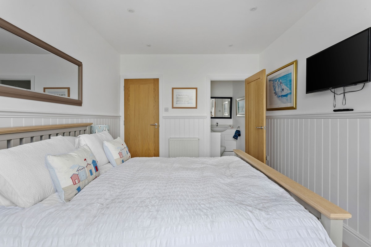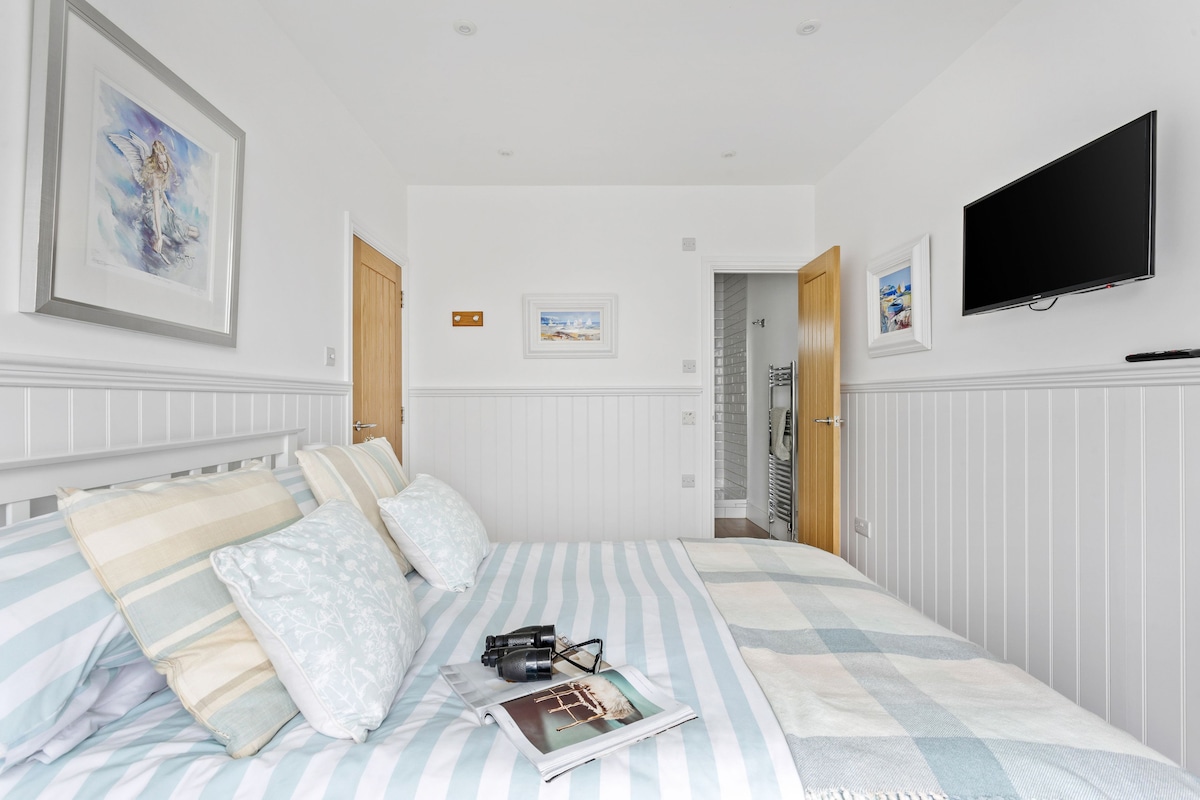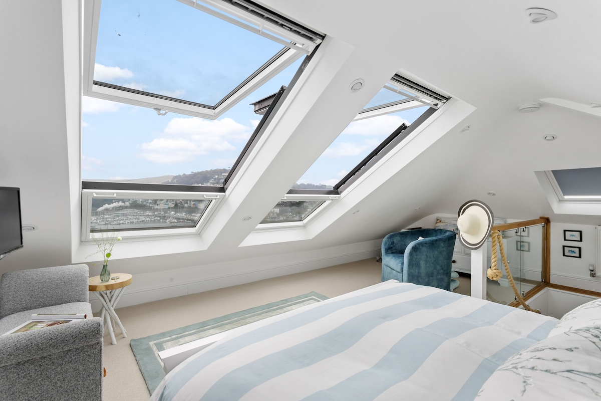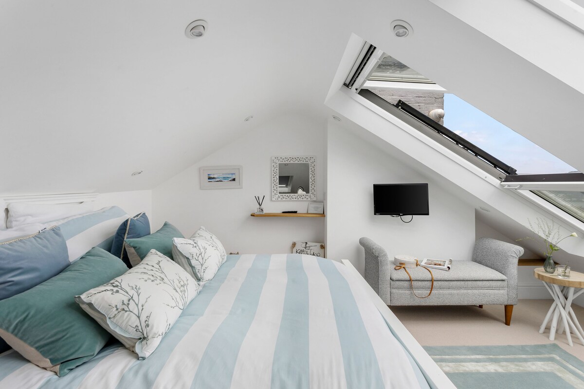 Upstairs to the brand new bedroom set in the eves of the house, with twin velux balcony systems to make the most of the views. The bedroom has a kingsize bed and built in storage as well as wall mounted TV.
