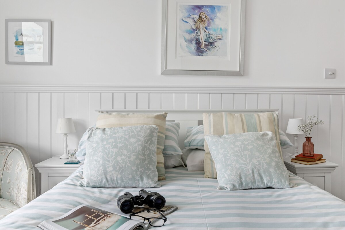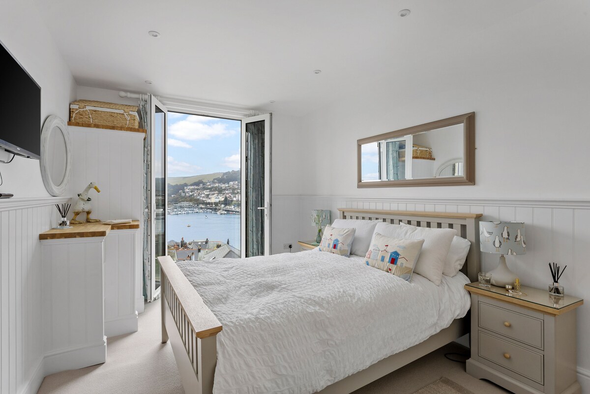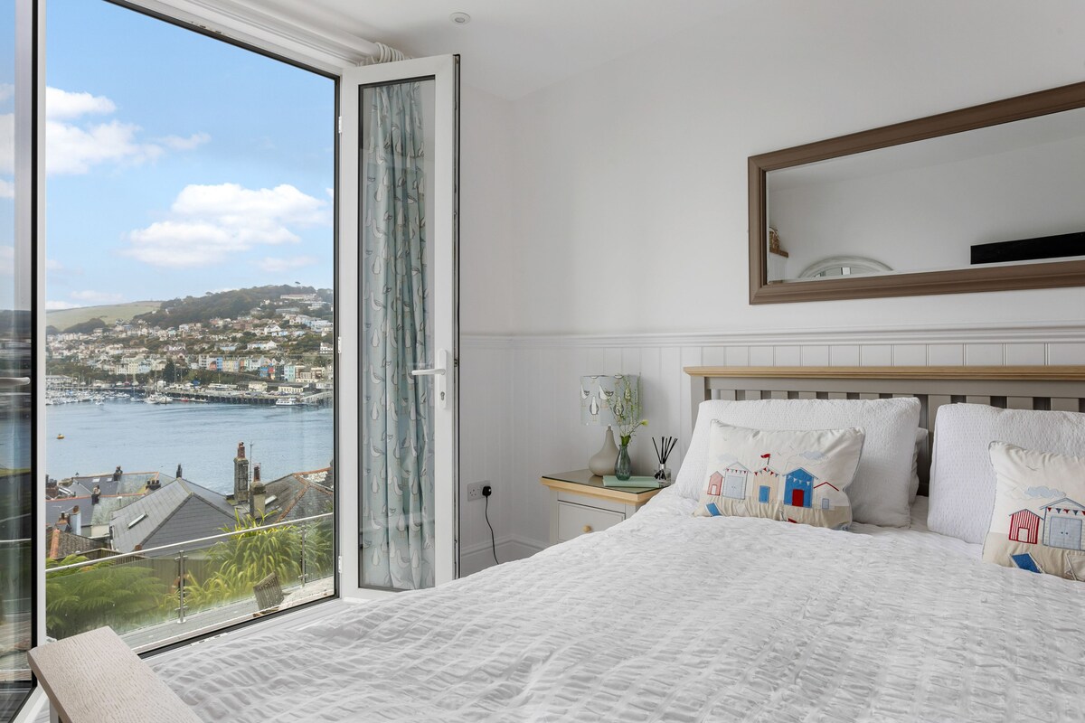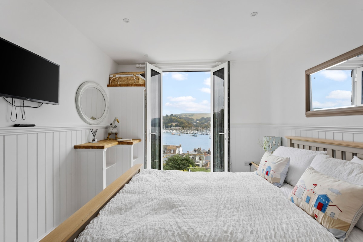 Upstairs to the brand new bedroom set in the eves of the house, with twin velux balcony systems to make the most of the views. The bedroom has a kingsize bed and built in storage as well as wall mounted TV.
