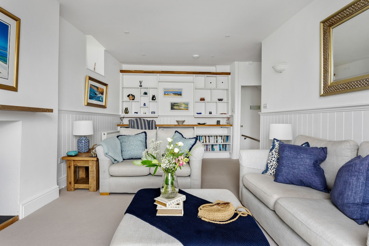 Downstairs to the first floor where you will find the living room. The living space is tastefully furnished with 2 sofas, TV, DVD and effect fireplace. There are plenty of books and DVDs available to guests on the full wall storage display at the rear .