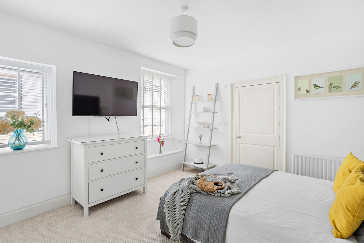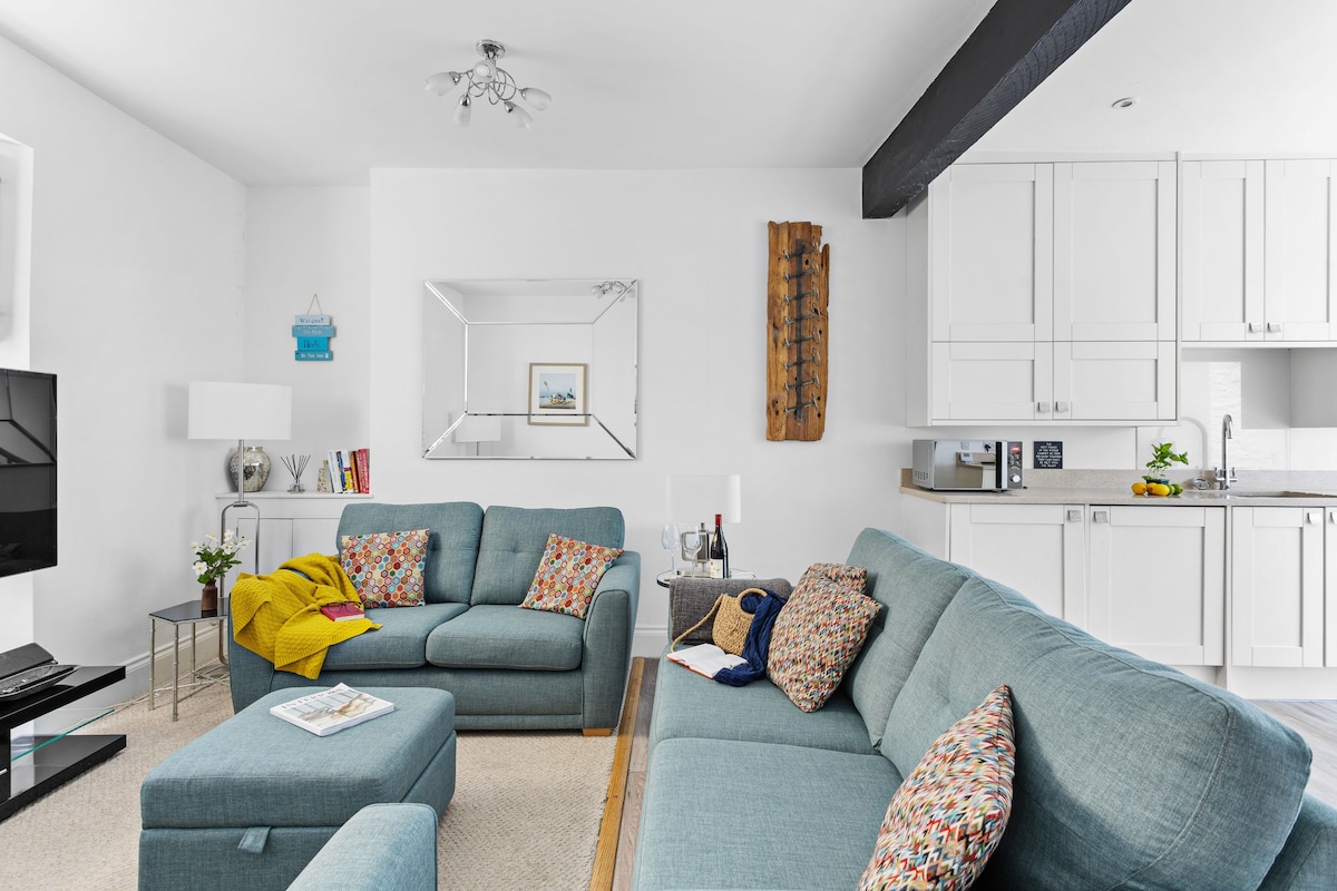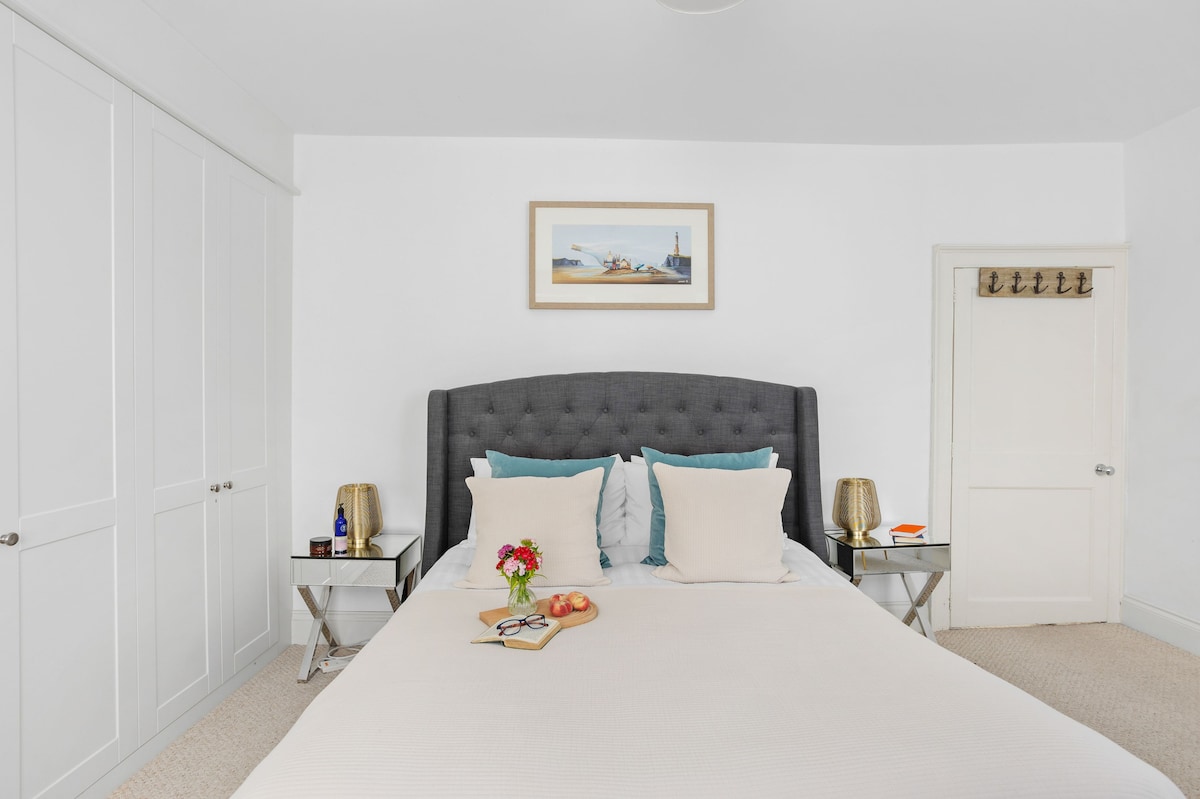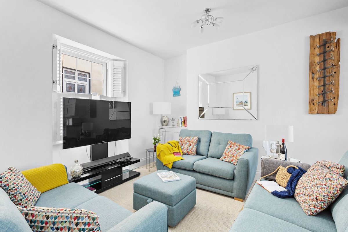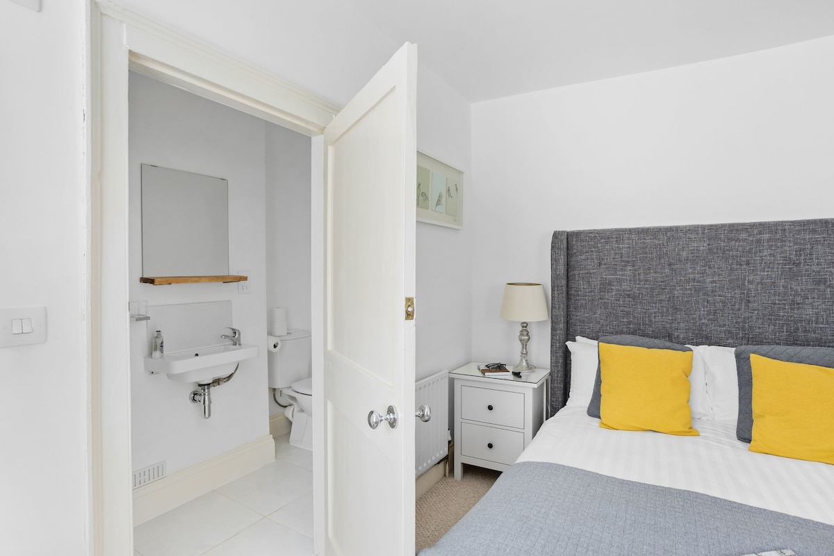 The front door opens from Clarence Hill into the open-plan living room. To the front of the cottage is the lounge furnished with sofa and armchairs, large TV, and side tables. The kitchen is very well-equipped for a self-catering holiday and has cream units with granite tops, housing the dishwasher, fridge and freezer, electric oven and hob, Nespresso machine (please bring pods). The dining area has a high glass ceiling flooding the room with light, wooden dining table and upholstered chairs for 6. Off the dining room is a small courtyard with a cupboard housing the washer/dryer and extra fridge and freezer space.Stairs lead up to the first floor with the first of the bedrooms, this one has an upholstered kingsize bed, plenty of storage and large TV. Also, on this floor is the large family bathroom with corner bath, separate shower, basin and toilet. On the second floor there are two bedrooms both with upholstered double beds and plenty of storage. One of them has an en suite shower, toilet and basin and television.