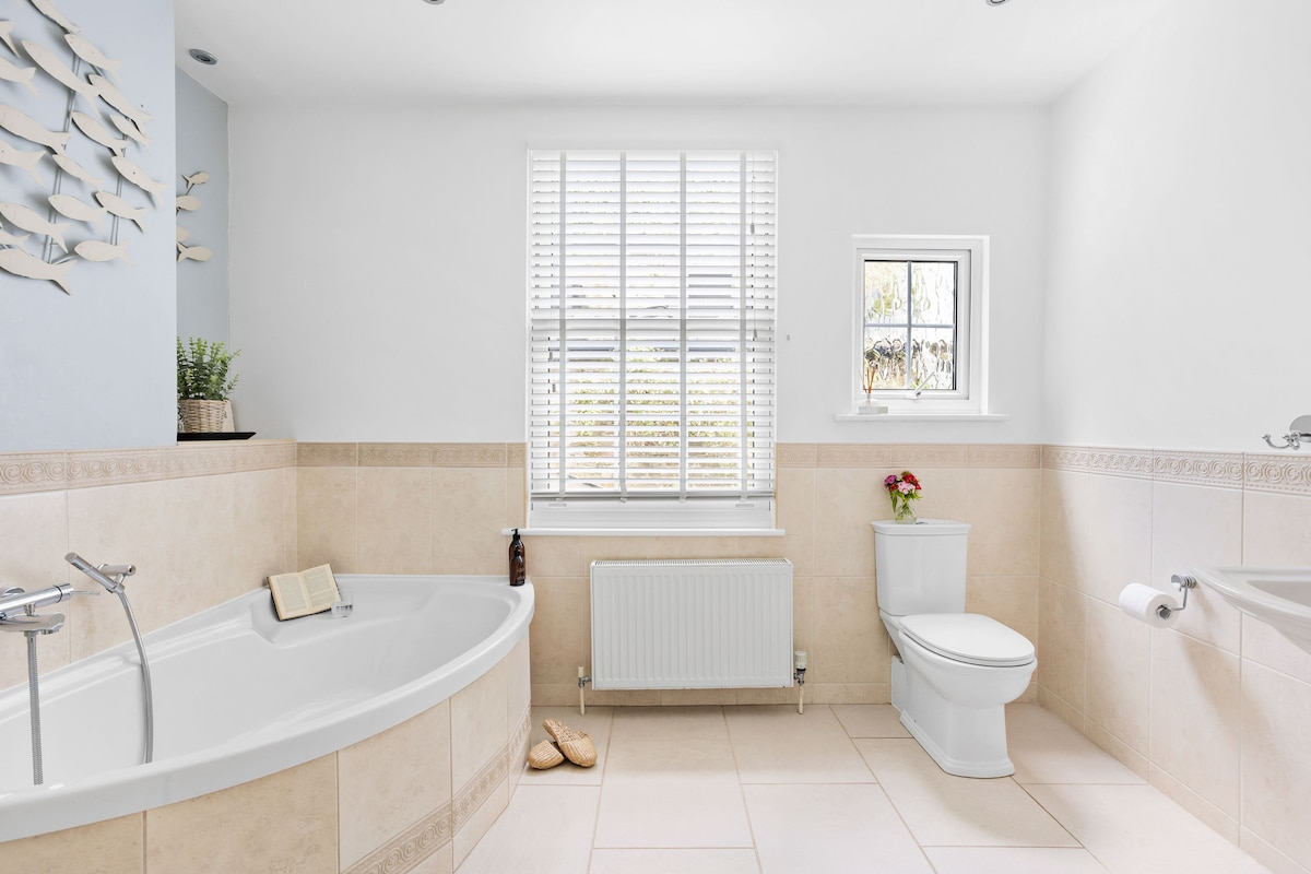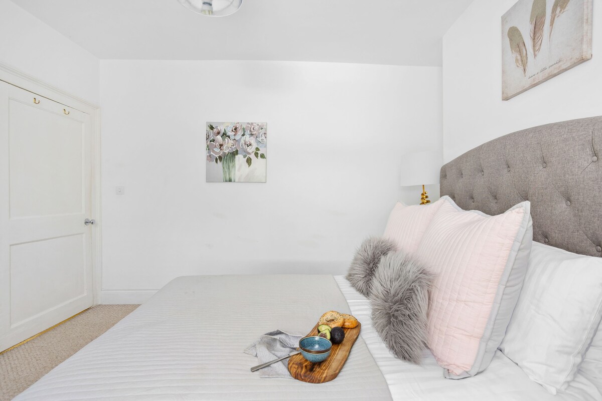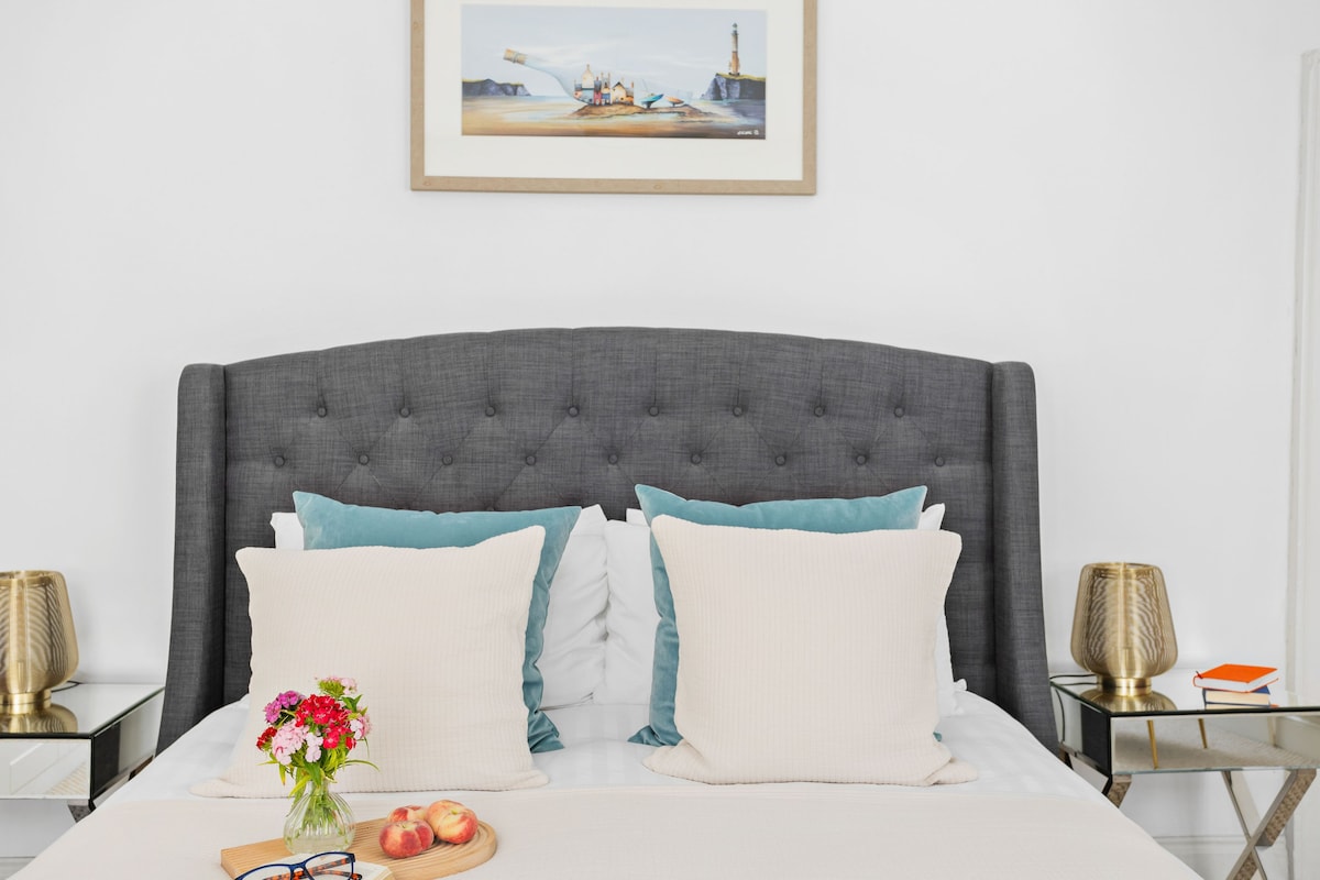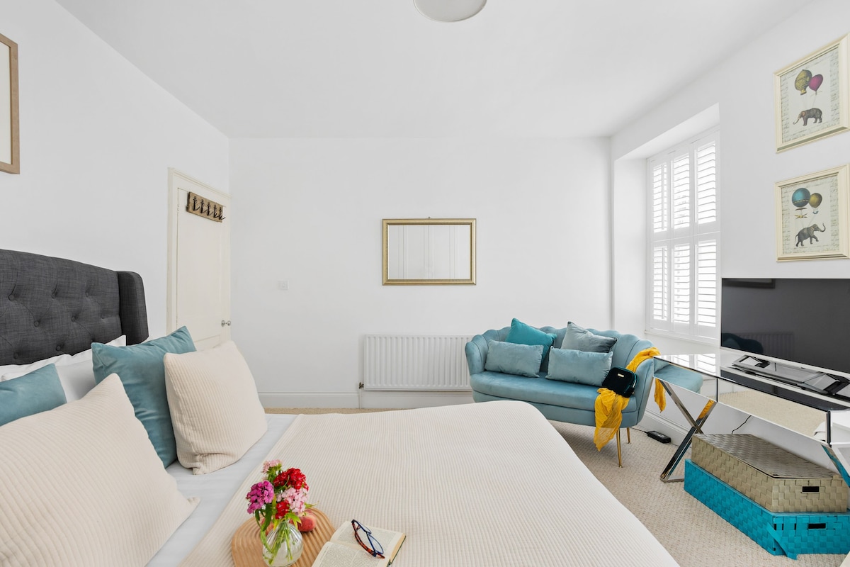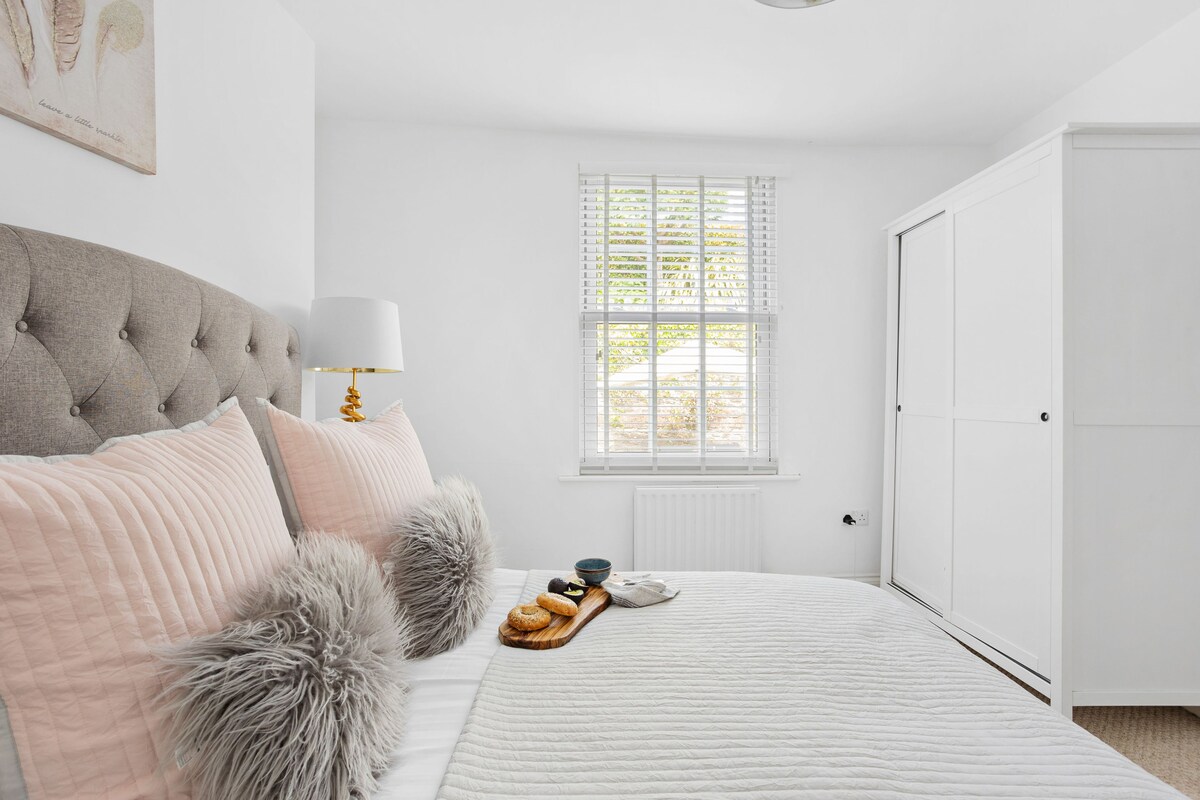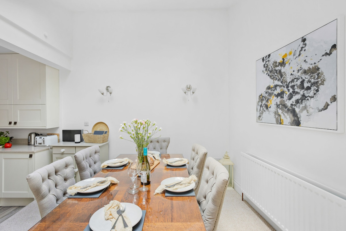 The front door opens from Clarence Hill into the open-plan living room. To the front of the cottage is the lounge furnished with sofa and armchairs, large TV, and side tables. The kitchen is very well-equipped for a self-catering holiday and has cream units with granite tops, housing the dishwasher, fridge and freezer, electric oven and hob, Nespresso machine (please bring pods). The dining area has a high glass ceiling flooding the room with light, wooden dining table and upholstered chairs for 6. Off the dining room is a small courtyard with a cupboard housing the washer/dryer and extra fridge and freezer space.Stairs lead up to the first floor with the first of the bedrooms, this one has an upholstered kingsize bed, plenty of storage and large TV. Also, on this floor is the large family bathroom with corner bath, separate shower, basin and toilet. On the second floor there are two bedrooms both with upholstered double beds and plenty of storage. One of them has an en suite shower, toilet and basin and television.