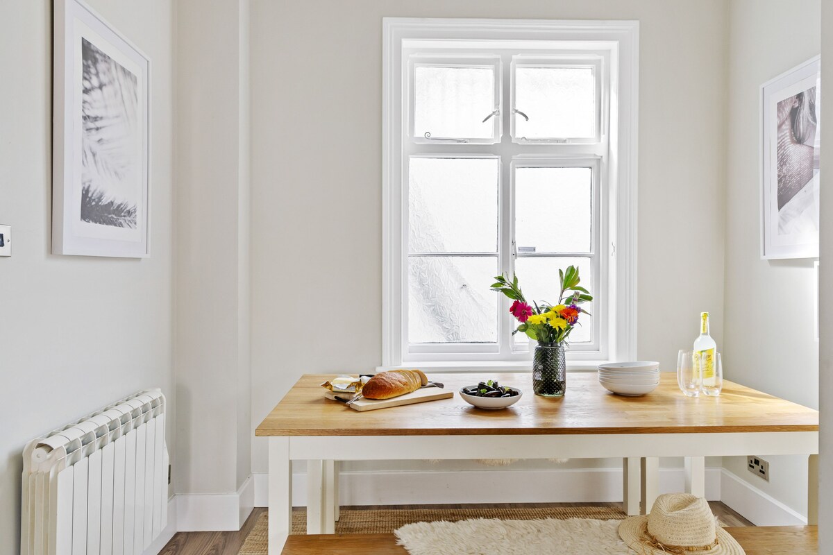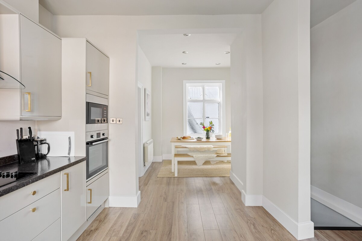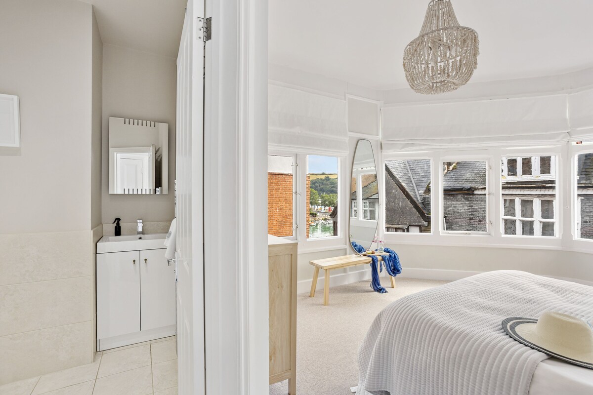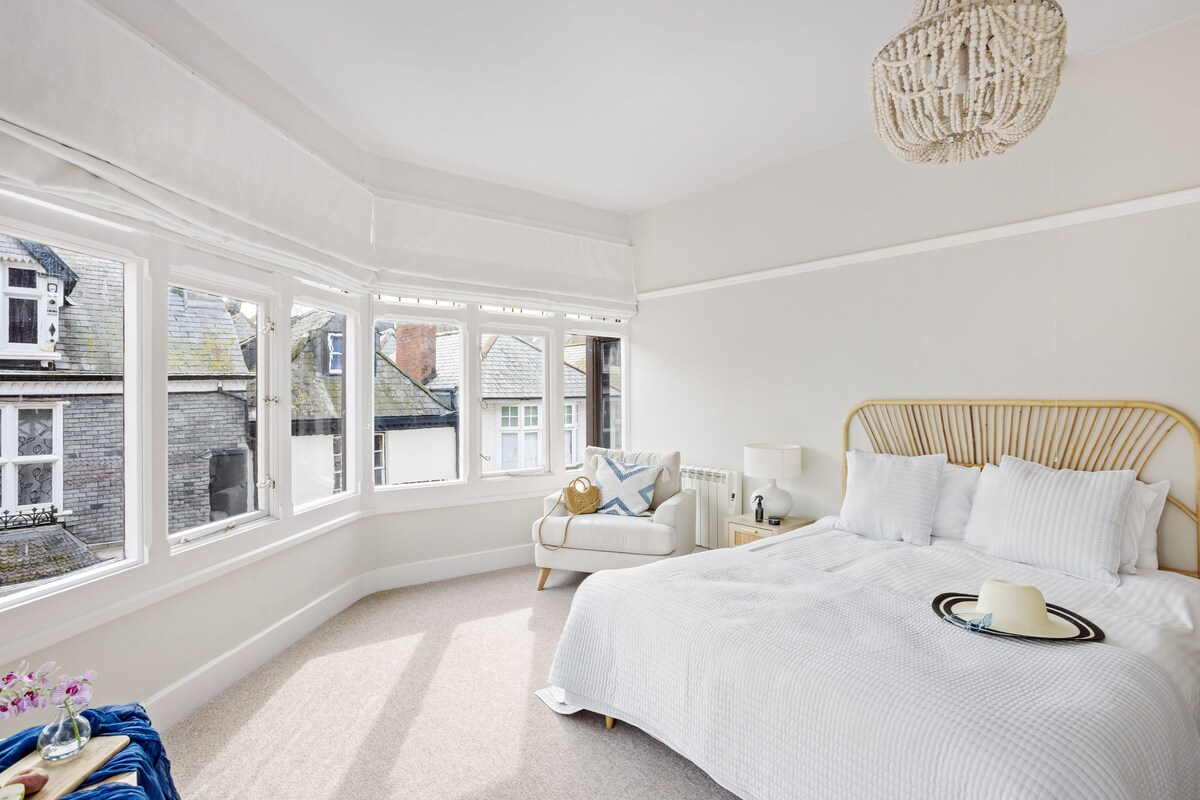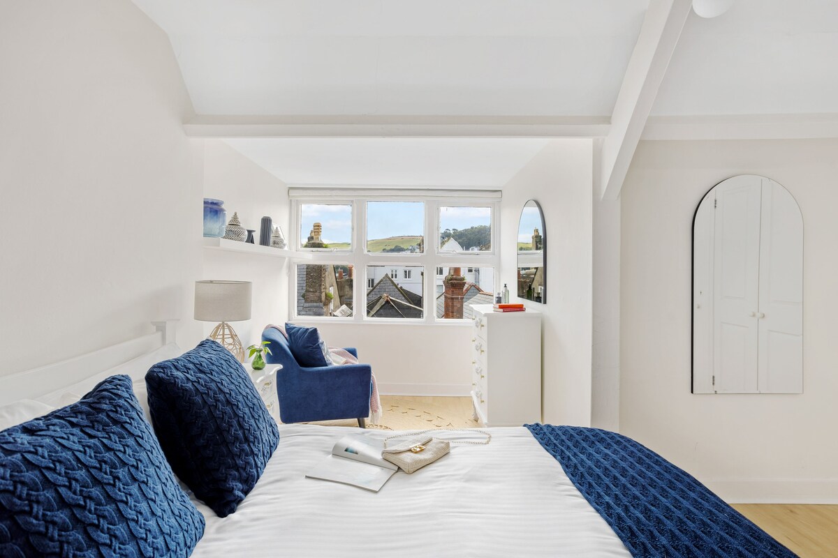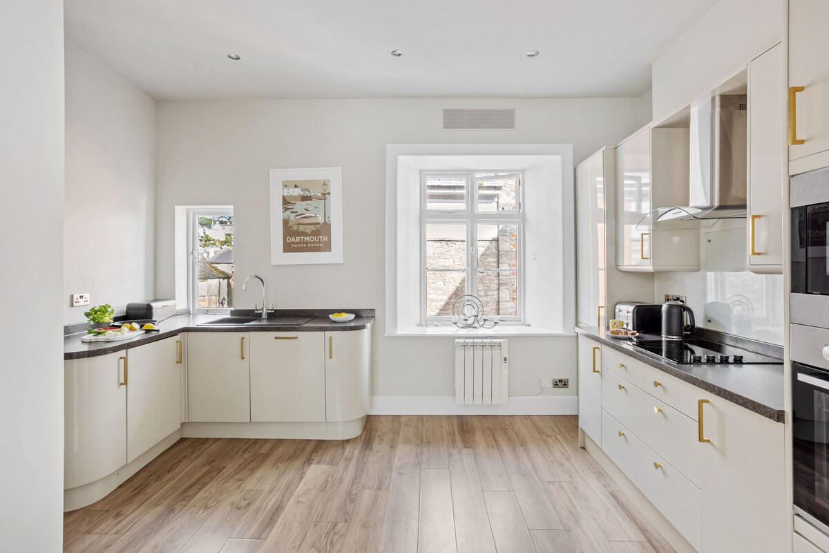 Eagles Nest is a beautifully furnished second-floor duplex apartment located in the heart of Dartmouth, within South Devon's Area of Outstanding Natural Beauty. This stylish retreat comfortably accommodates eight guests, offering a peaceful escape in a prime location.Upon entering, at first floor level, climb the staircase up to the apartment itself and enter firstly into the open plan kitchen and dining room. The kitchen is fully equipped with all you could want for your stay and where the designated chef can prepare meals for an enjoyable self-catering stay. Across the hallway you will find the inviting lounge featuring two large and very comfy sofas, perfect for snuggling into and unwinding after a day of sightseeing, and to sit back into and watch a movie on the Smart TV and, during the cooler months, enjoy the warmth of a wood-burning stove.