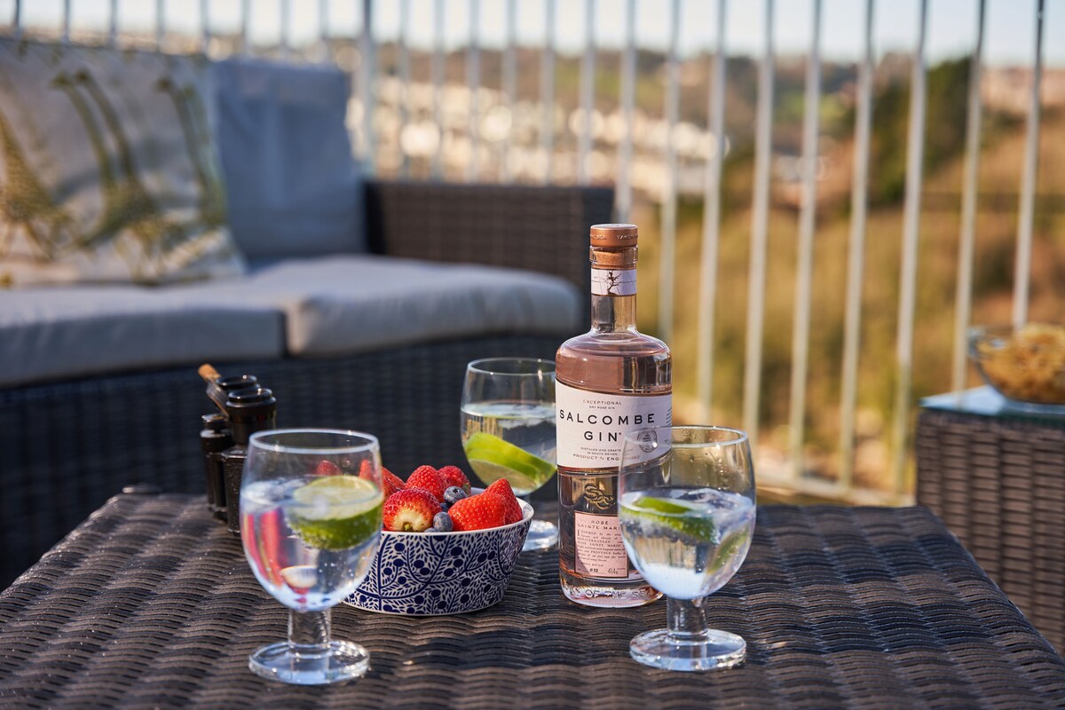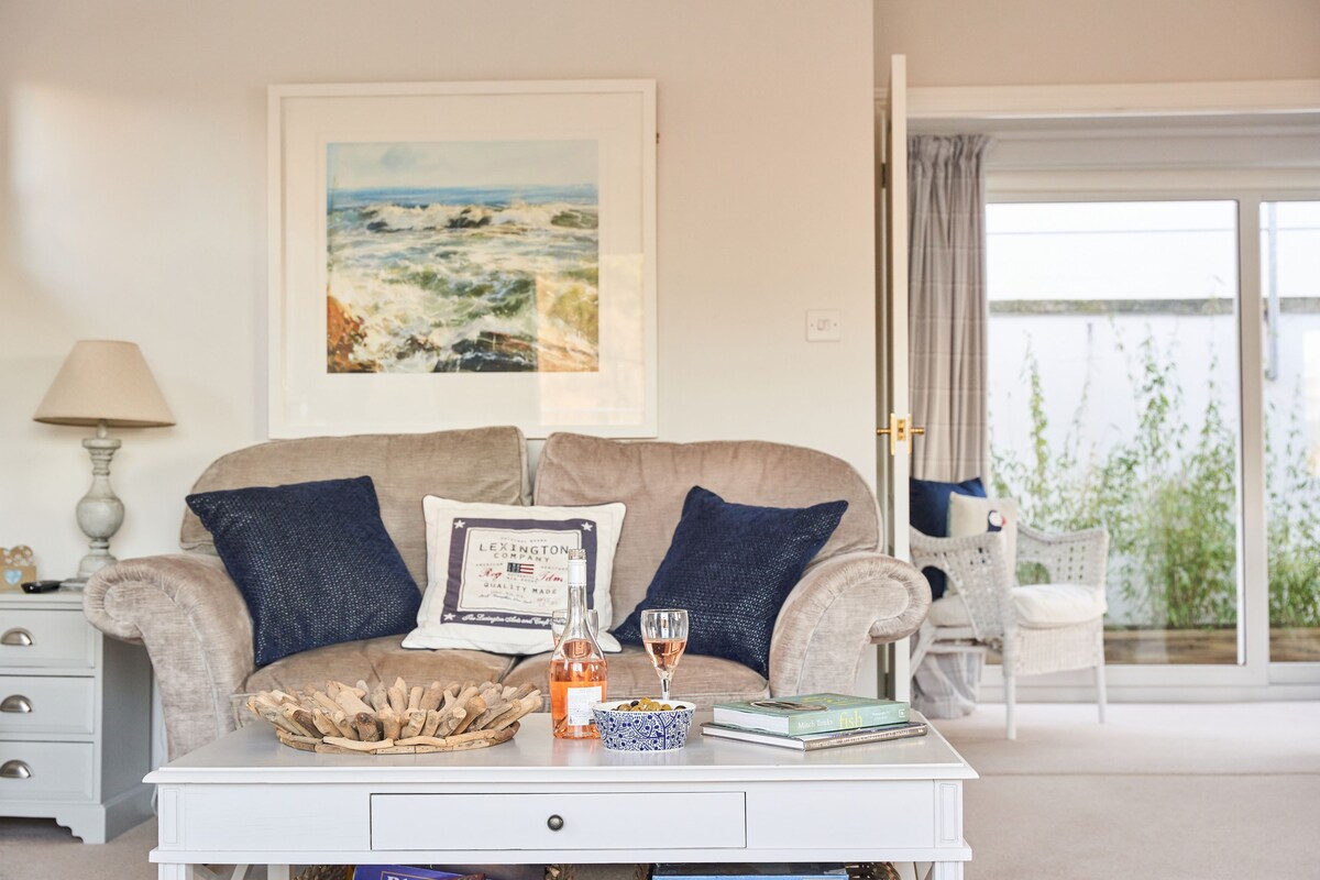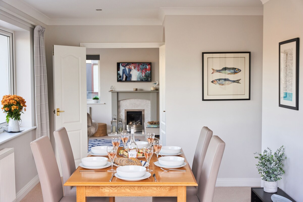 The stairs from the ground floor come up to a lovely light-filled landing with big patio doors at the rear of the property; off to the right are the kitchen and dining room. To the left are the utility room and the living room. The living room is a lovely light spacious room with two comfortable sofas, an armchair, and a wall-mounted TV above the log-effect electric fire. Large sliding windows open onto a balcony and offer lovely views.