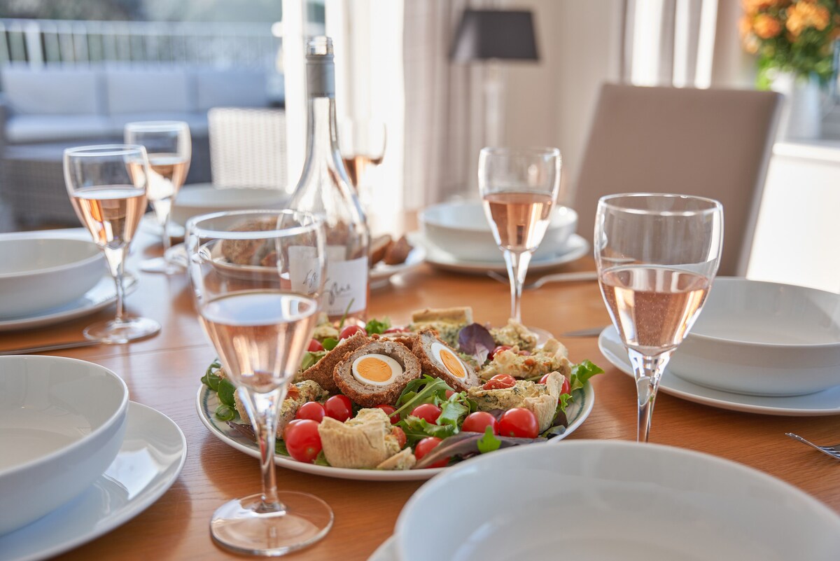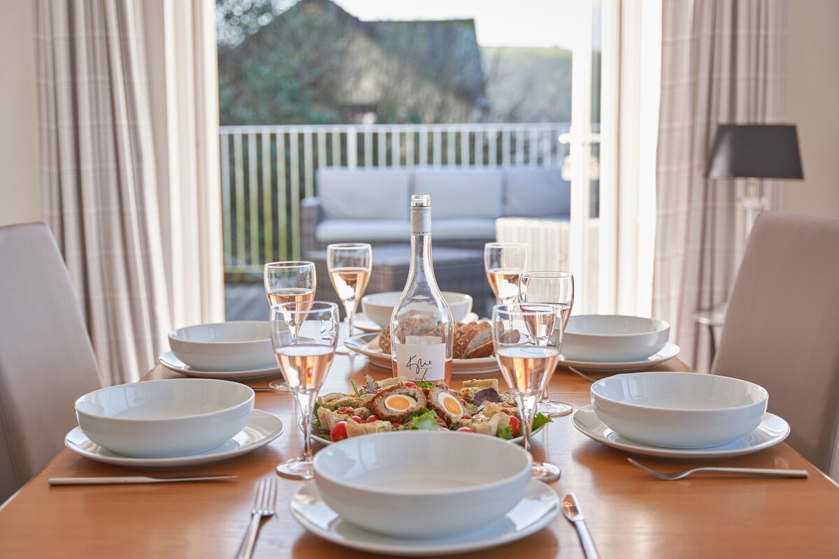 Double doors from the lounge to the dining room give a lovely open-plan feel; the dining room has a large table and chairs that comfortably seat five guests. Windows that stretch the length of the room really make the most of the view, and patio doors on the far wall that opens onto the beautiful deck bring a feeling of alfresco dining, even if it’s a bit chilly. The kitchen is at the rear of the property and is very well equipped with an oven and hob, fridge freezer and dishwasher; again a patio door allows you to access the large deck. There is also a utility room on the first floor with WC, washing machine, and tumble dryer.