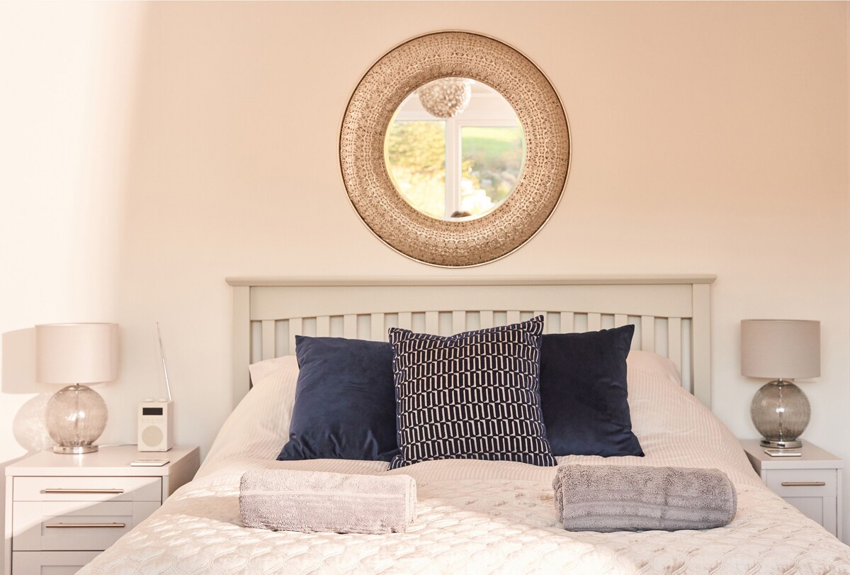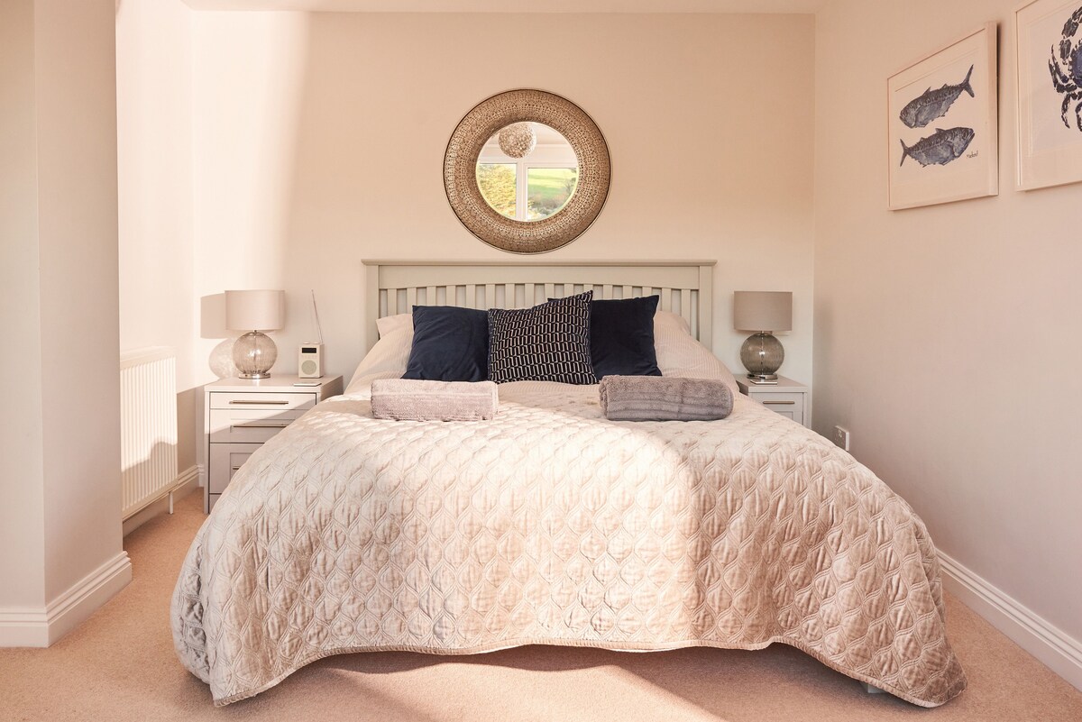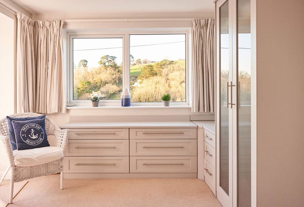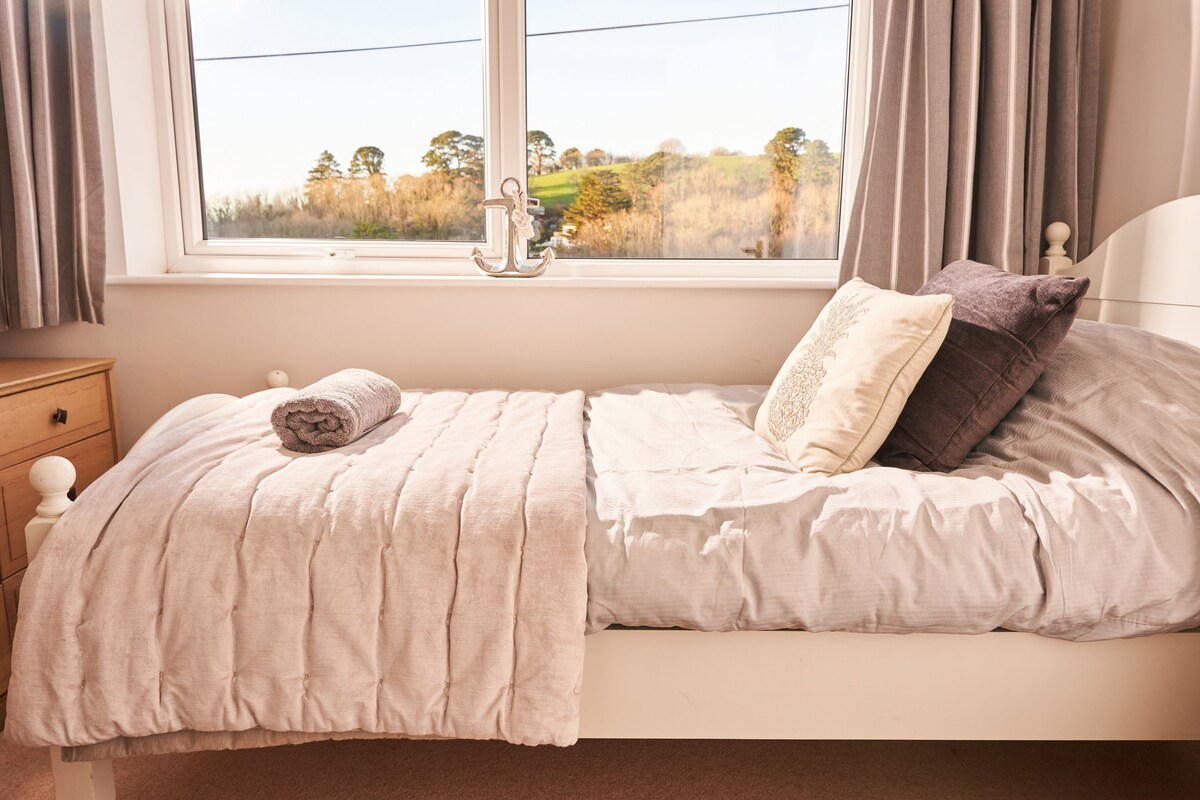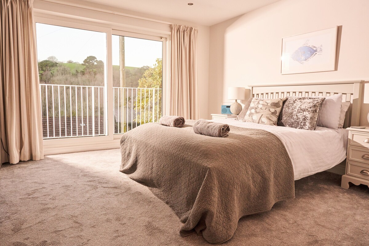 A flight of steps from the driveway take you up to the front door, which opens to the ground-floor hallway with the master bedroom off to the left and the 2 other bedrooms and bathroom off to the right. The en suite master bedroom has a kingsize bed. Patio doors open onto a balcony and offer outstanding views across Waterhead Creek and over the river to Dartmouth. There is a dressing area off the bedroom leading to the en suite shower room.