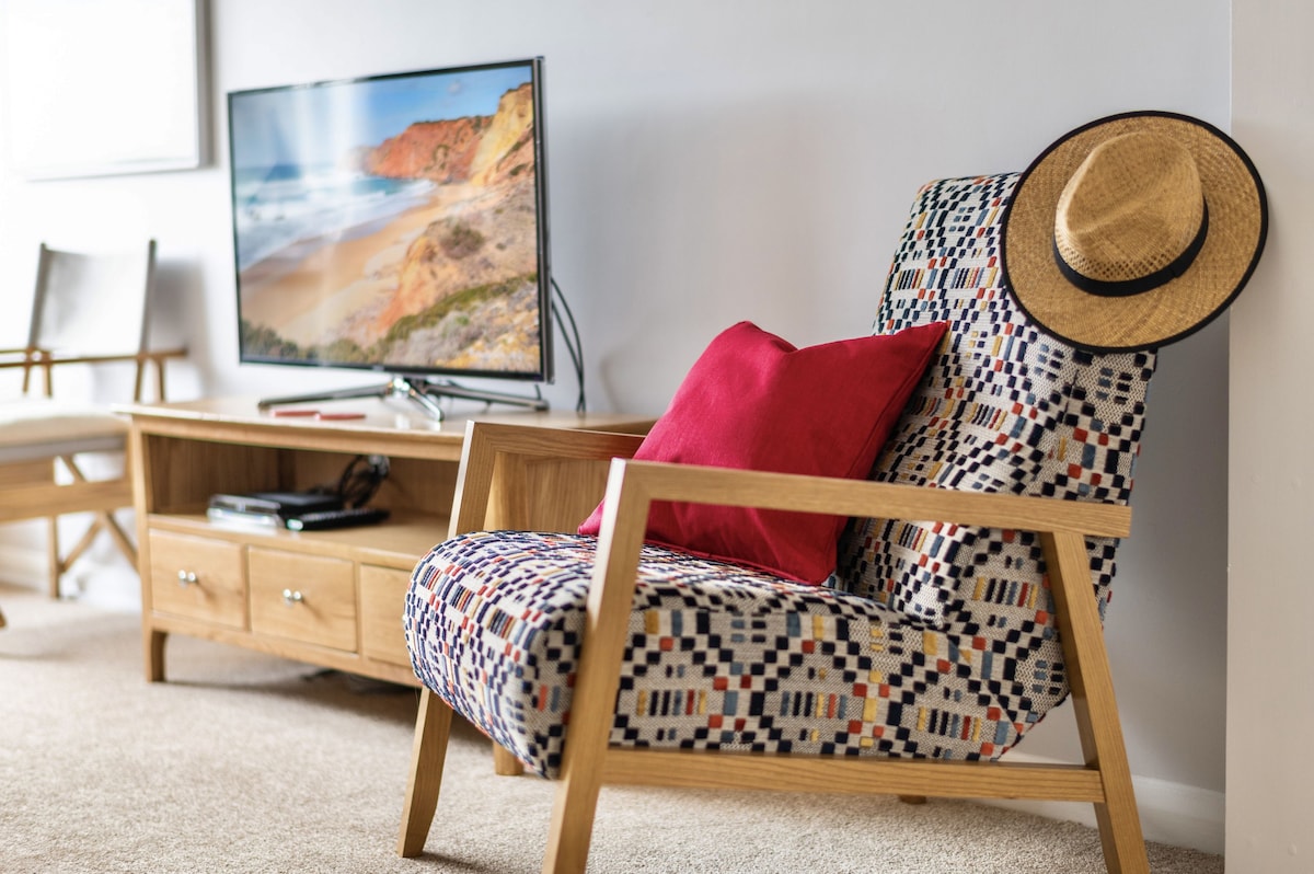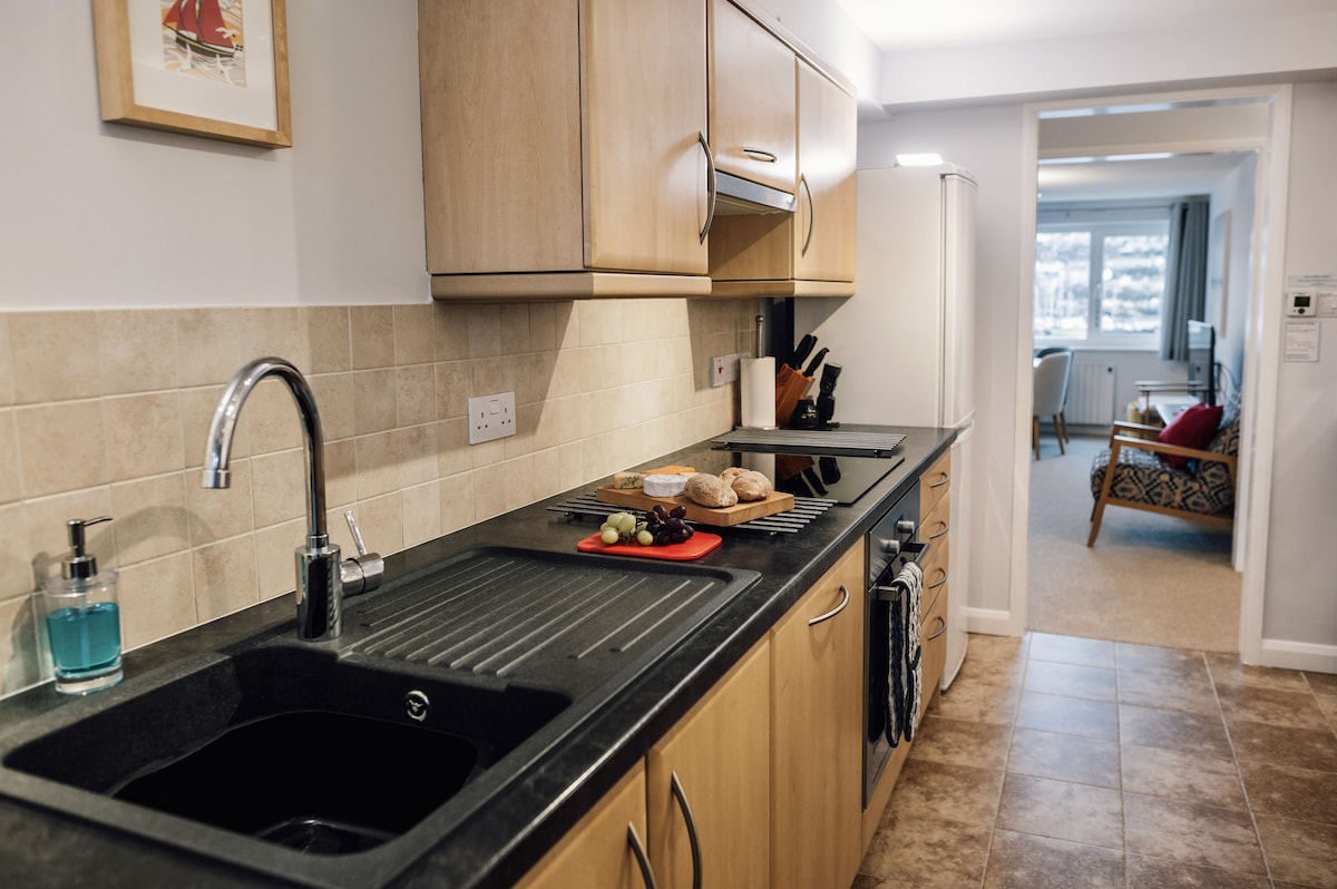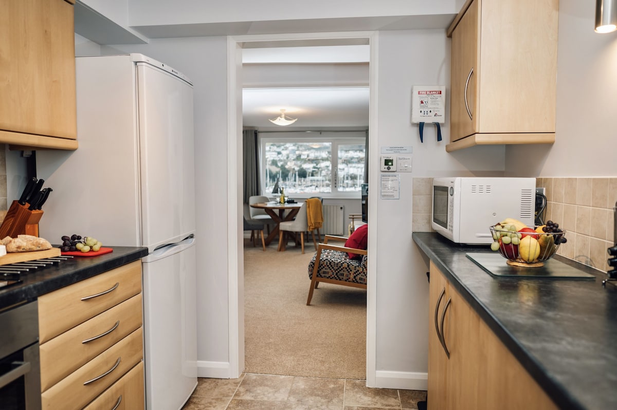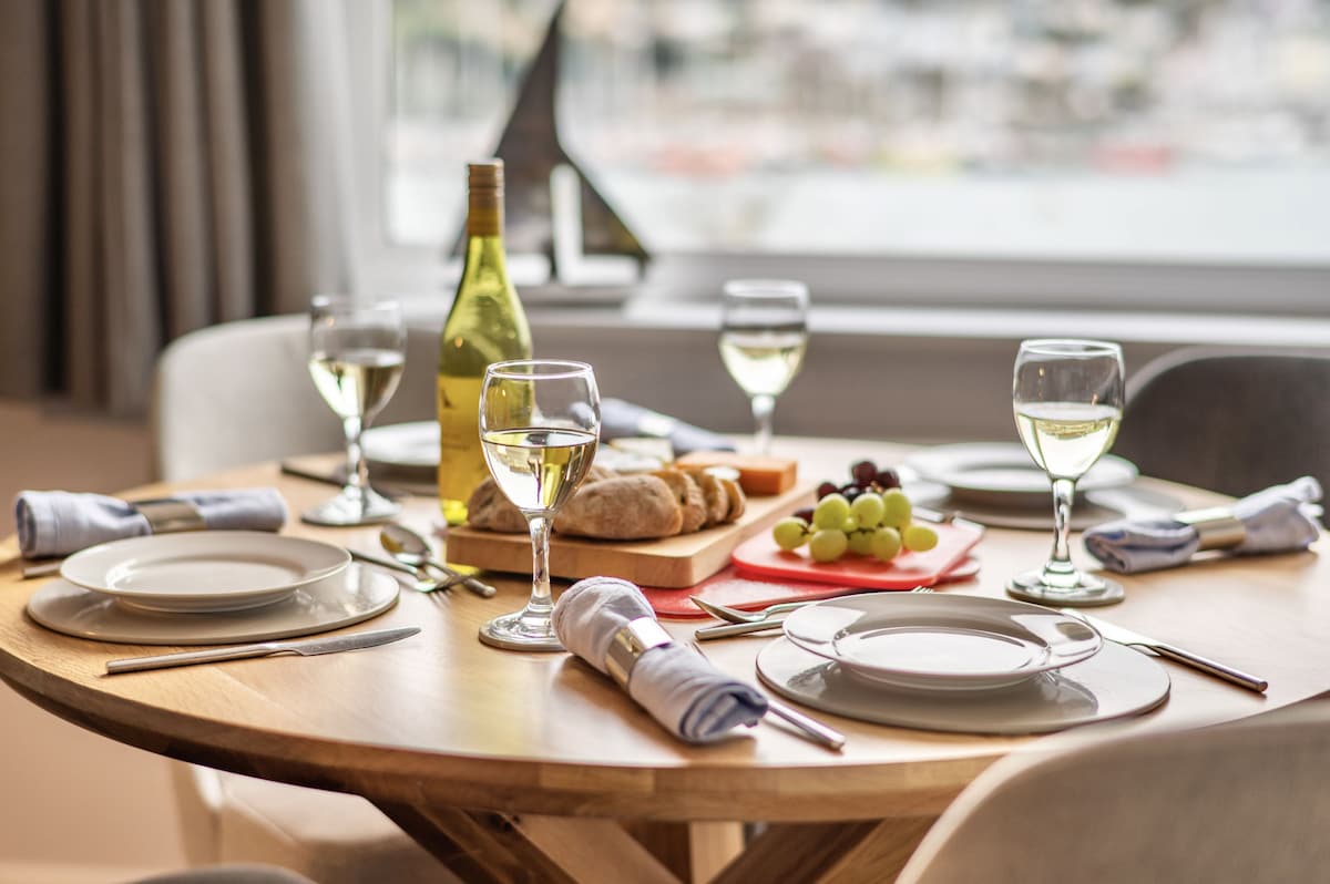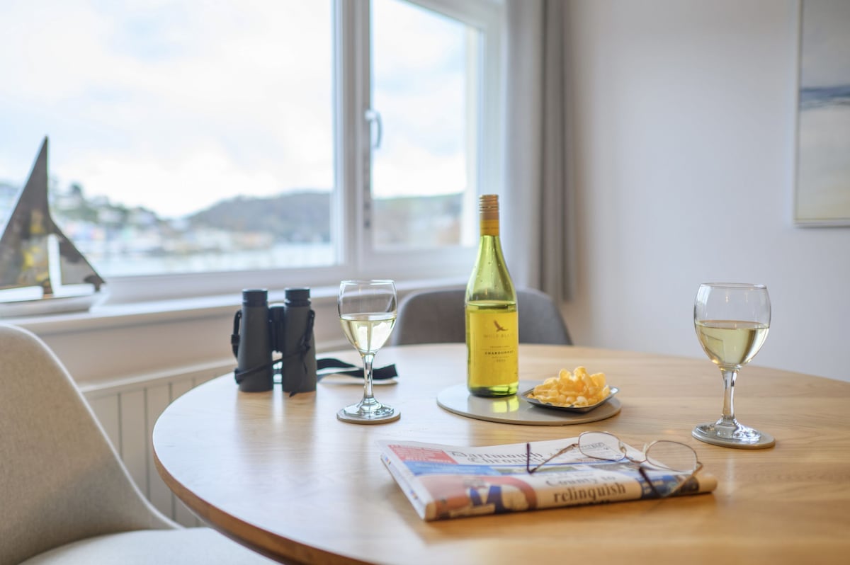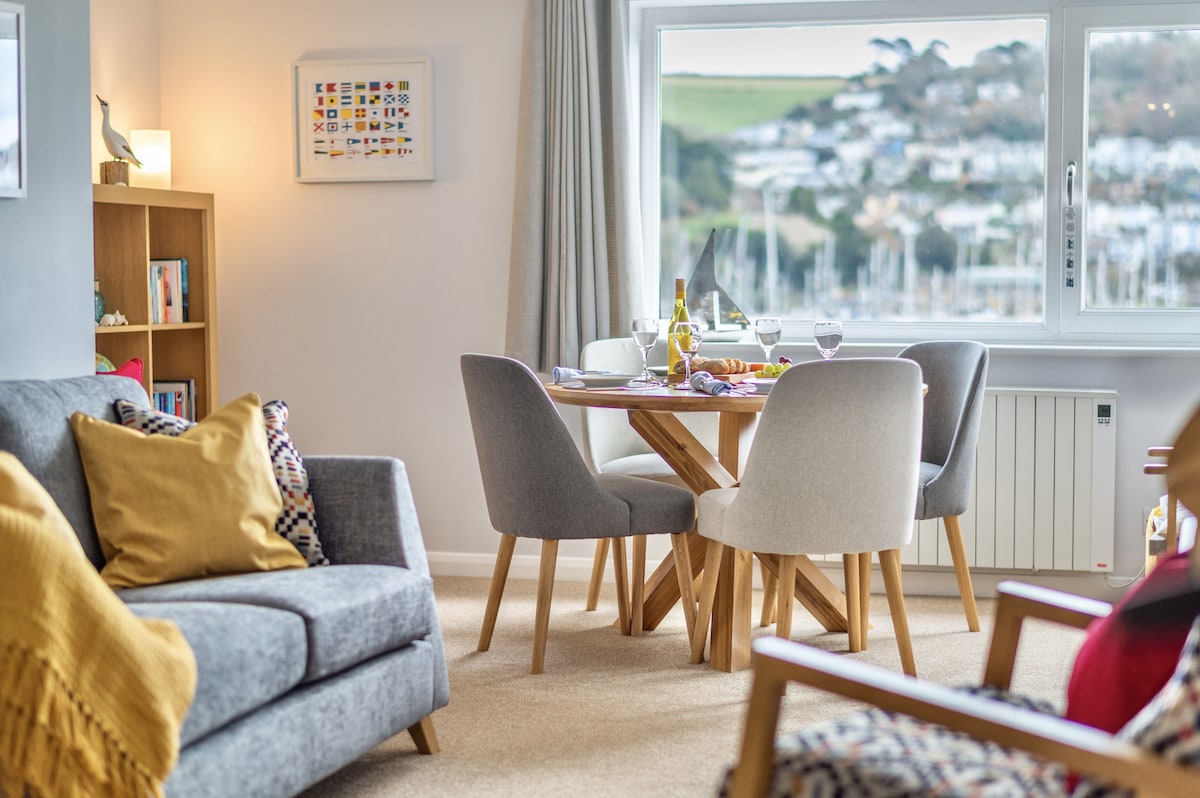 The open-plan living/dining area is laid out to make the most of the beautiful panoramic views of the river and embankment. It is furnished with a 2/3-seater sofa and coordinating armchairs and coffee tables, all with accent wood frames, a bookcase, smart TV, and an Internet-connected radio. The circular oak dining table and upholstered chairs are set by the window, providing one of the best dining spots in Dartmouth, as well as the ideal place to enjoy a coffee with the newspaper.