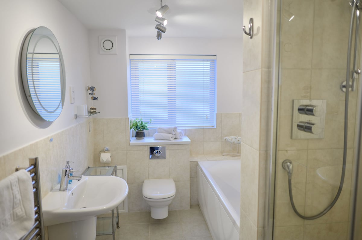 The spacious family bathroom features a bath, a generous shower, and a heated towel rail.