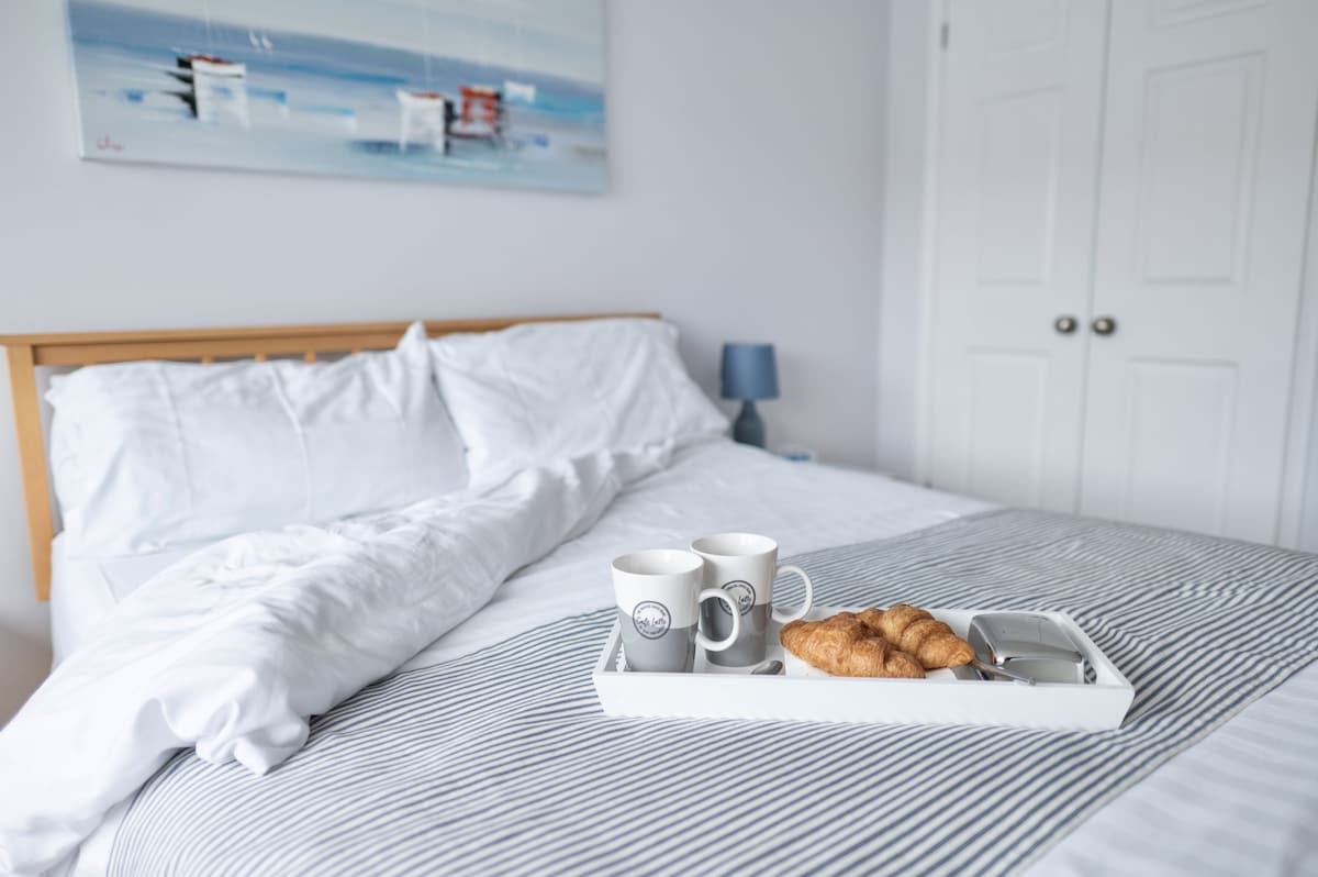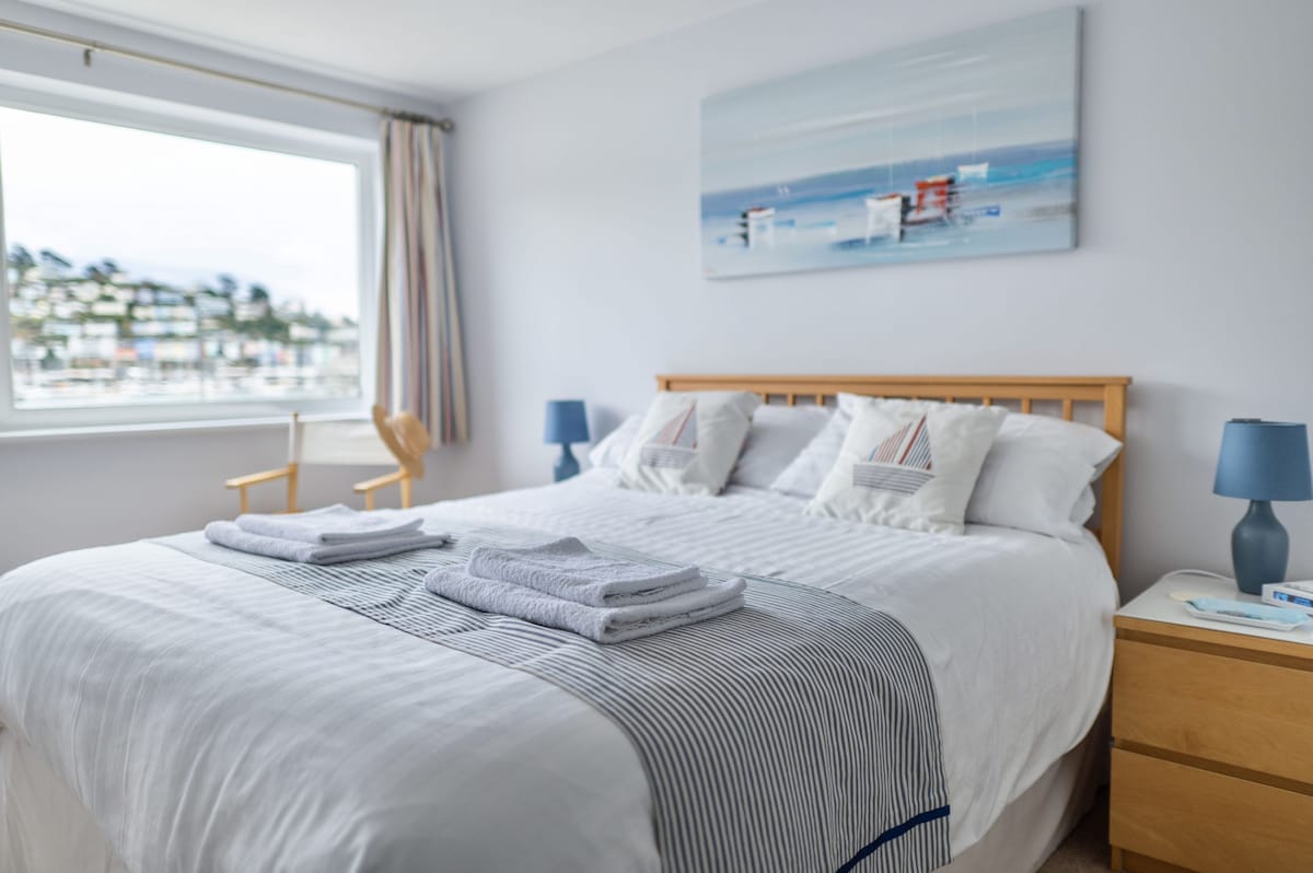 The spacious master bedroom - with a king-size bed, fitted wardrobe, and bedside table - also has a sizeable river-facing window - perfect for enjoying an early morning ‘cuppa’!