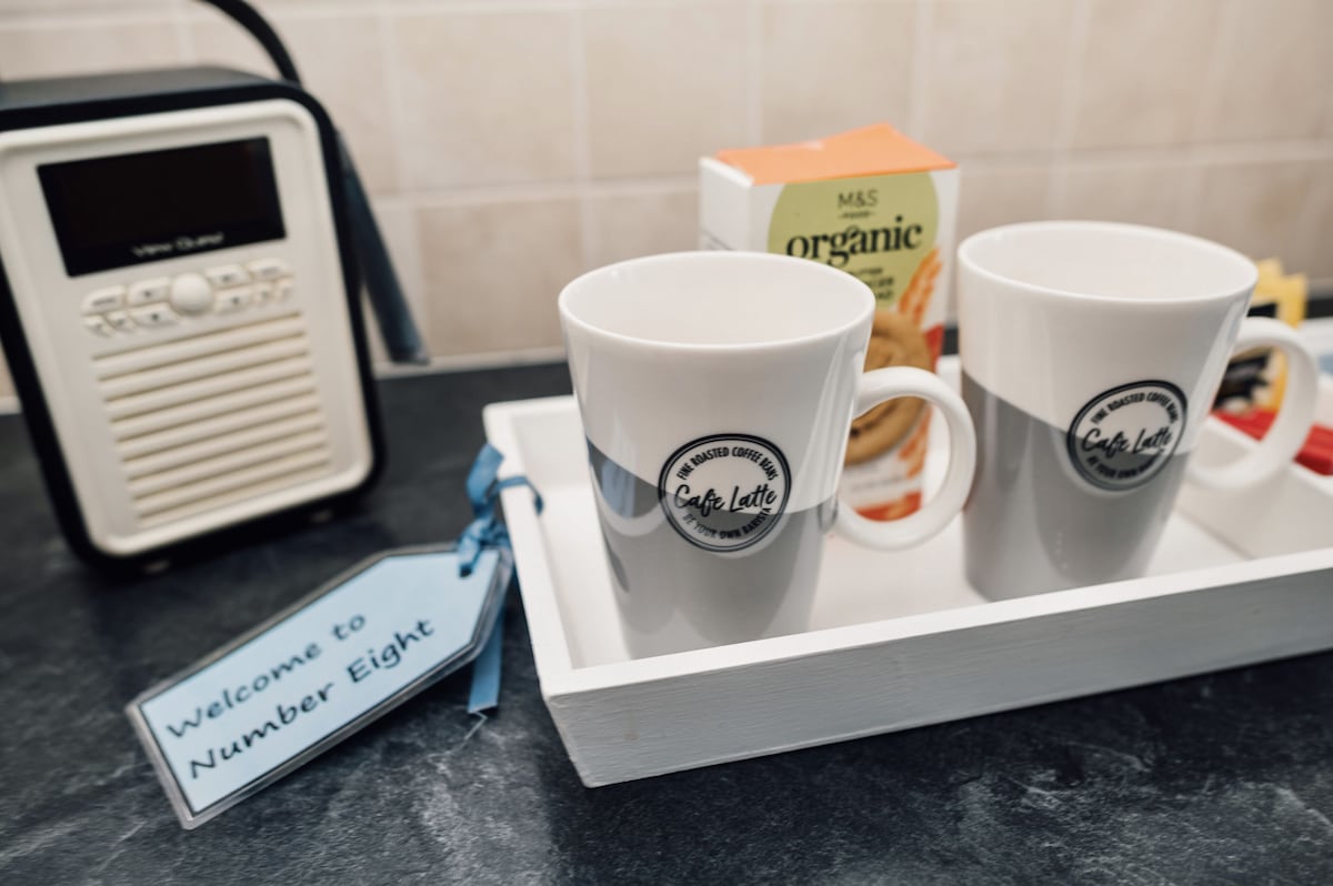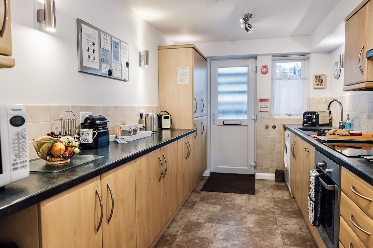 From the private parking area at the rear of the property, there are 24 steps up to the back door (there is also access from the front via the well-lit internal staircase). The back door opens into the well-equipped kitchen with an induction hob, oven, fridge-freezer, microwave, dishwasher, and washer-dryer. There’s also a Nespresso coffee machine and a Bluetooth speaker with DAB radio.
