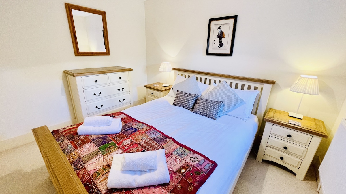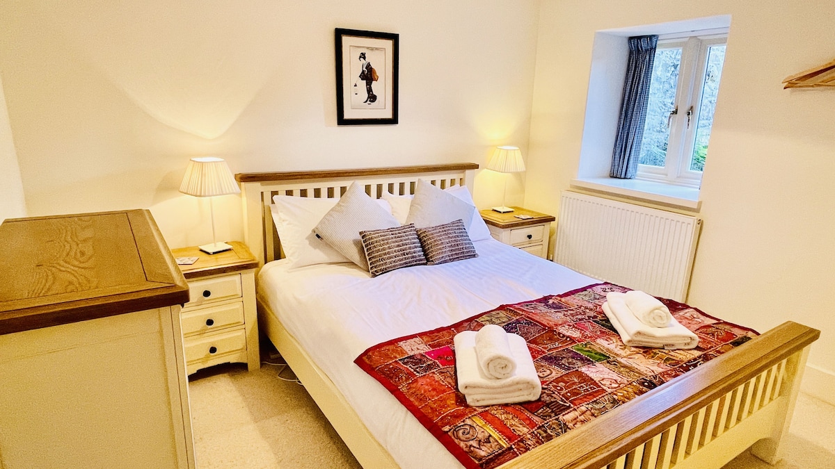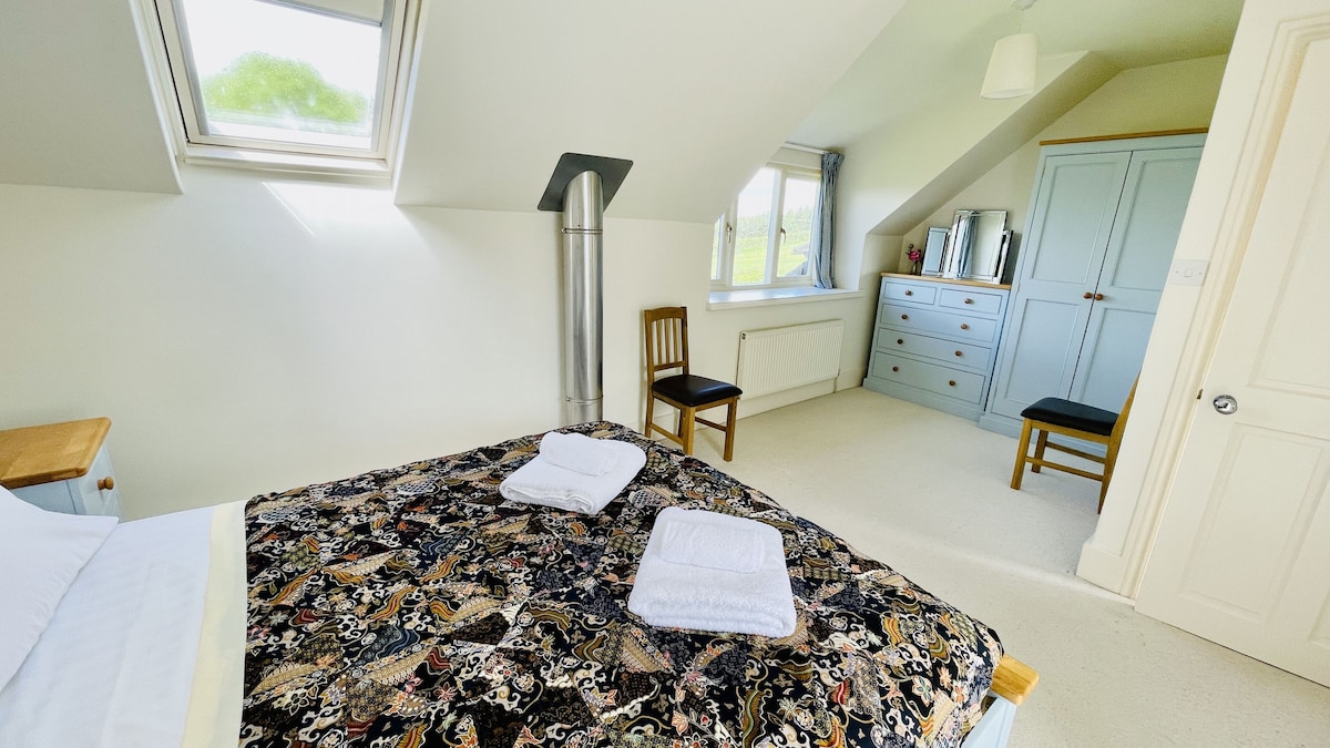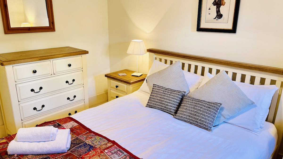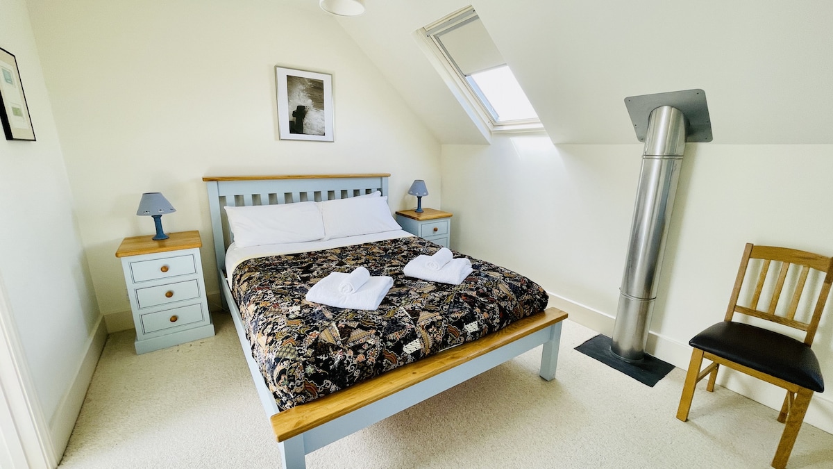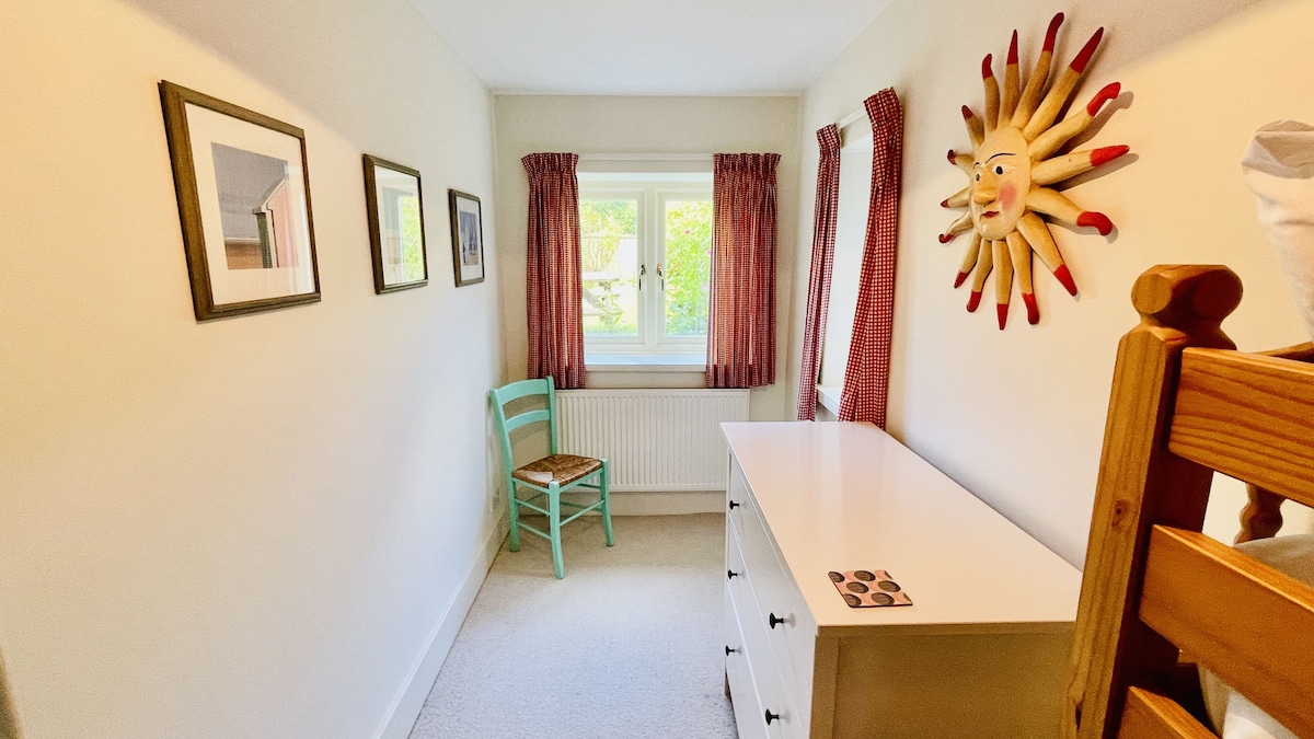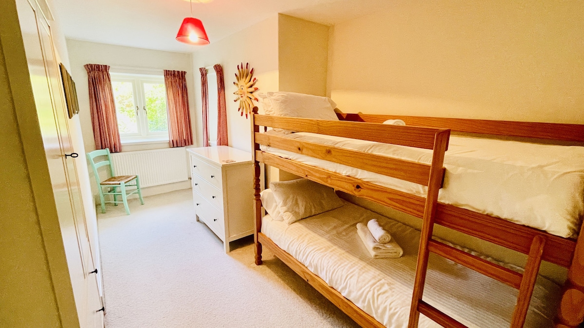 The front door opens into the ground floor hall with space for boots and coats. Two bedrooms on this floor overlook the garden. The first has a king-size bed, while the second is a bunk room, both with wardrobe and a chest of drawers for storage. The family bathroom is also on the ground floor with a bath, overhead shower and WC. Guests will also find the washer-dryer in the family bathroom.