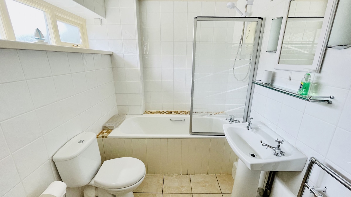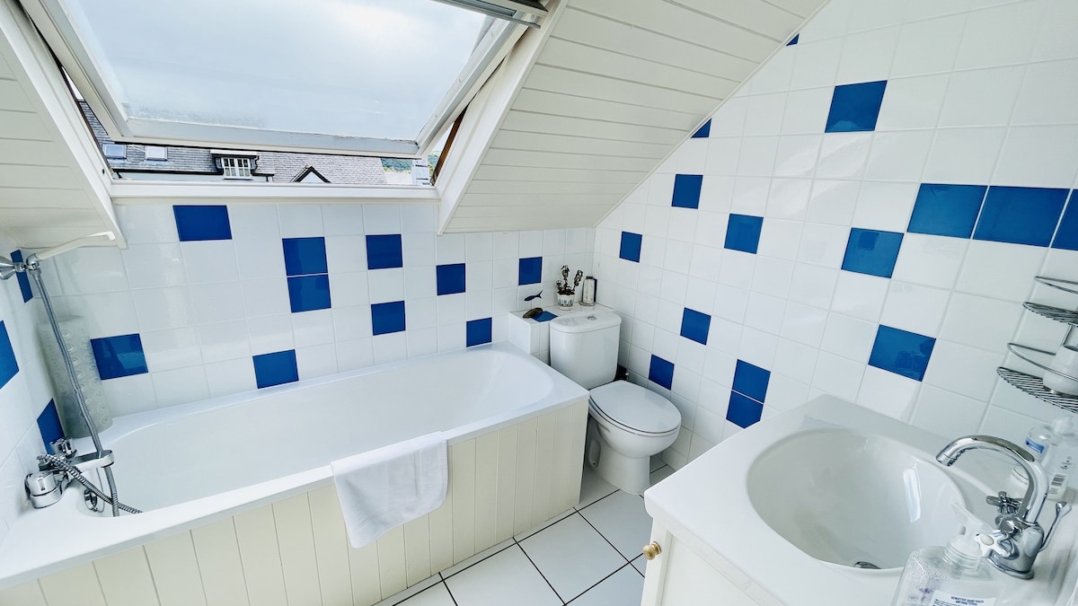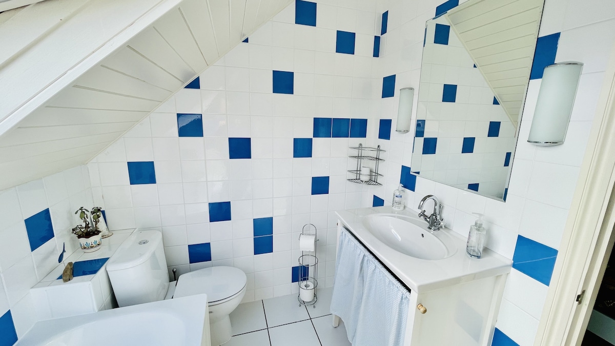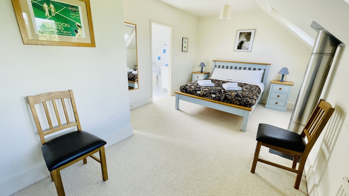 Upstairs again takes you to the light and airy en-suite master bedroom in the eaves of the house, with a kingsize bed, blue-painted furniture, The en-suite has a bath with overhead shower.