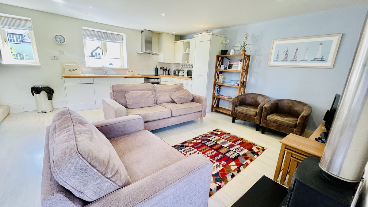 Upstairs, there is the open-plan living space with a well-equipped kitchen, dining, and lounge areas. The cream kitchen is complete with a fridge, freezer, dishwasher and microwave. The lounge area has two sofas, two armchairs, a wood burner, a TV and a DVD player. The dining table seats six and looks out over the garden and countryside towards the river via the patio doors out to a small balcony. There is additional seating on the balcony for enjoying a morning coffee with steps down to the garden.