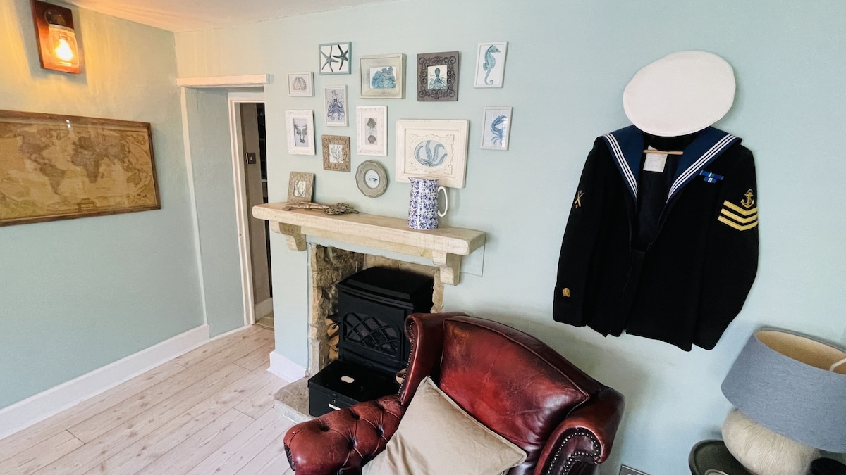 Through to the cosy living room with sofa and armchairs, freesat TV, soundbar, DVD player and Sonos speaker. Limed oak effect floor, wooden plantation shutters, electric woodburner effect fire and underfloor heating.