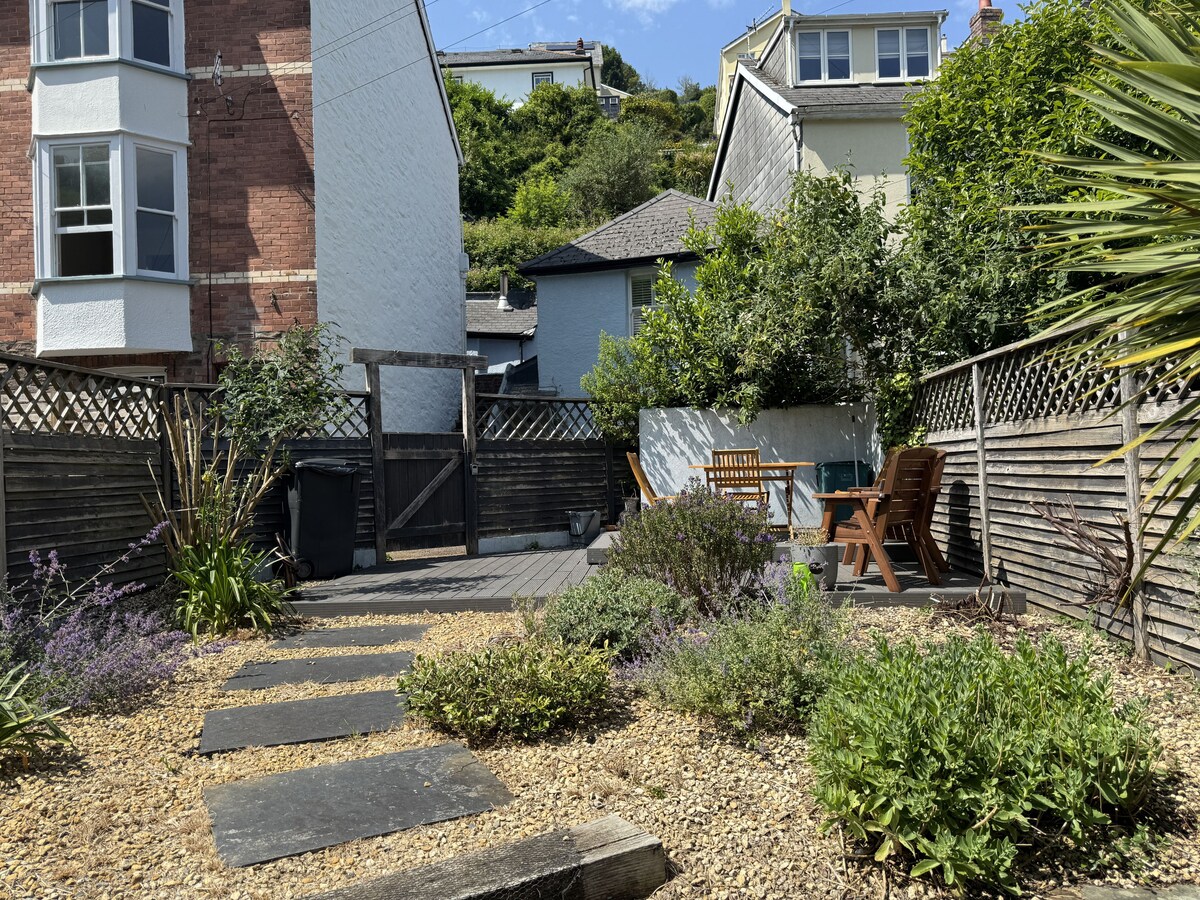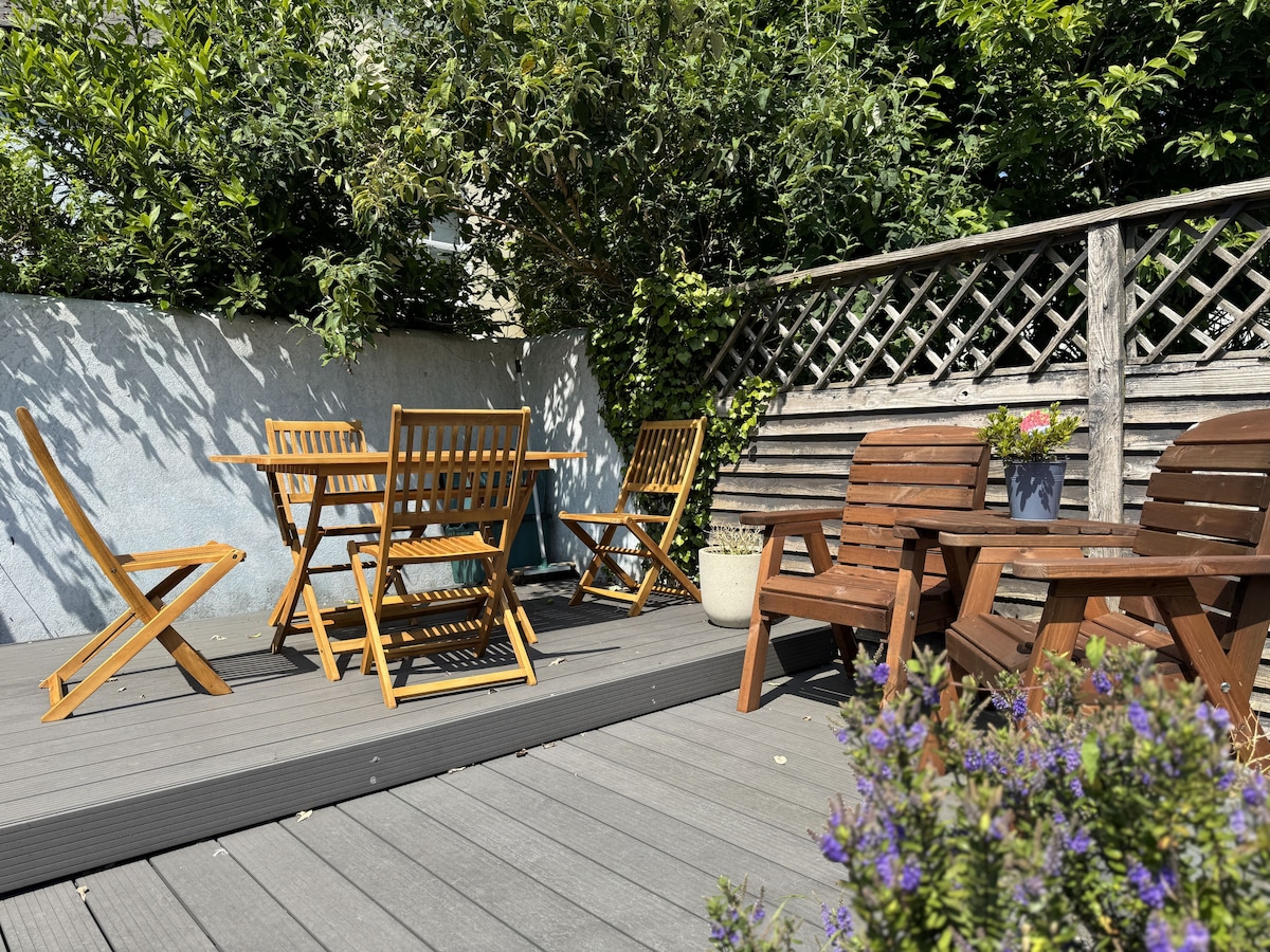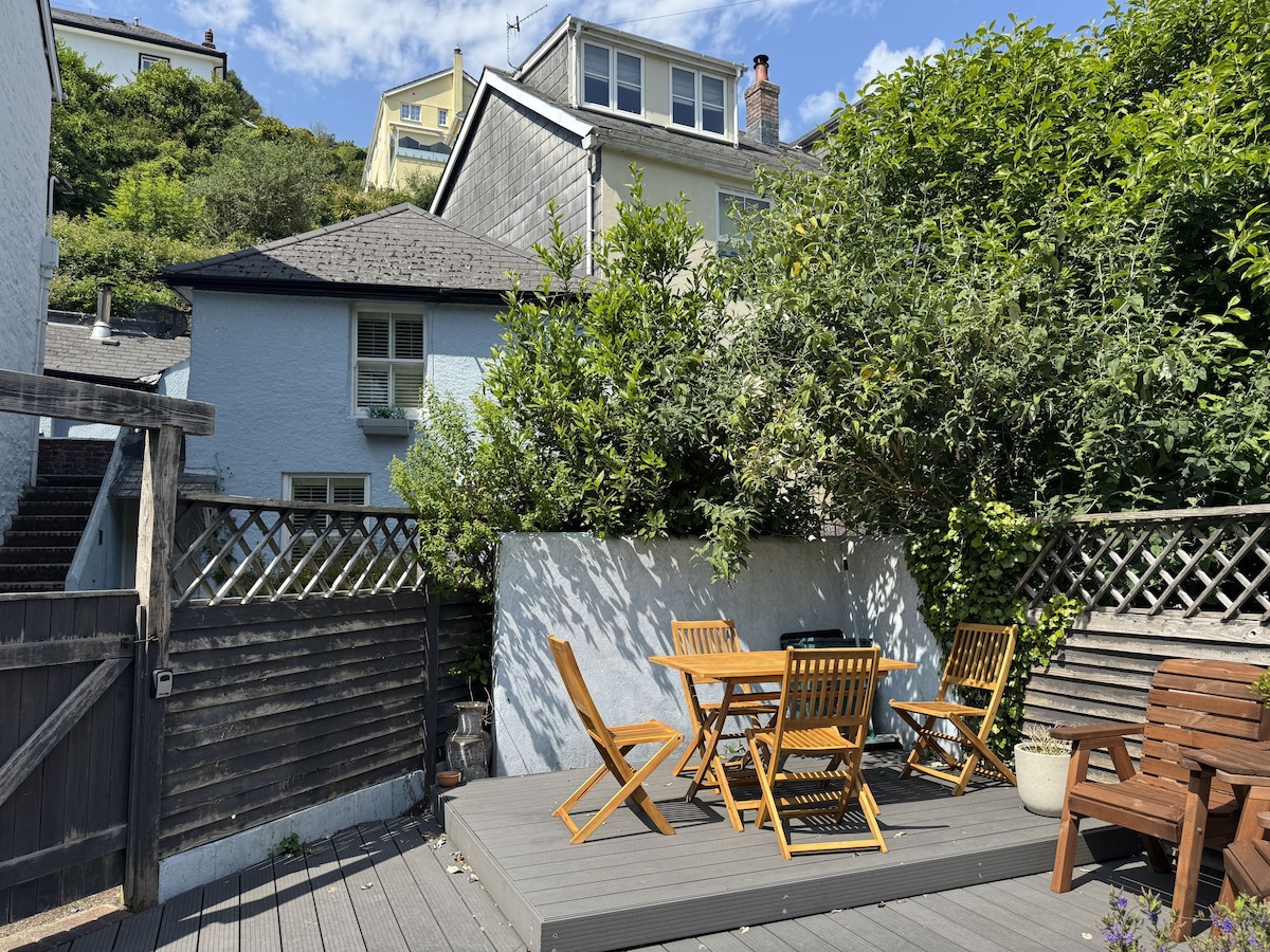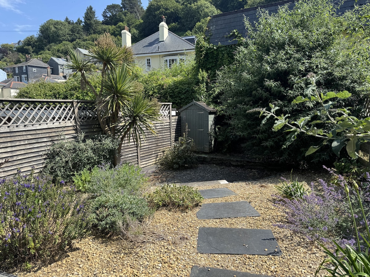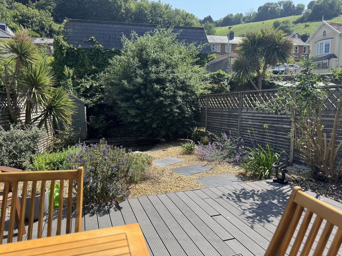 Across the footpath from the front door there is a fair-sized enclosed garden. A private space which is a lovely suntrap on a summer’s afternoon. The rattan furniture is on a decked area, past the deck is a further slate shingle area with mature shrubs.