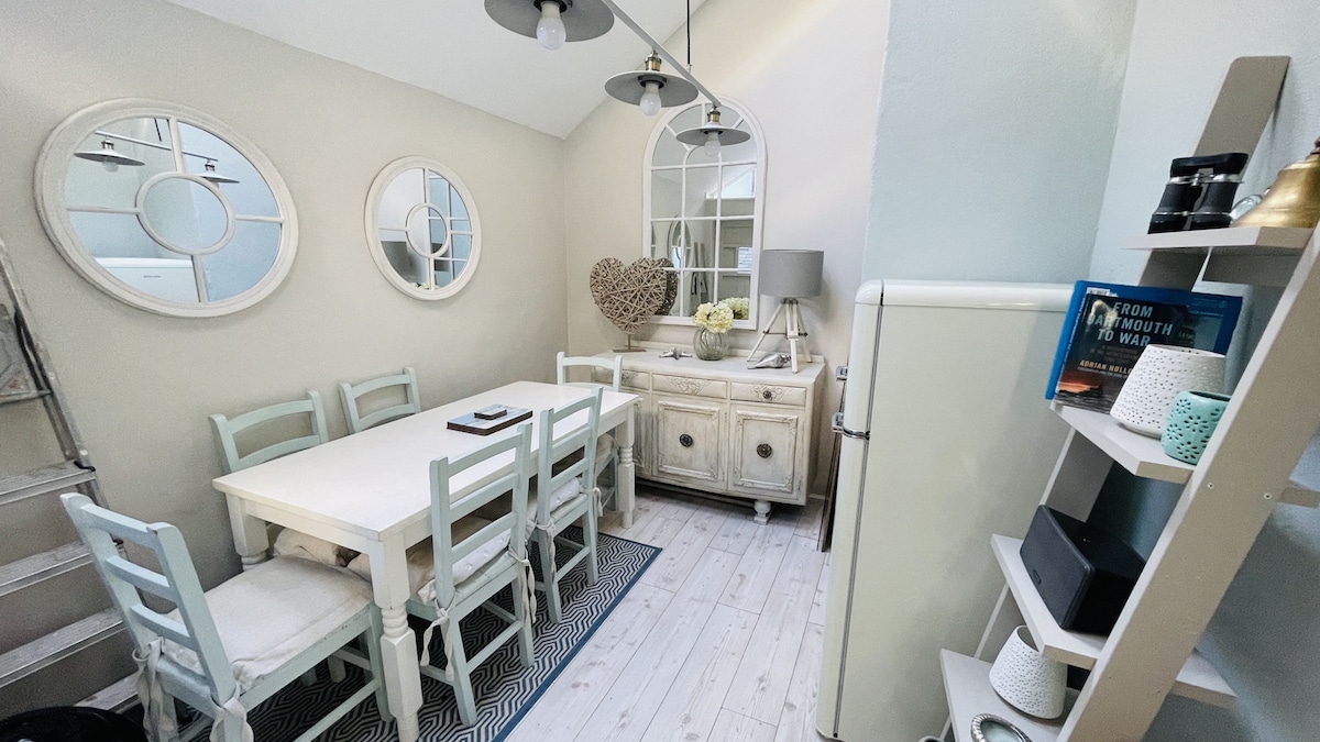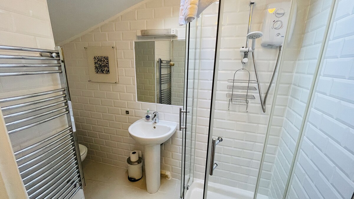 The property is accessed via a small step approaching the front door, there is a hallway with room for coats and boots with access to the shower room with electric shower, electric heated towel rail, toilet and wash basin.Through to the cosy living room with sofa and armchairs, freesat TV, soundbar, DVD player and Sonos speaker. Limed oak effect floor, wooden plantation shutters, electric woodburner effect fire and underfloor heating.