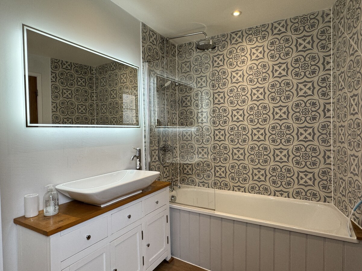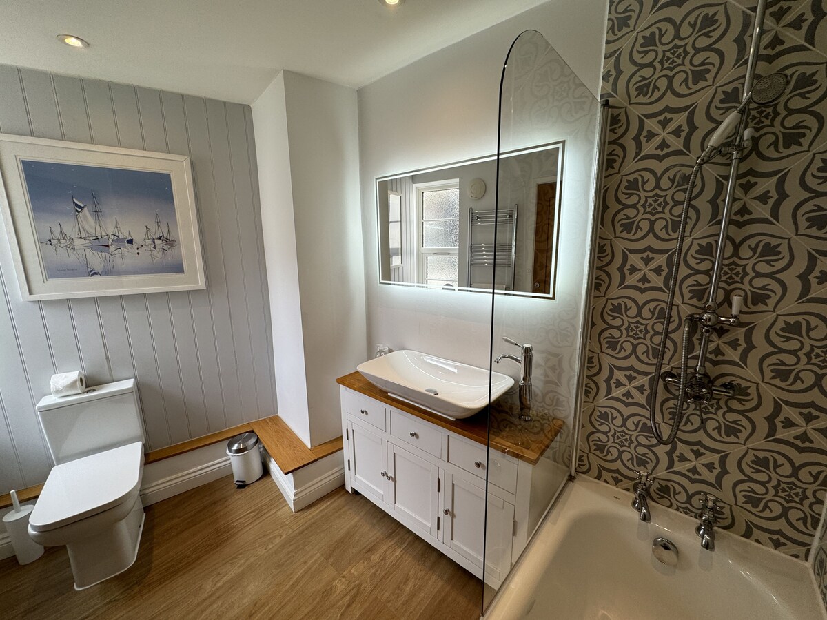 Bathroom One – This bathroom is on the first floor and has been recently renovated along with the rest of the house. It sports a large sink with a touch-press lit mirror, a bath/shower, toilet and heated towel rail.