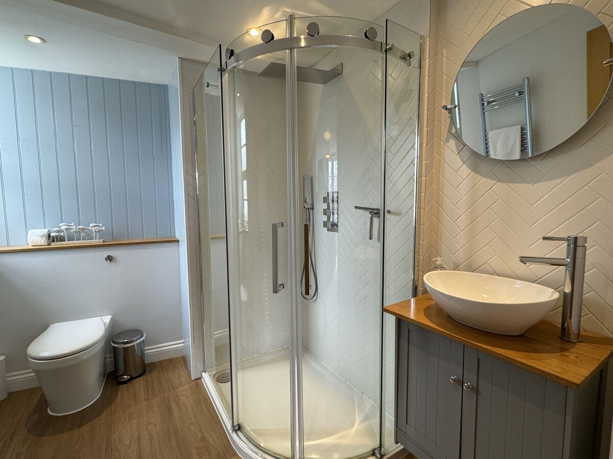 Bathroom Two – This bathroom belongs to the bedroom on the top floor of our property and has a large walk-in wardrobe with main showerhead and a handheld shower-head as well as a large sink, toilet and heated towel rail.