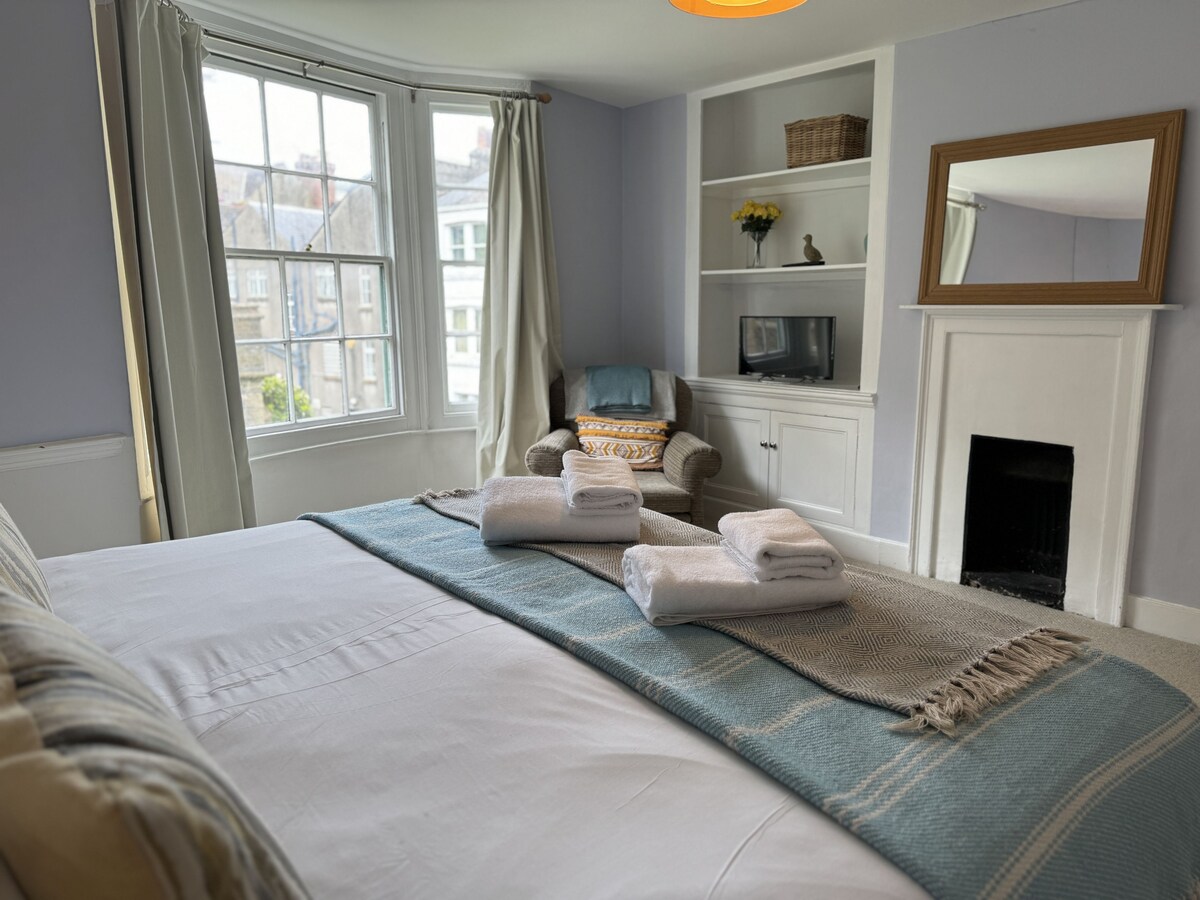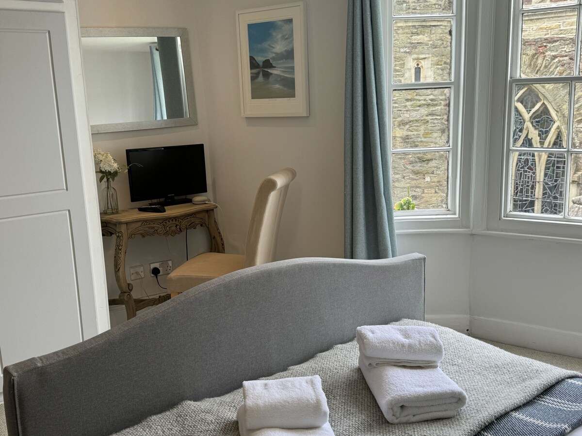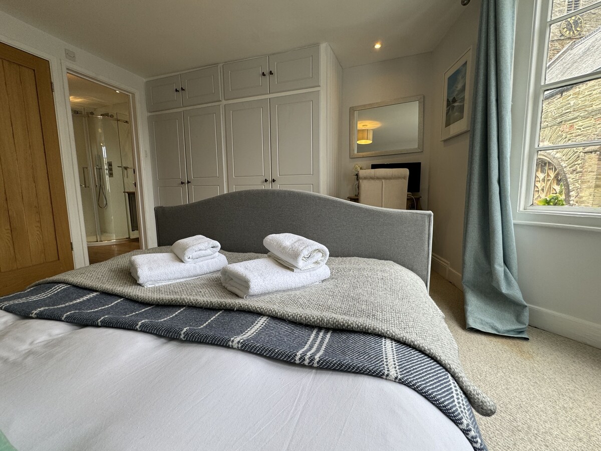 Bedroom Two – Located on the third floor, this large bedroom has a KINGSIZE bed, dressing table, Smart TV and plenty of wardrobe space. Located in the wardrobe is the ironing board, iron and drying rack for your use. Once again, this room provides large, sunlit windows overlooking Dartmouth’s’ historic church, St Saviours.