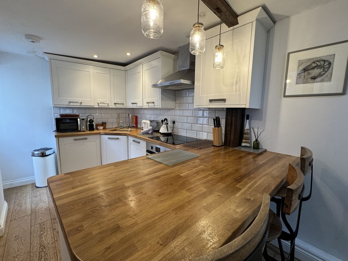 The front door of this beautiful little cottage opens into a modern open-plan, combined kitchen/dining and living room area with oak flooring and worktops, which are complimented with large, comfortable lounge seating and bar dining.