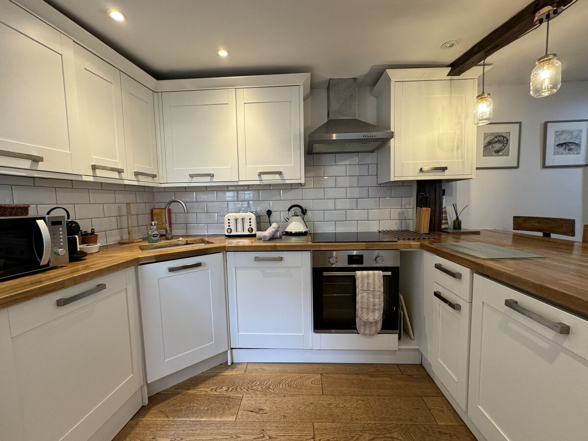 The very well-equipped kitchen is complete with large Belfast sink, solid wood worktops, a single oven, induction hob, fridge, freezer, dishwasher, microwave, Nespresso machine (capsules not provided) and all other kitchen utensils and accessories.