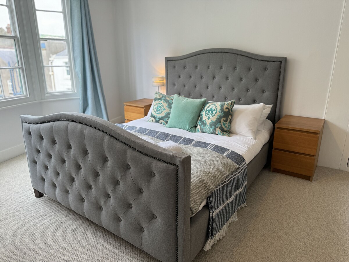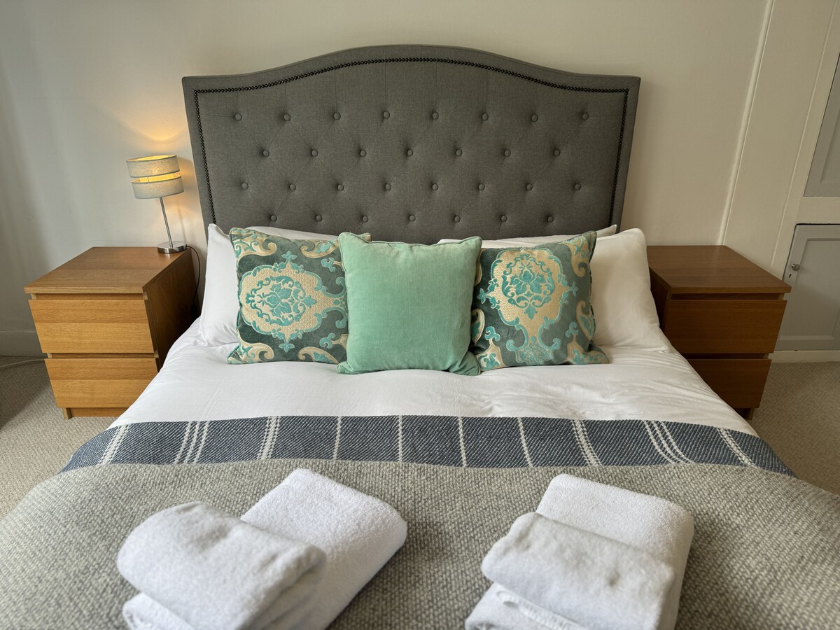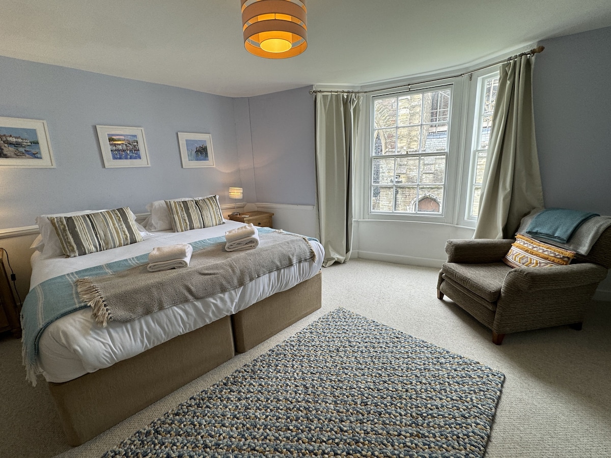 Bedroom One - located on the first floor this large bedroom has a zip and link super- king size bed (6’) that can also be split into two full size single beds if required (we will request your preference on booking) This creates a versatility perfect for a family or groups of friends. The large bay windows of this room overlook one of the towns churches and down to the main High Street. The room contains a built-in wardrobe, bedside tables & lamps and seating and Smart TV.