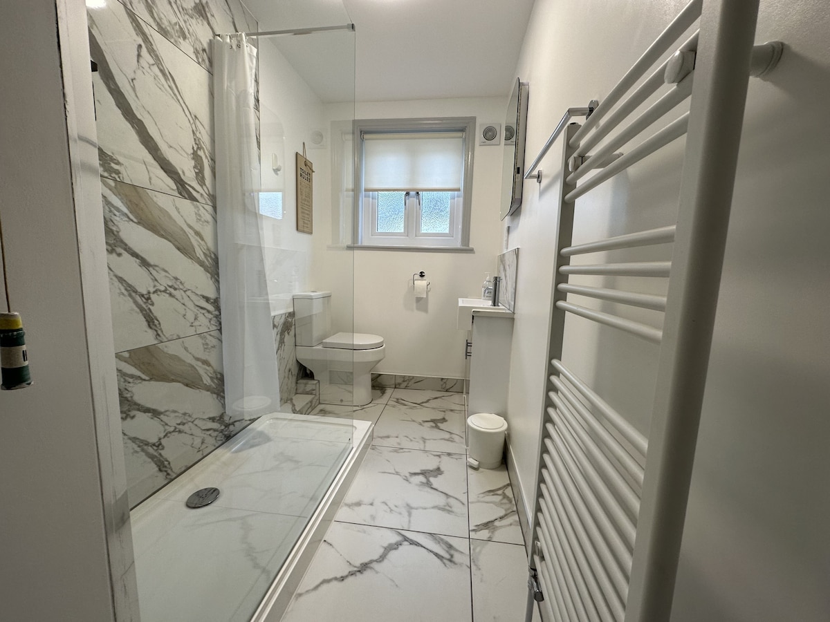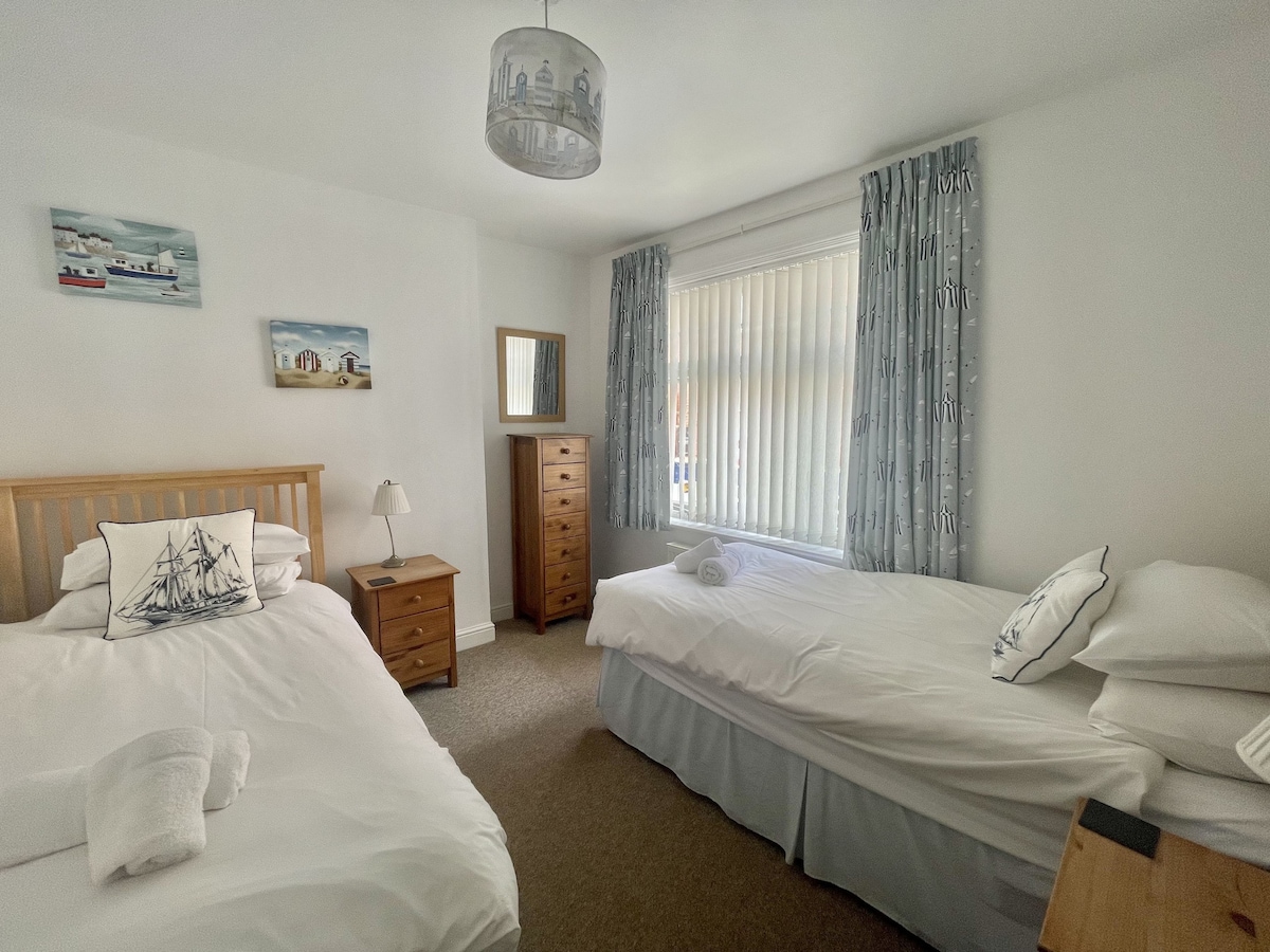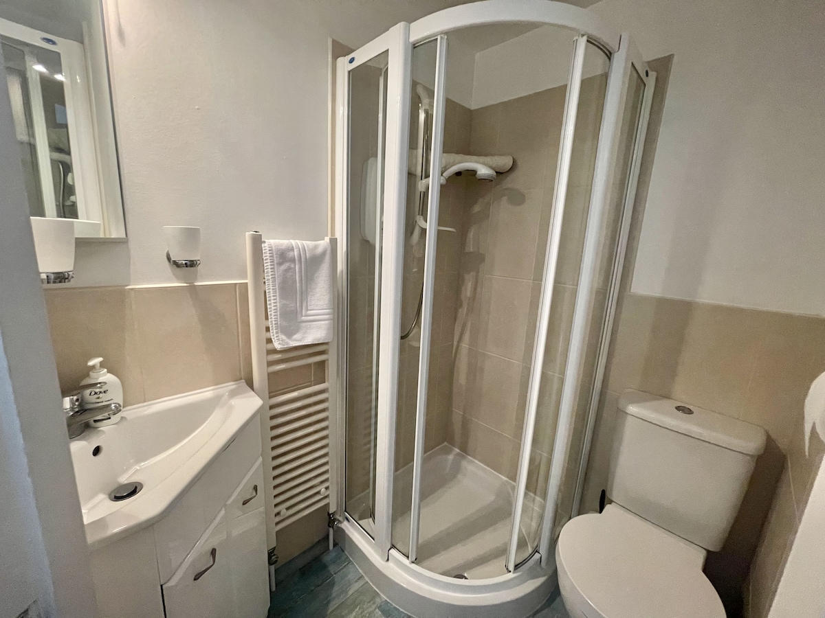There are two bedrooms - an en-suite double room with a shower and WC and a twin bedroom with two single beds. There's also a family bathroom with a large walk-in shower.