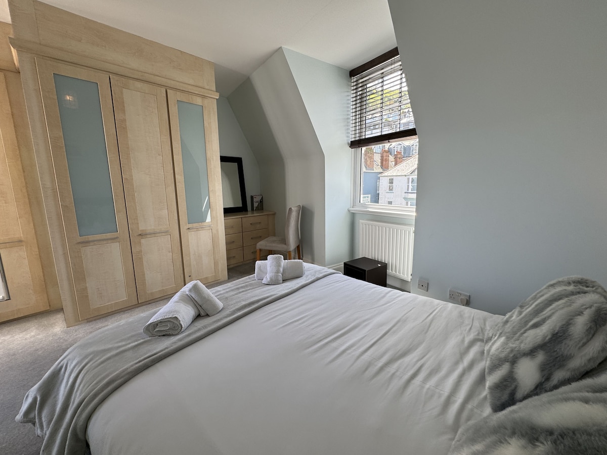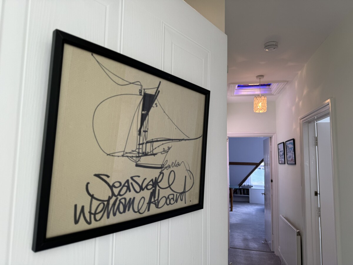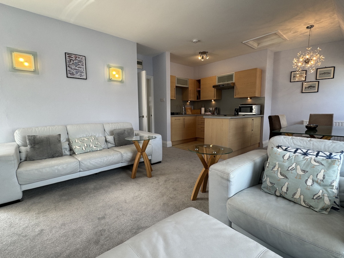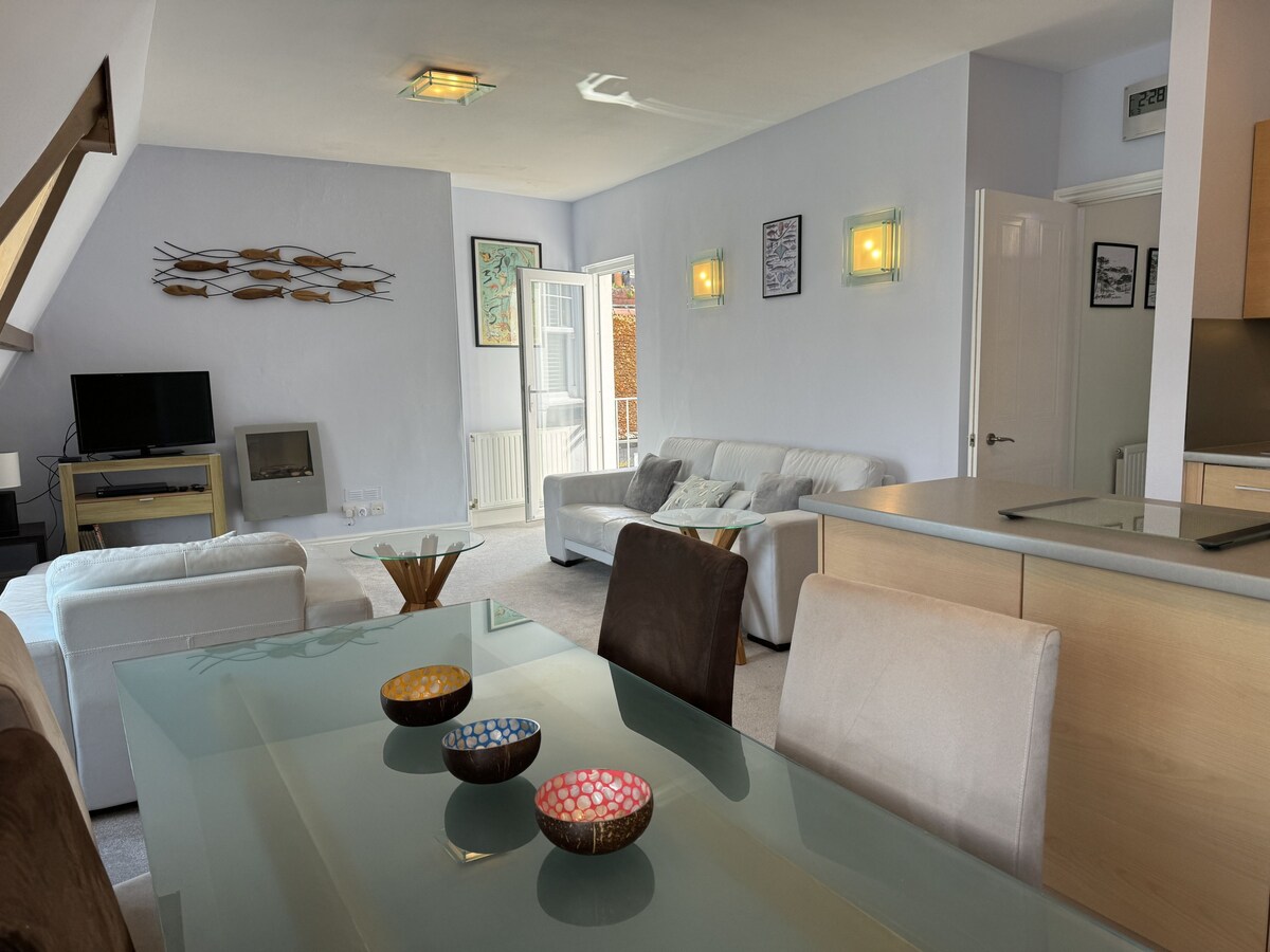 Seascape is accessed via the private parking space on Cole's Court. Enter into the private hallway/utility with washing machine, tumble dryer and freezer as well as space for boots and coats. Continue up to the second floor where you get to the front door.Entering the apartment, the two bedrooms are on the right and the main bathroom and additional WC are off to the left. Straight ahead to the front of the apartment where guest will find the open plan living room cleverly built around the angles of the roof, with exposed timbers and the feature triangular window with views of the river, Kingswear and out to sea.