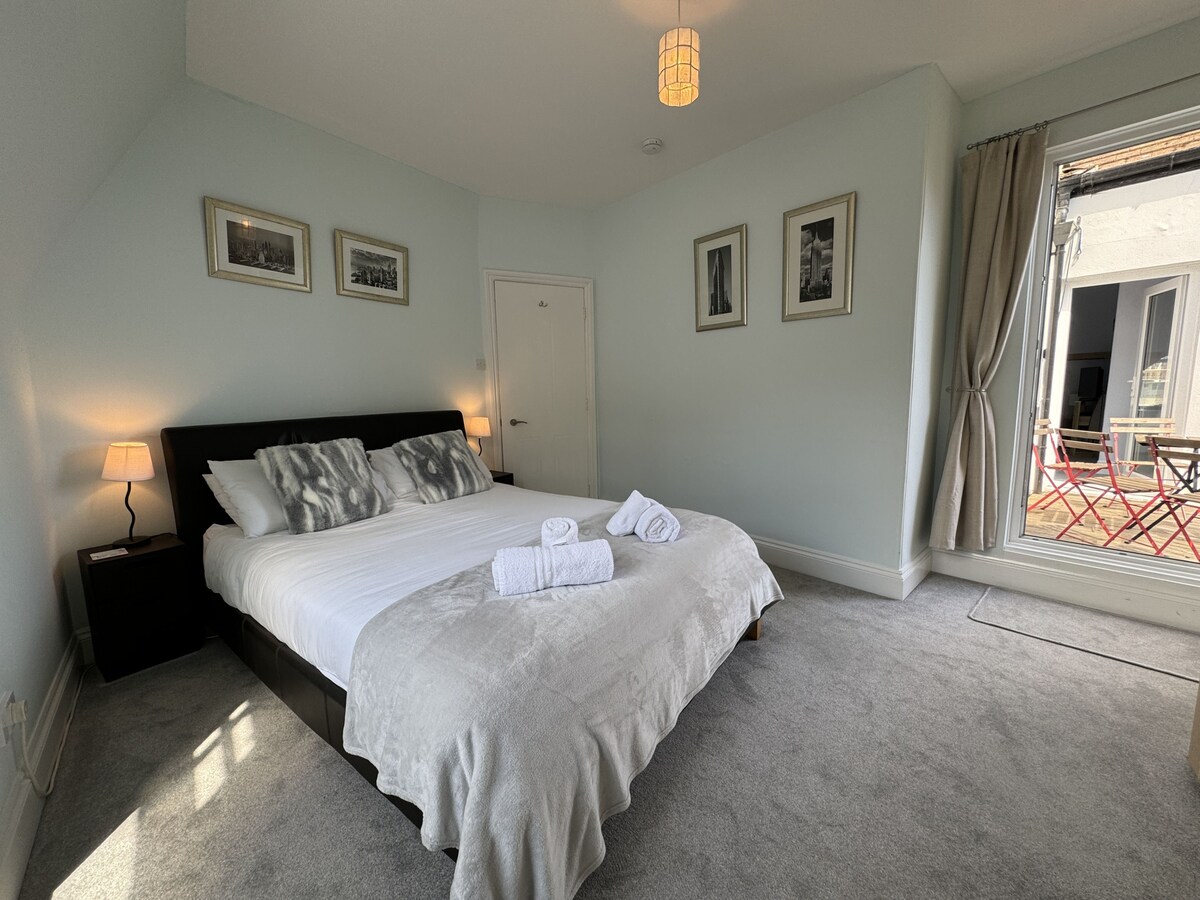 The master bedroom is tastefully furnished with a king size bed, built in wardrobes and dressing table. Patio doors provide access to the balcony and offer river views. The second bedroom has a 4'6" bed and is furnished with bedside tables, wardrobe, chest of drawers and river glimpses.