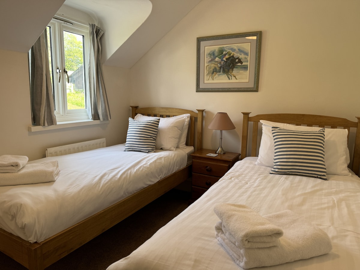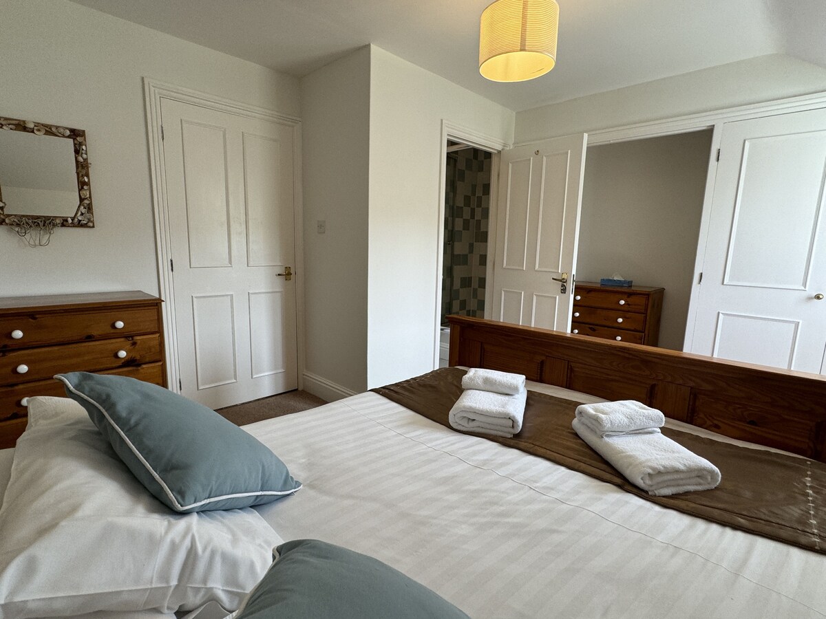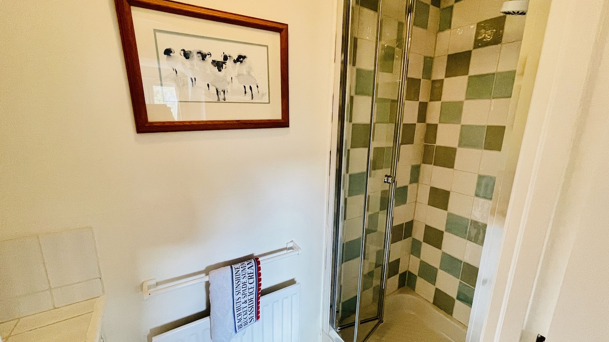 Upstairs there are two bedrooms - the light and airy master bedroom looks out over the orchard towards the village and a twin room at the front. It features a kingsize bed, a built-in wardrobe, and an en-suite shower room. The twin bedroom also has a built-in wardrobe. There is also a recently refurbished family bathroom featuring a bath with an electric overhead shower.