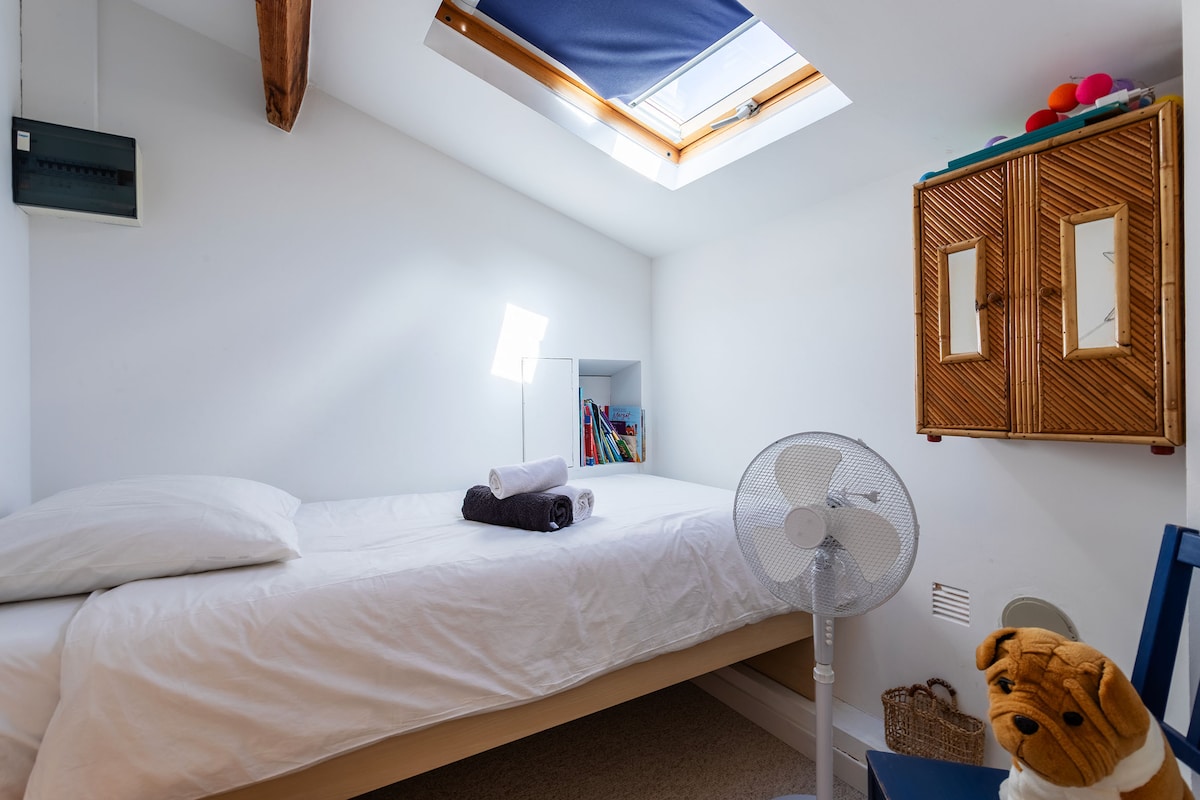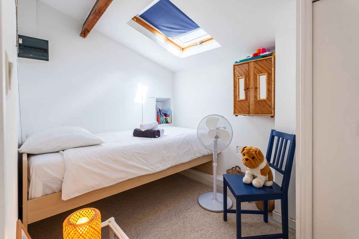 The third bedroom also located on the upper floor offering a single 80 x 190 bed, as well as an additional single mattress (80 x 190) which can be used for a child. It also offers storage and has a skylight.•