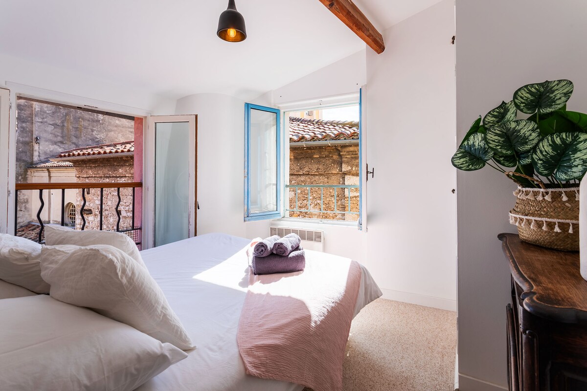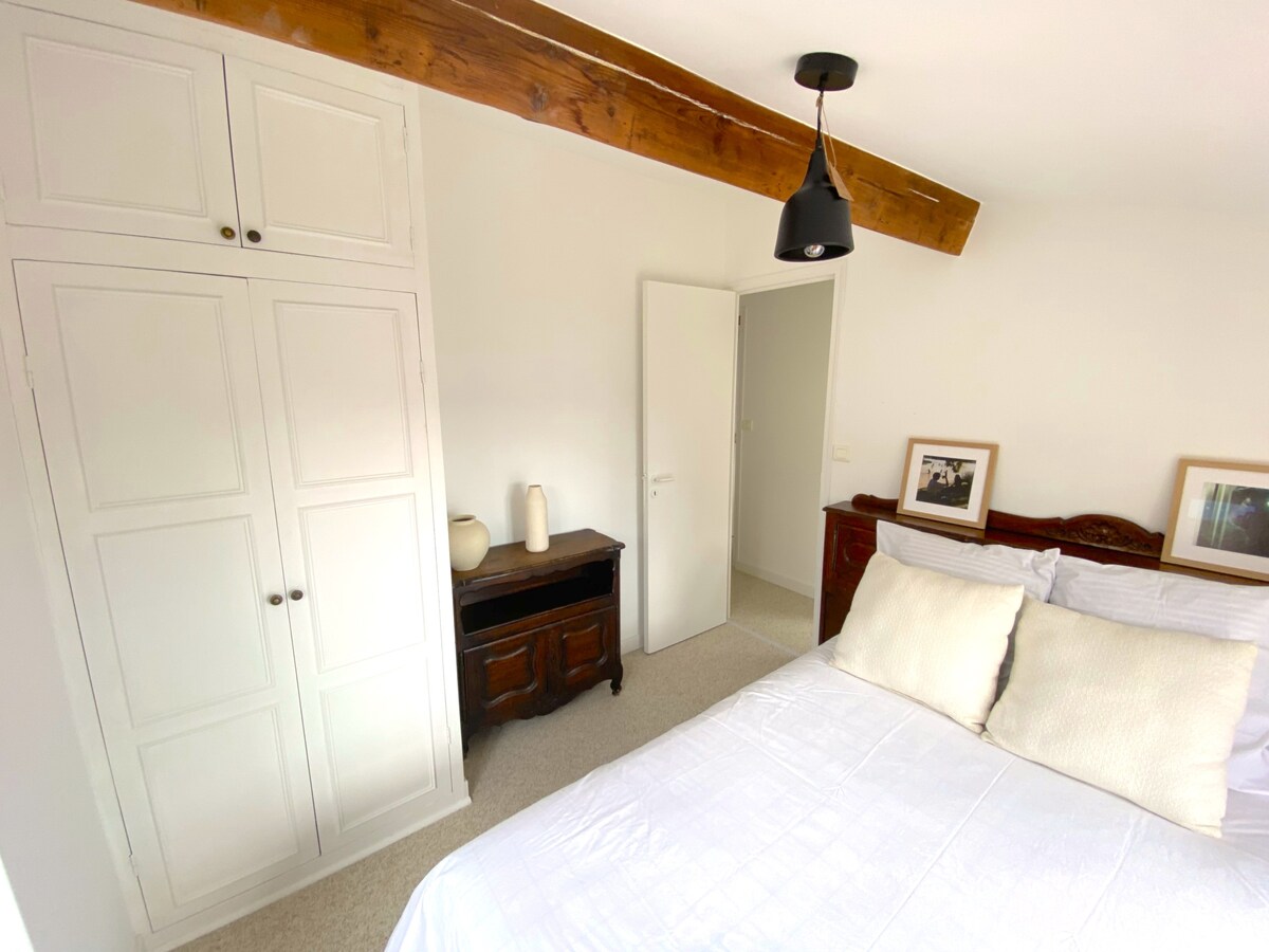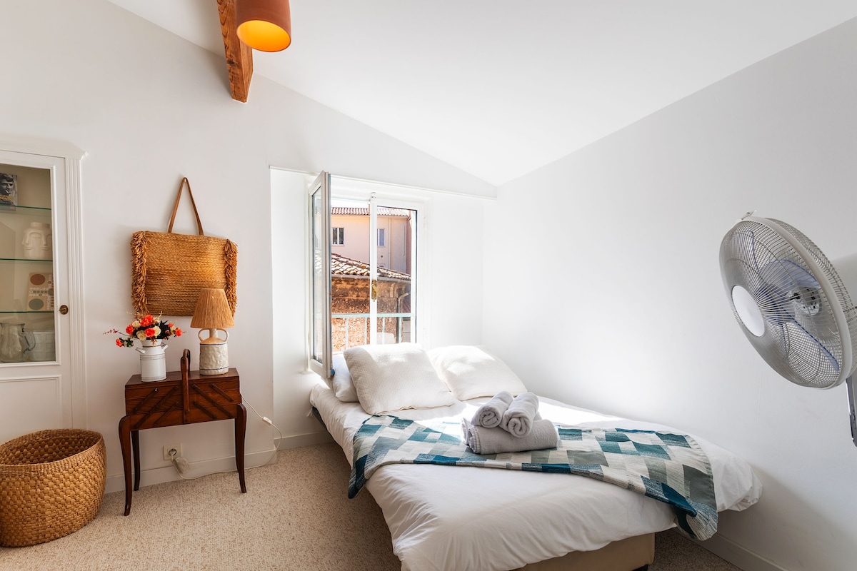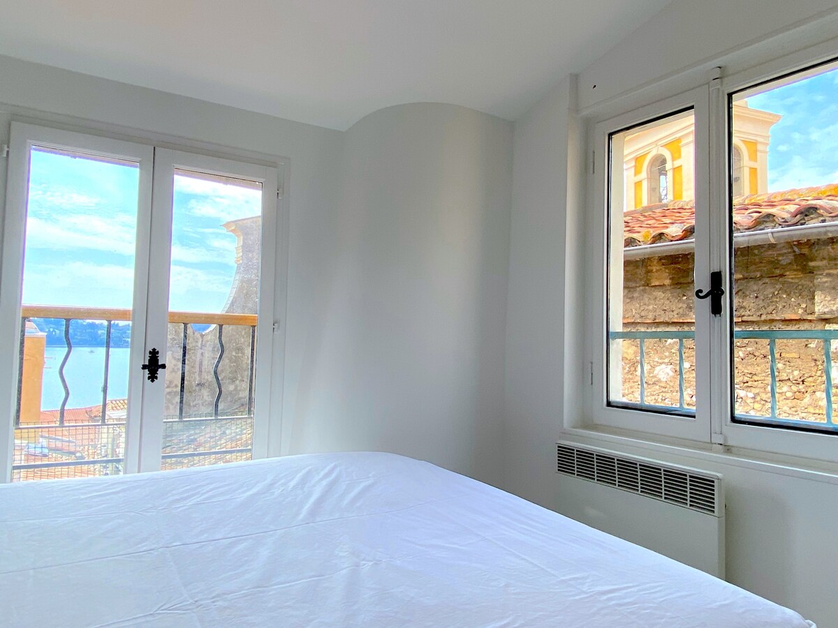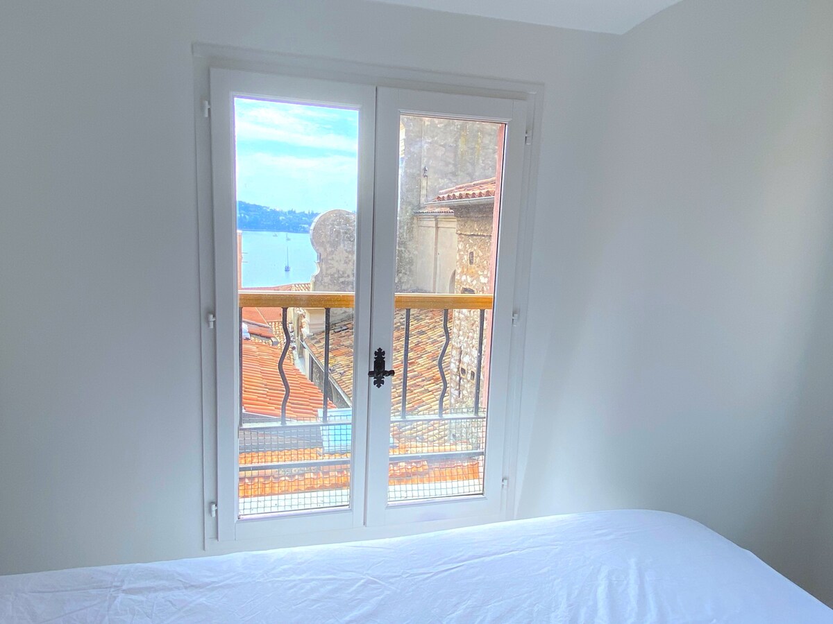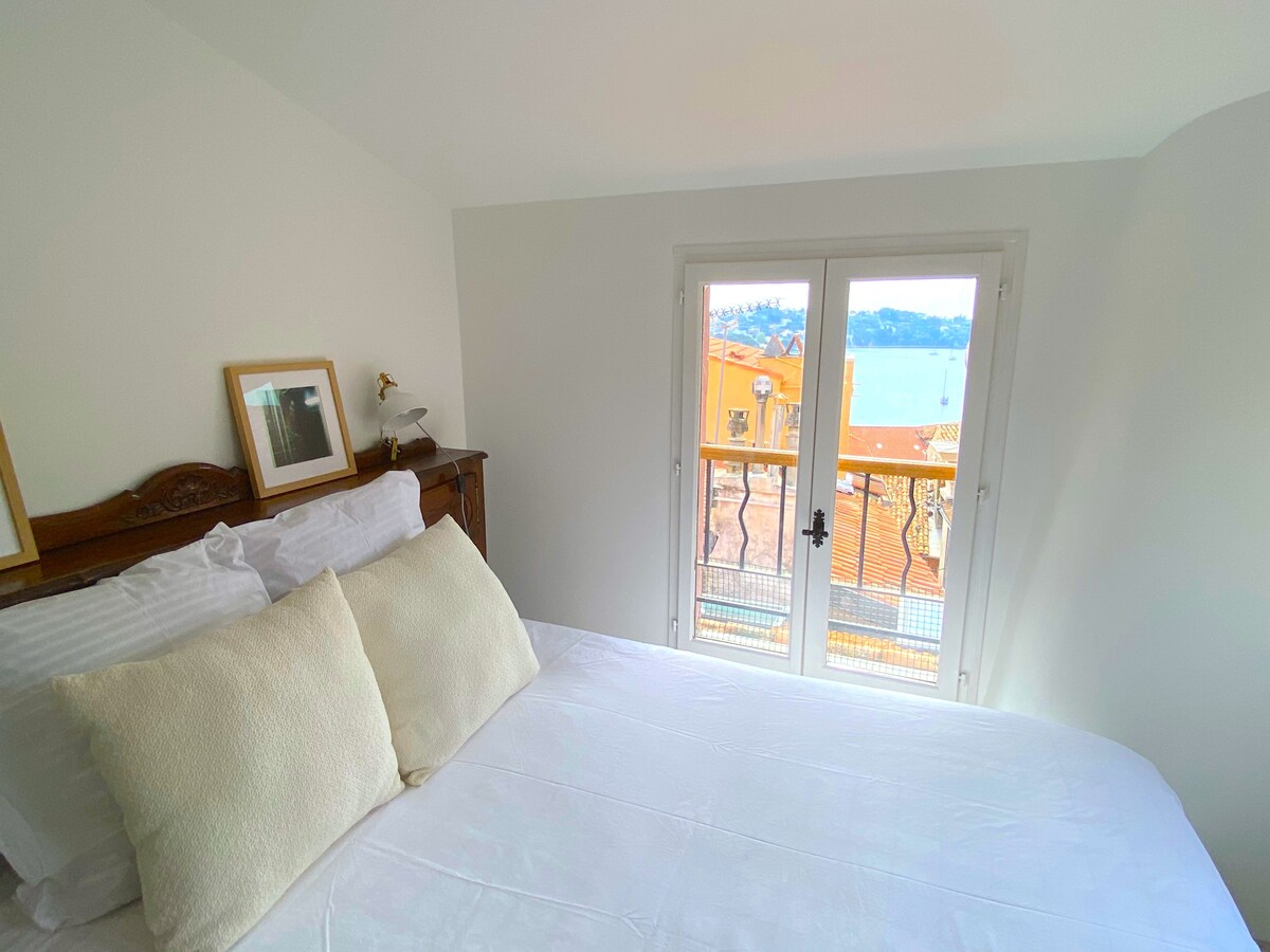 The second bedroom also located on the upper floor offering a 140 x 190 bed, bedside tables and storage. Two windows also opening onto a quiet street in the old town and offering a very nice sea view.•