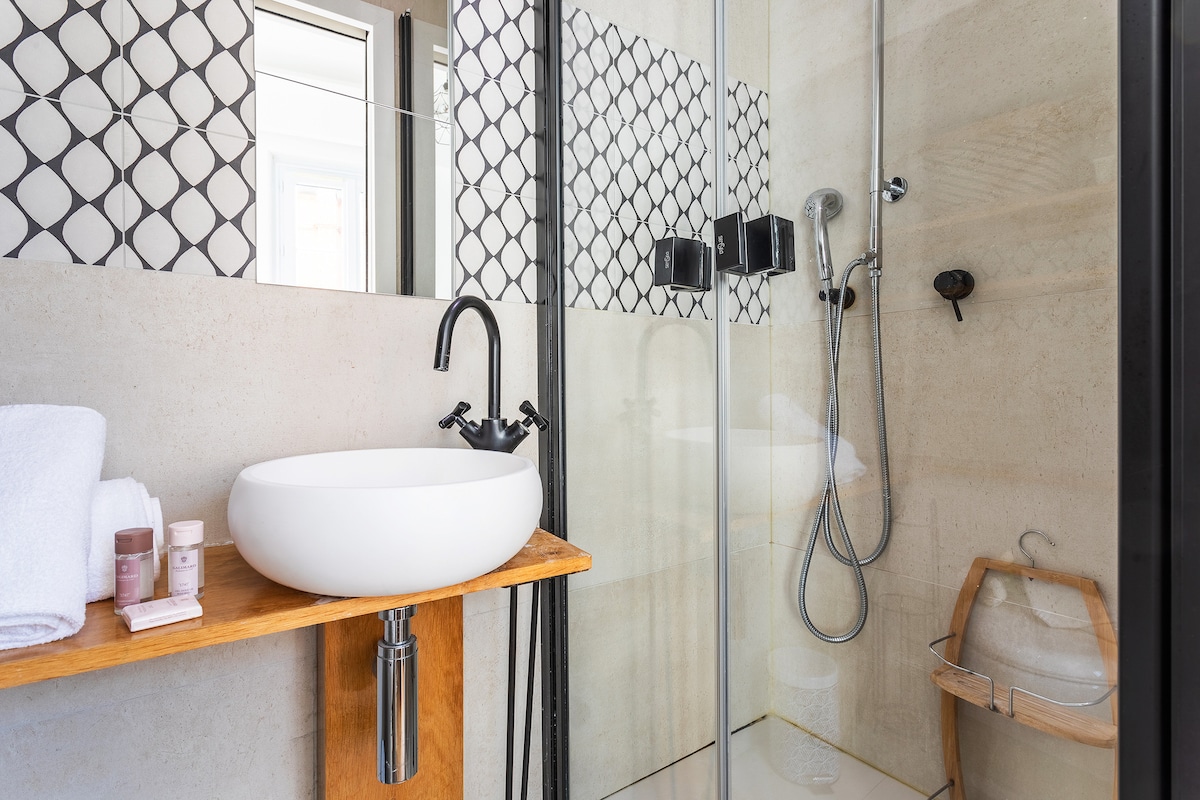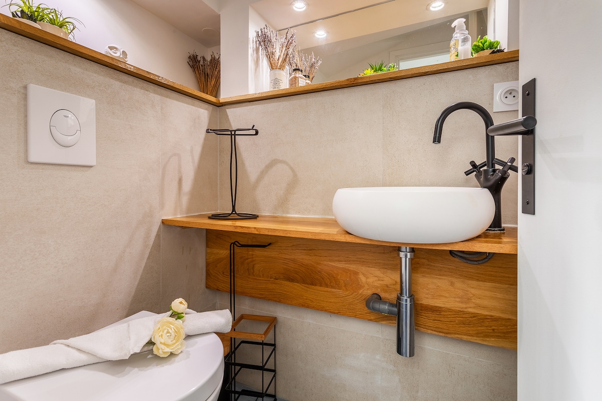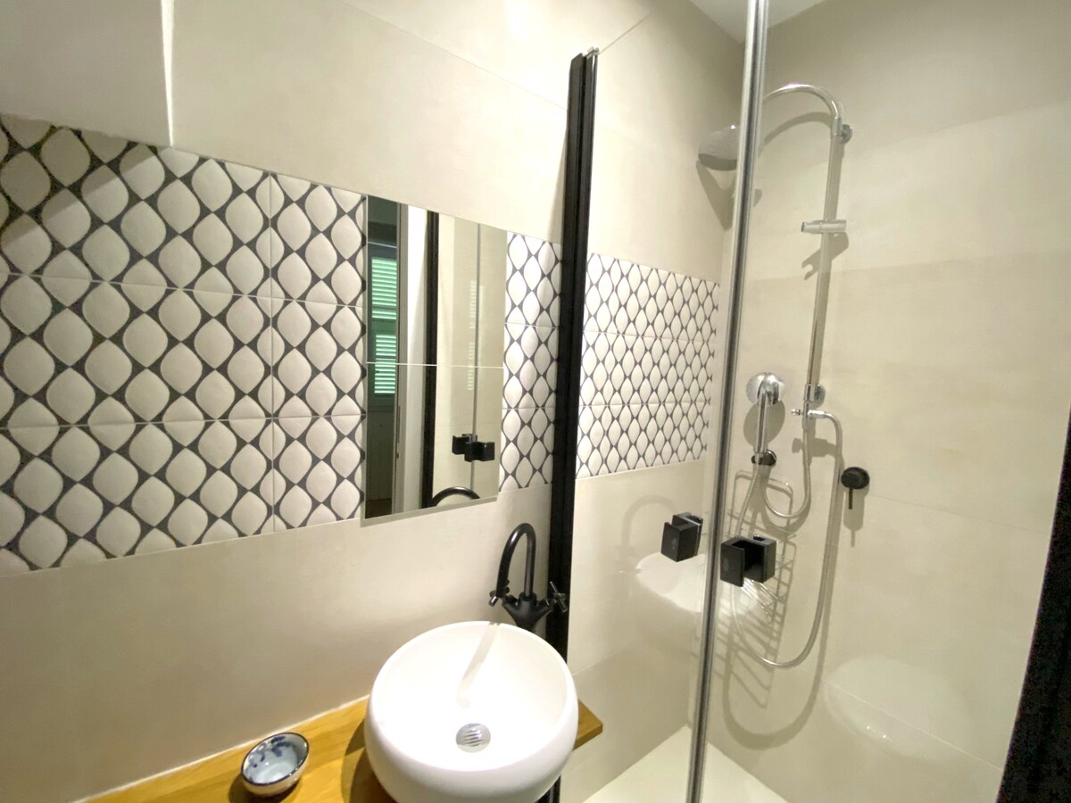 The first bedroom has a 160 x 200cm bed and bedside tables. It has its private bathroom with shower and washbasin as well as a toilet. Windows overlooking a quiet and pedestrian street in the old town.