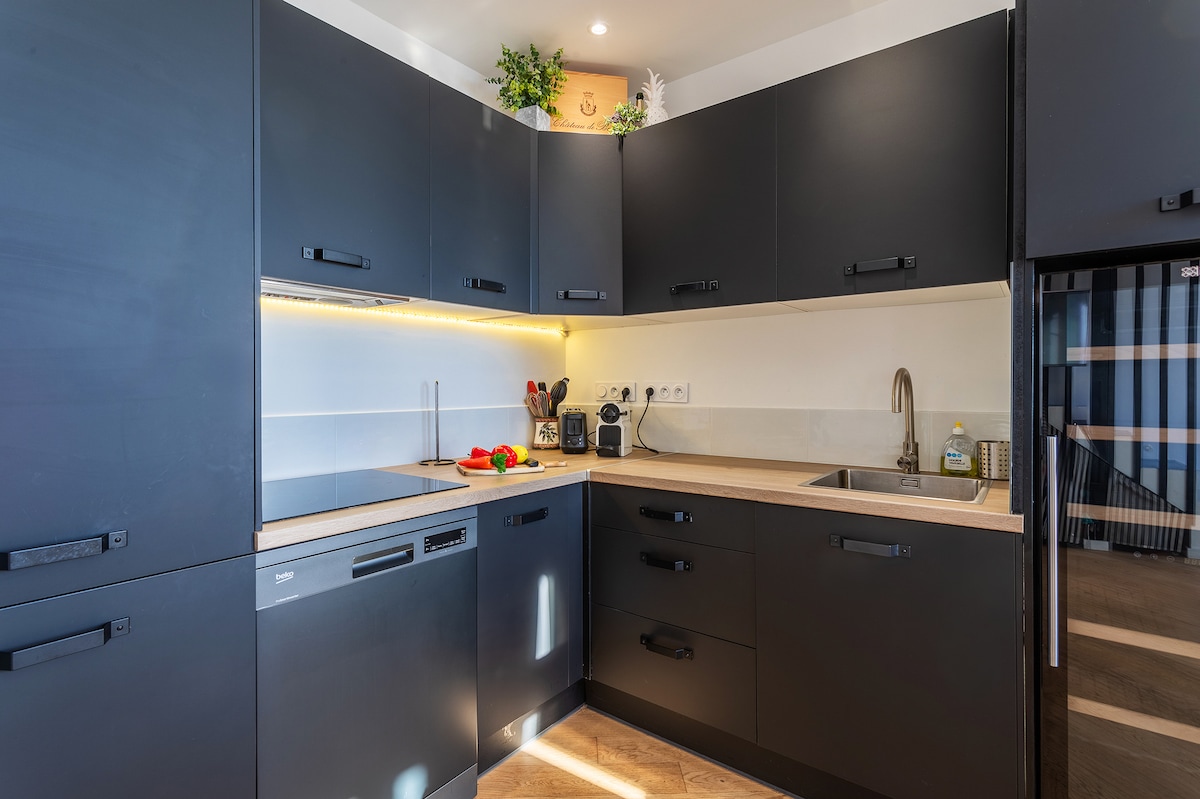 The functional kitchen includes a dishwasher, washing machine, microwave oven, fridge/freezer, wine cooler, cooking plates, extractor hood, kettle, toaster, coffee maker and all necessary items for cooking and eating.